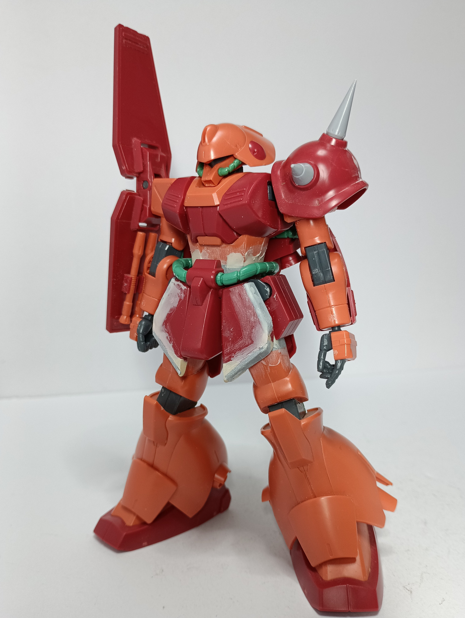 製造途中。主な変更箇所は、首/腰/太ももの延長。フロントアーマーの形状変更。あと肩のスパイクを市販パーツに差し替え、腕の幅詰めを行いました。