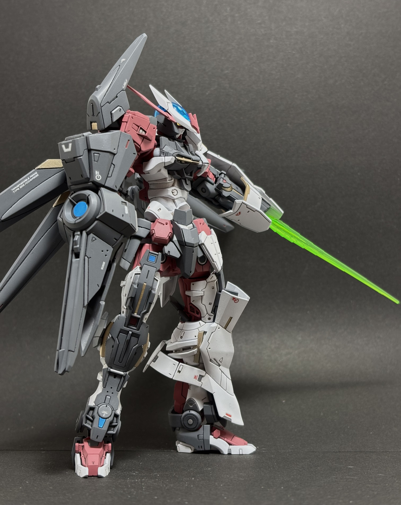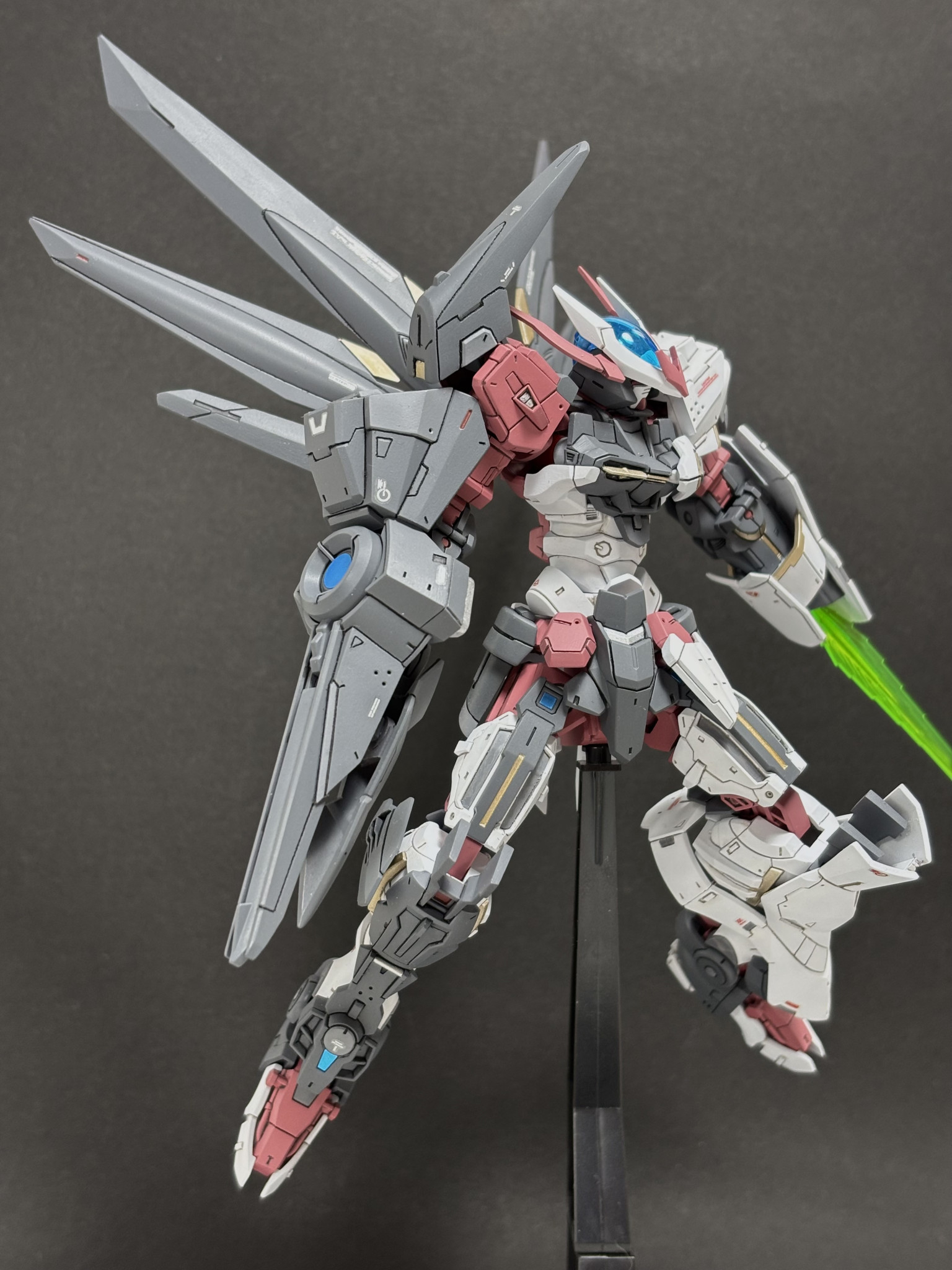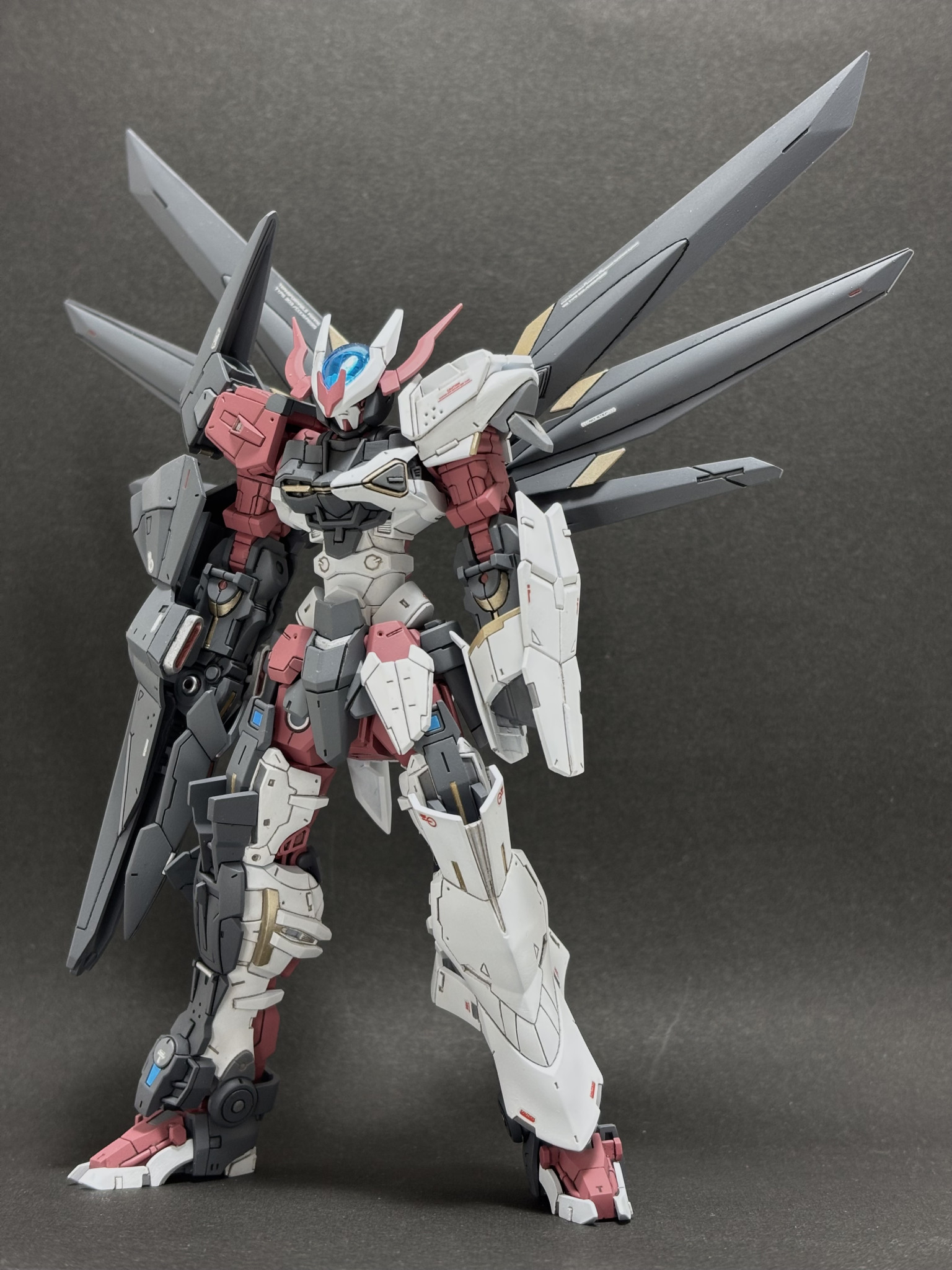 ▲最初はノーネイムとしてつくってました その頃の一枚です 股間周りや左肩にアストレイの余剰パーツを貼り付けてディテールアップしています 赤いアンテナが短いのは保管中に折れていたからです笑 復活は諦めて短いままそれっぽく整形しました ディテールアップをけっこうしたのと 腹をけっこう延長したり逆に首を縮めたりしてバランスを整えました