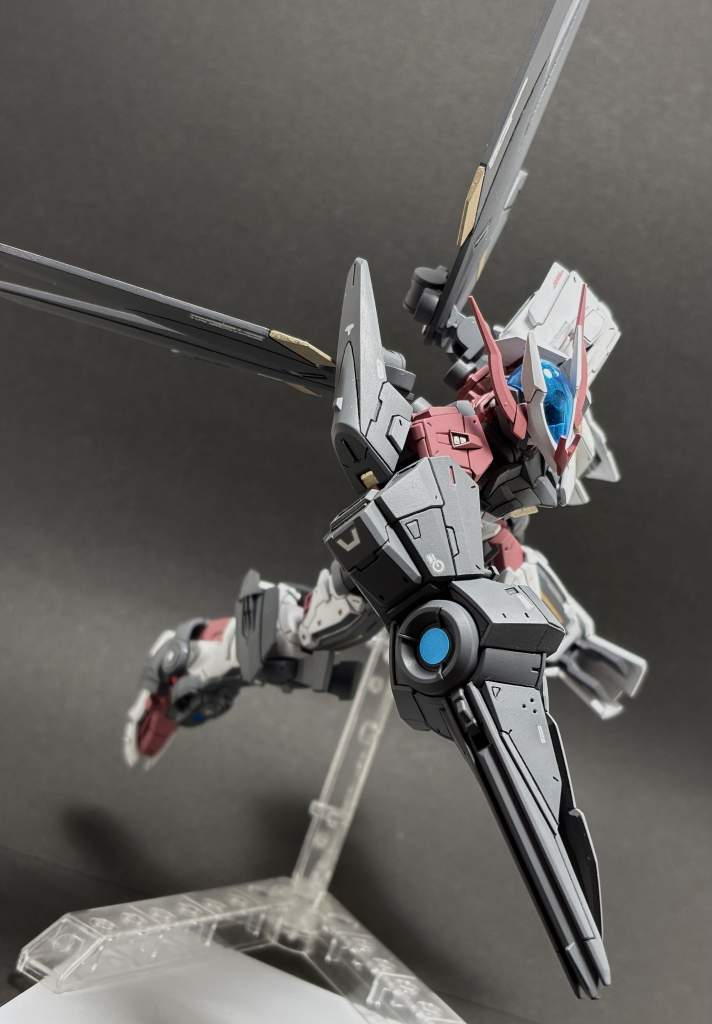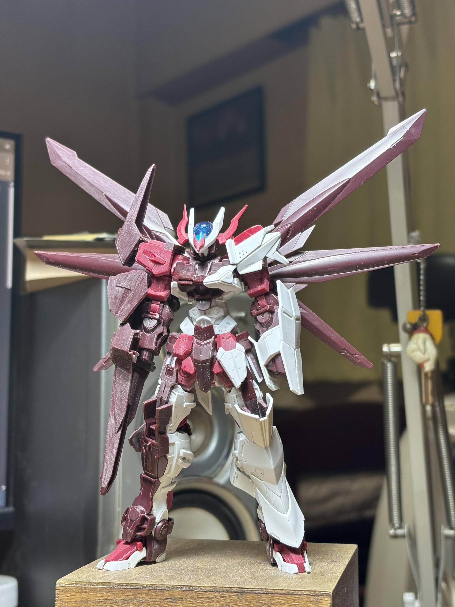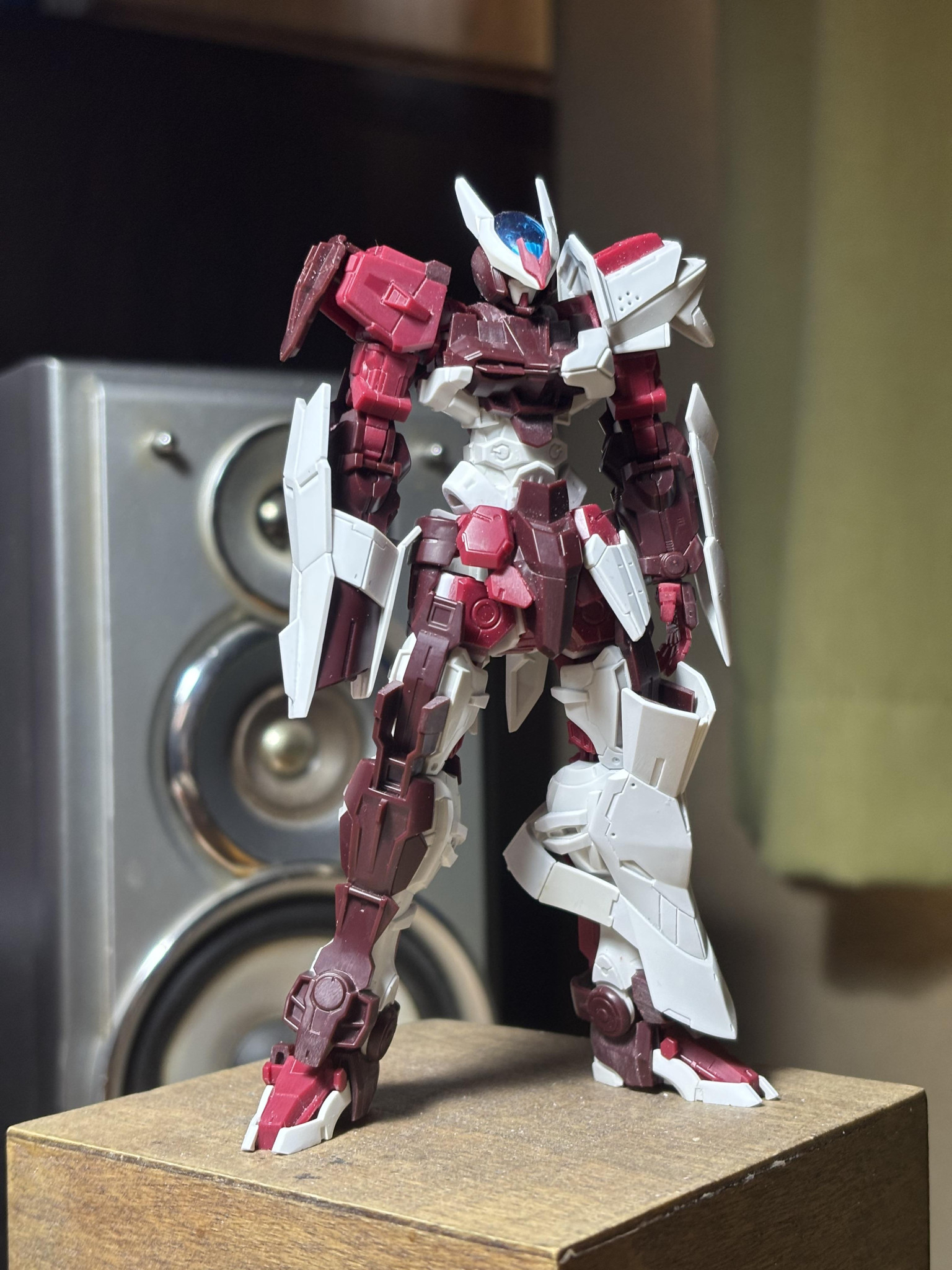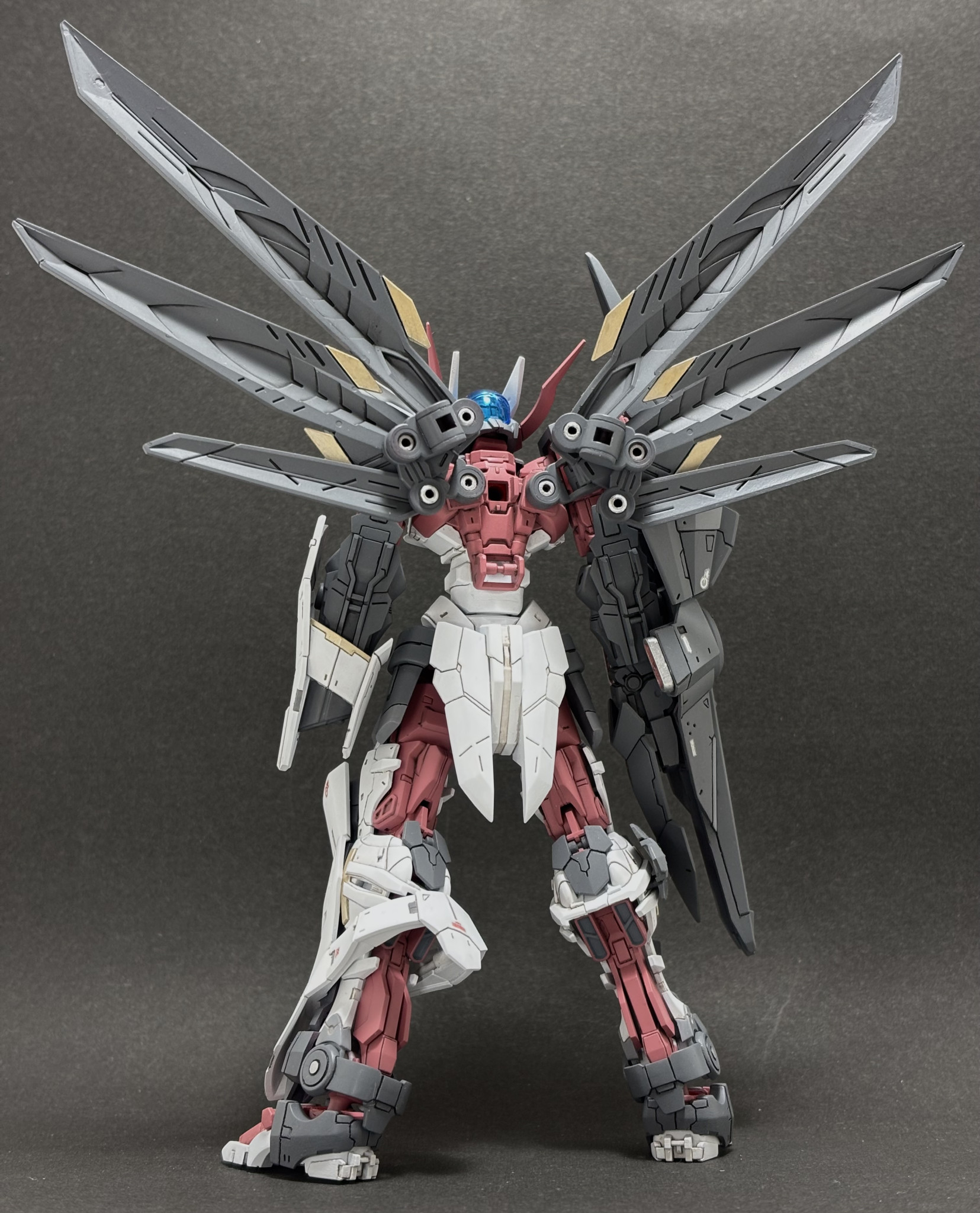 ▲最初はノーネイムとしてつくってました その頃の一枚です 股間周りや左肩にアストレイの余剰パーツを貼り付けてディテールアップしています 赤いアンテナが短いのは保管中に折れていたからです笑 復活は諦めて短いままそれっぽく整形しました ディテールアップをけっこうしたのと 腹をけっこう延長したり逆に首を縮めたりしてバランスを整えました