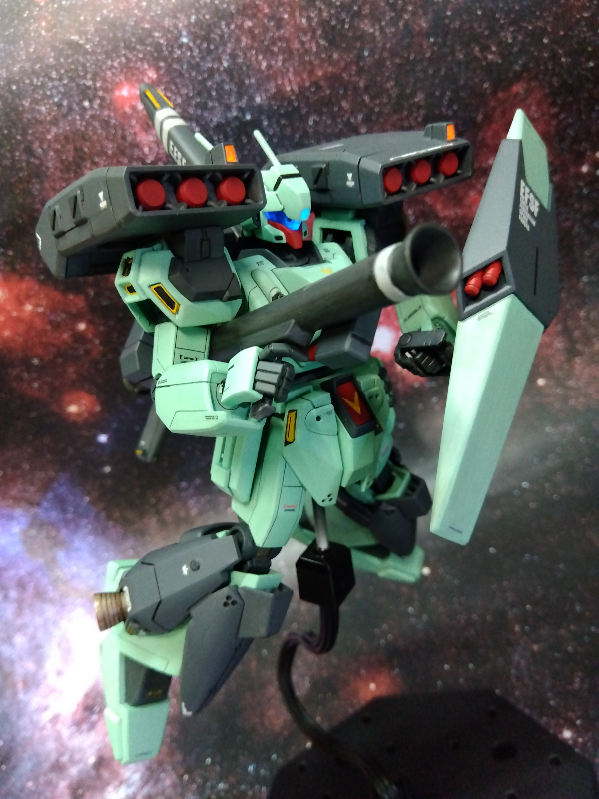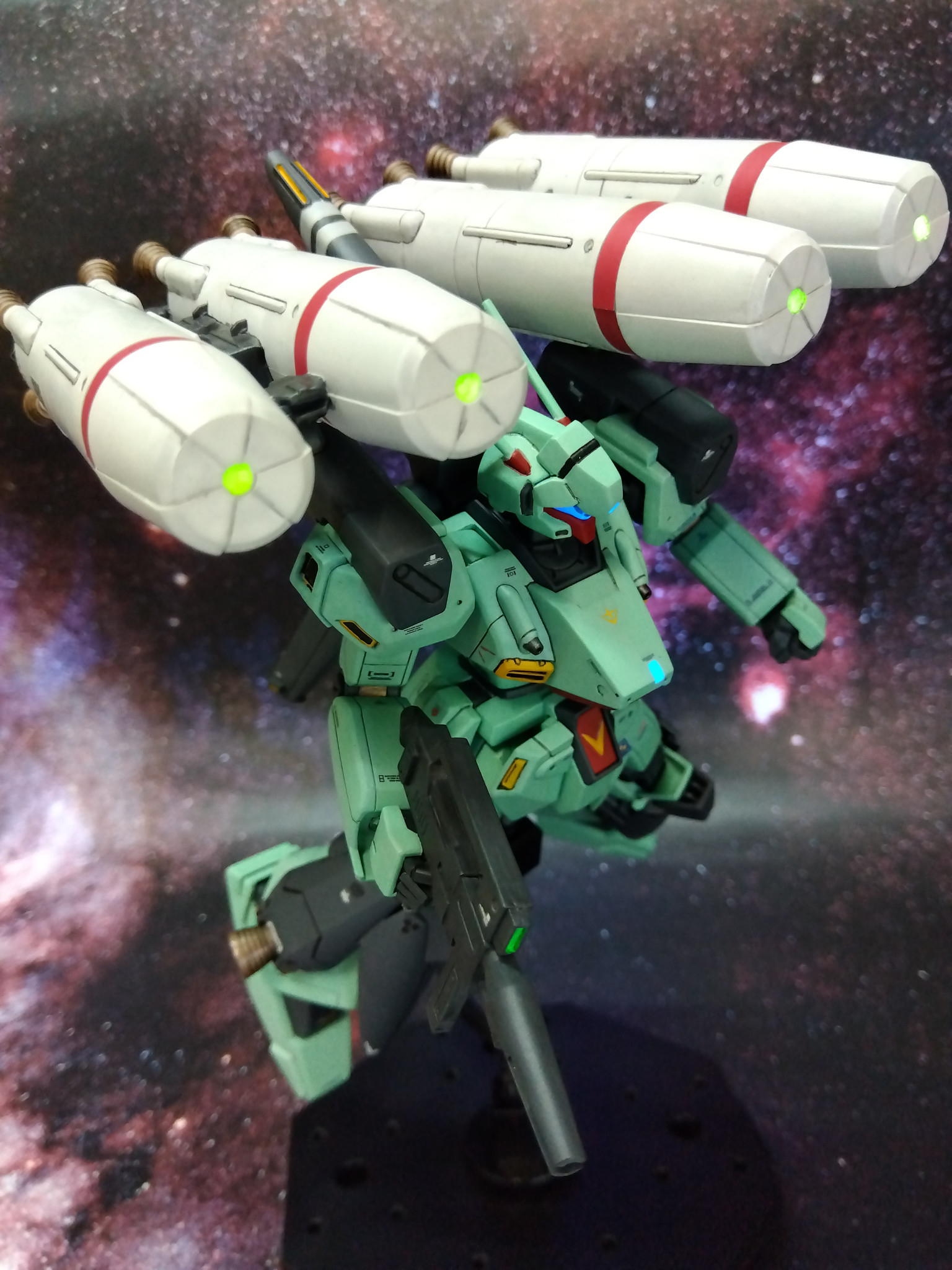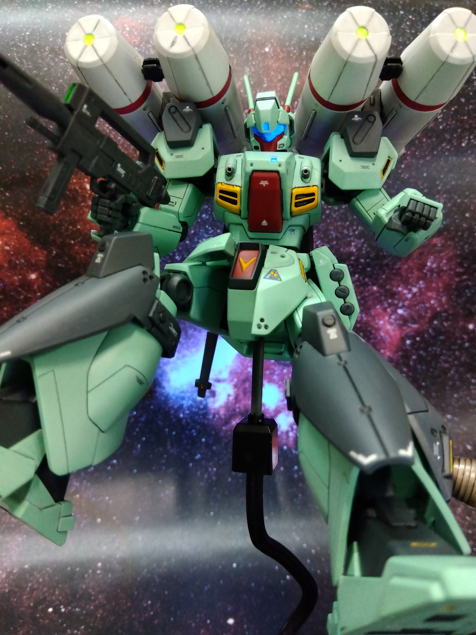 改修箇所は首と腹部の延長、エコーズジェガンと同様に肩を加工、太腿の後を切欠き素の状態よりはハの字が切れる様に、バックパックの左右スラスターをハの字に接着、少々ディテールアップ。センサー類に蛍光カラー、本体はシタデルカラー、ガンマカで筆塗り全塗装しました。