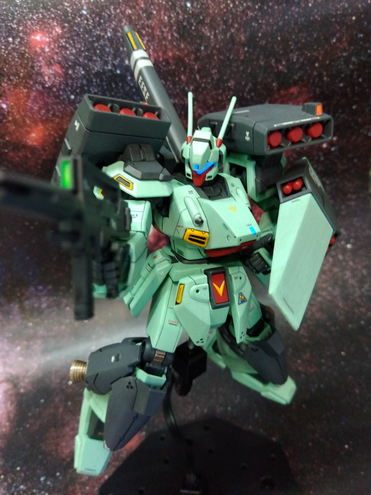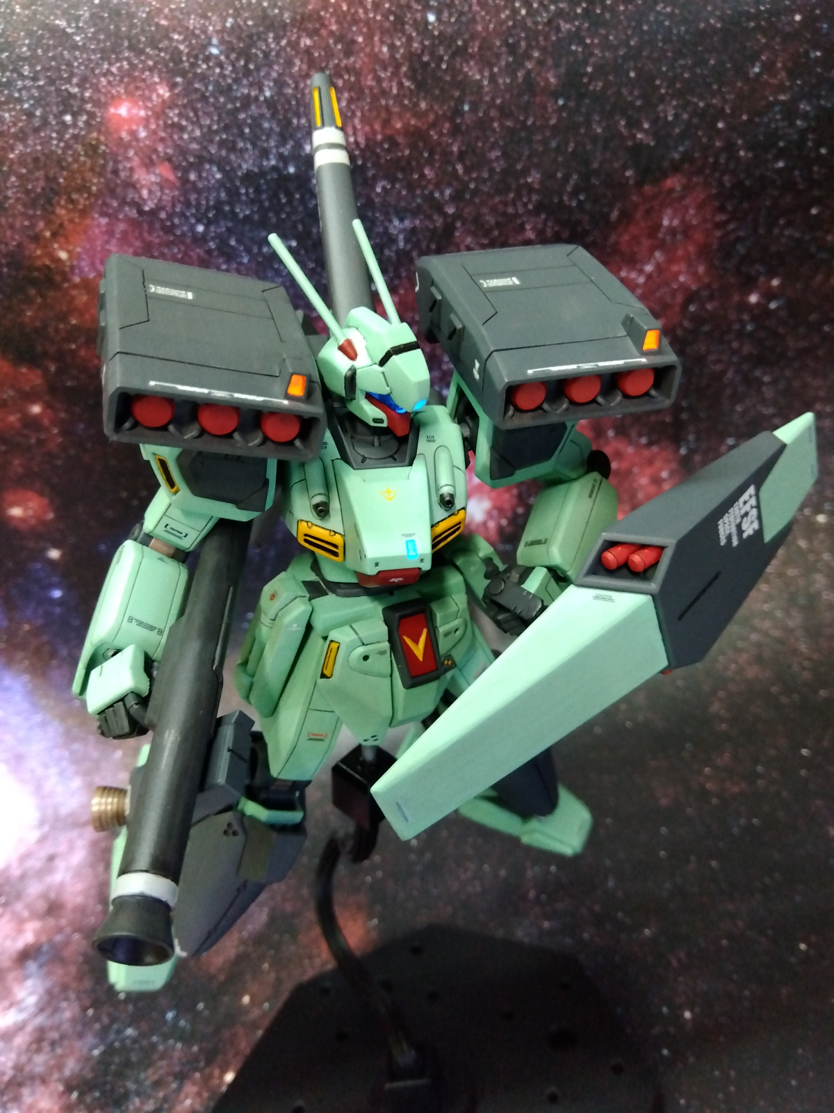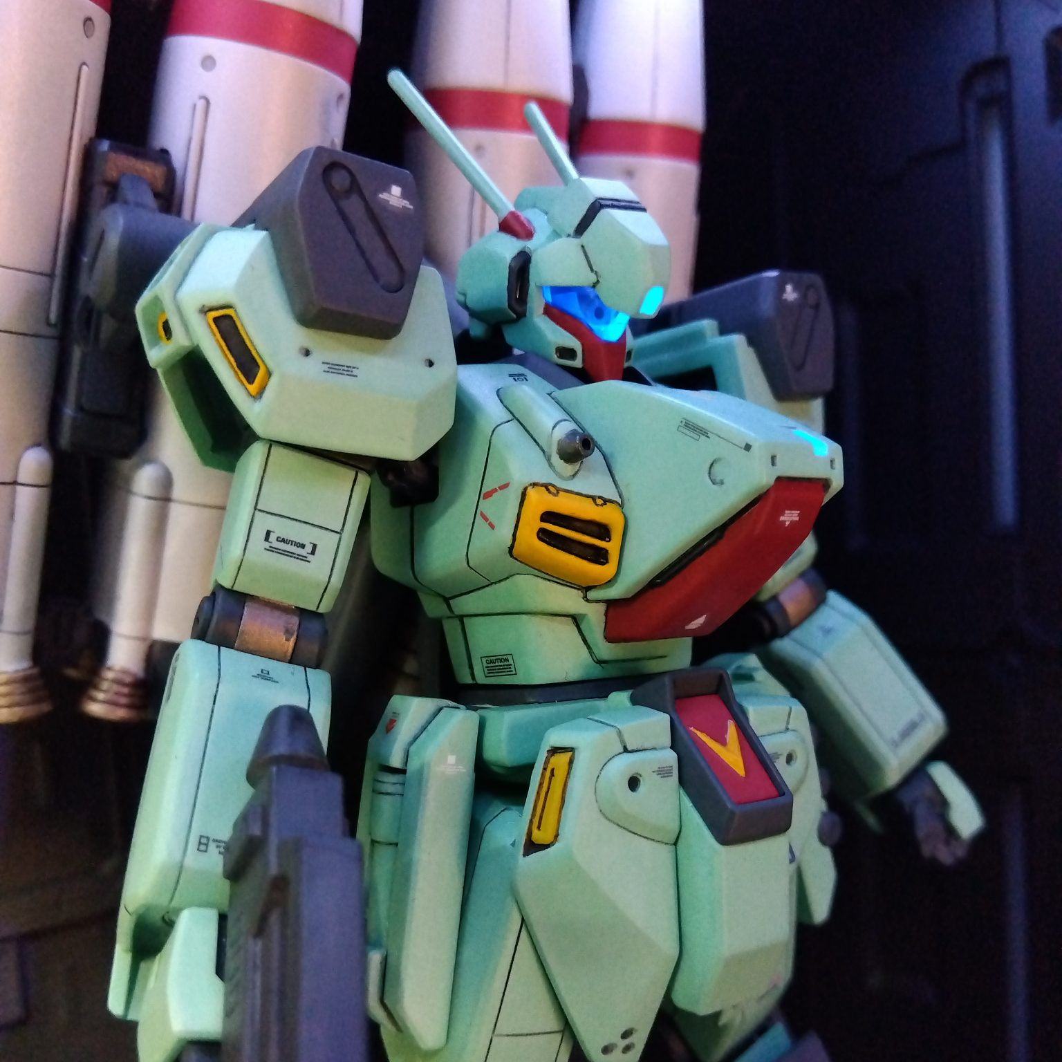 改修箇所は首と腹部の延長、エコーズジェガンと同様に肩を加工、太腿の後を切欠き素の状態よりはハの字が切れる様に、バックパックの左右スラスターをハの字に接着、少々ディテールアップ。センサー類に蛍光カラー、本体はシタデルカラー、ガンマカで筆塗り全塗装しました。