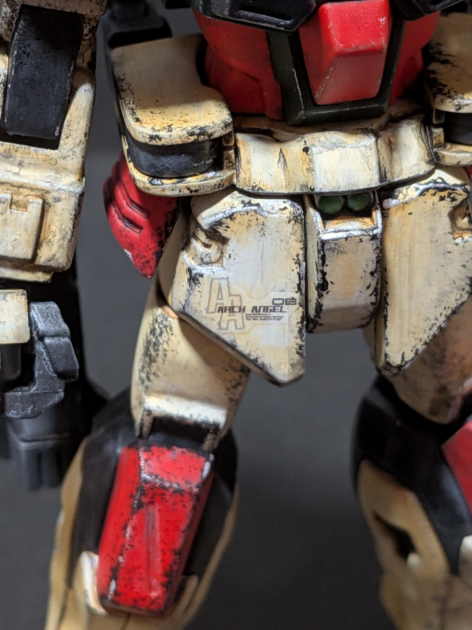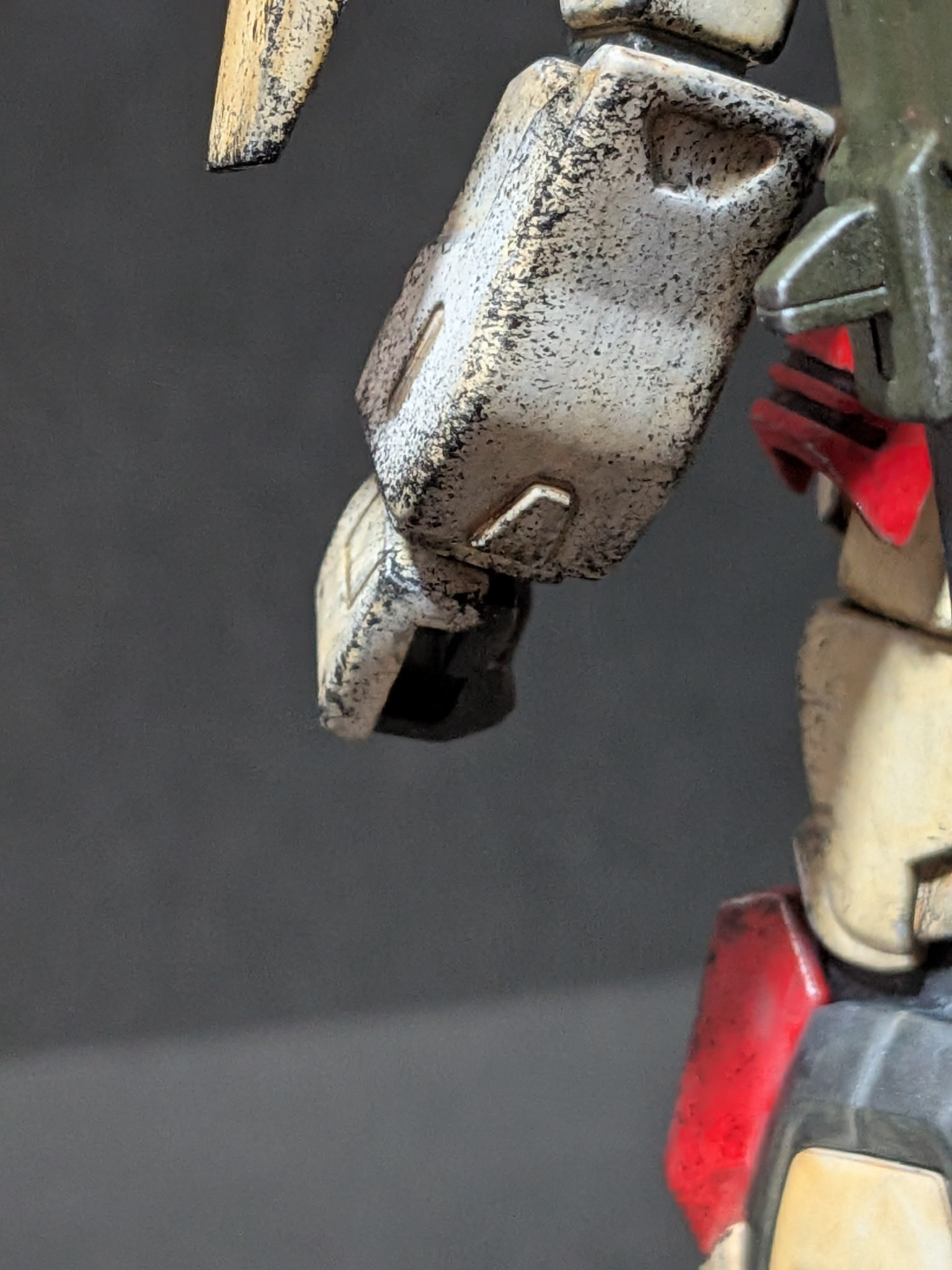 チッピングは今回初めてスポンジチッピングを使ってみました。なかなかコントロールが難しく何回か失敗しましたが肩アーマーの突起部分からコツを掴んできましたが途中からなんか楽しくなり気づいたらやりすぎてましたw;