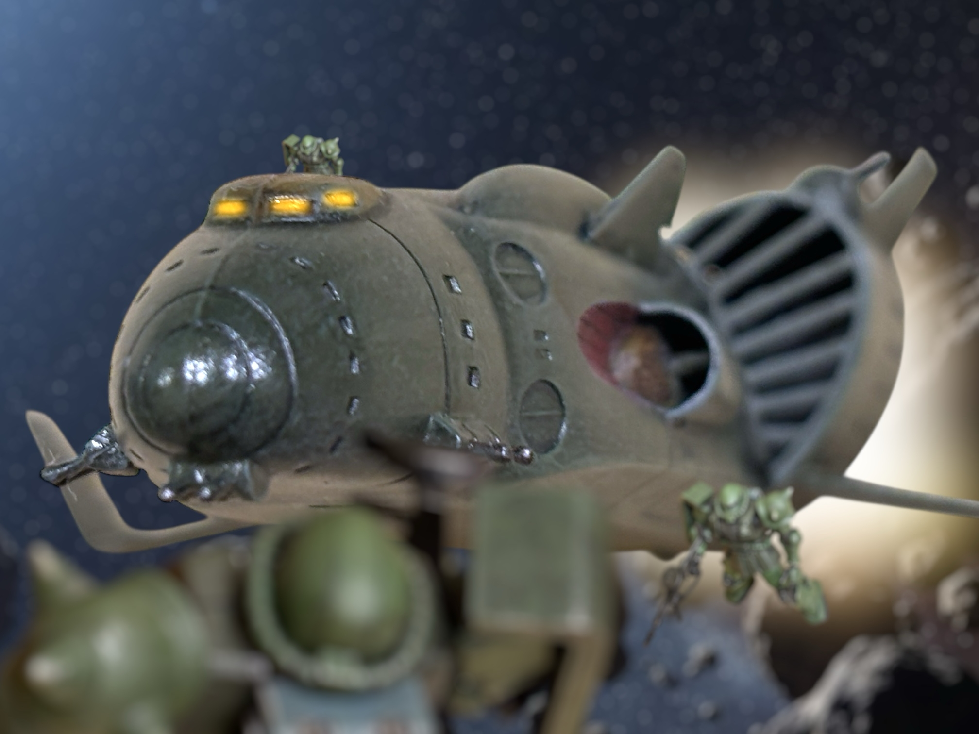 ザンジバルの対空砲火が、火を吹いた。と、同時に、艦の下方から、ザクが2機、ぬっと顔を出す。