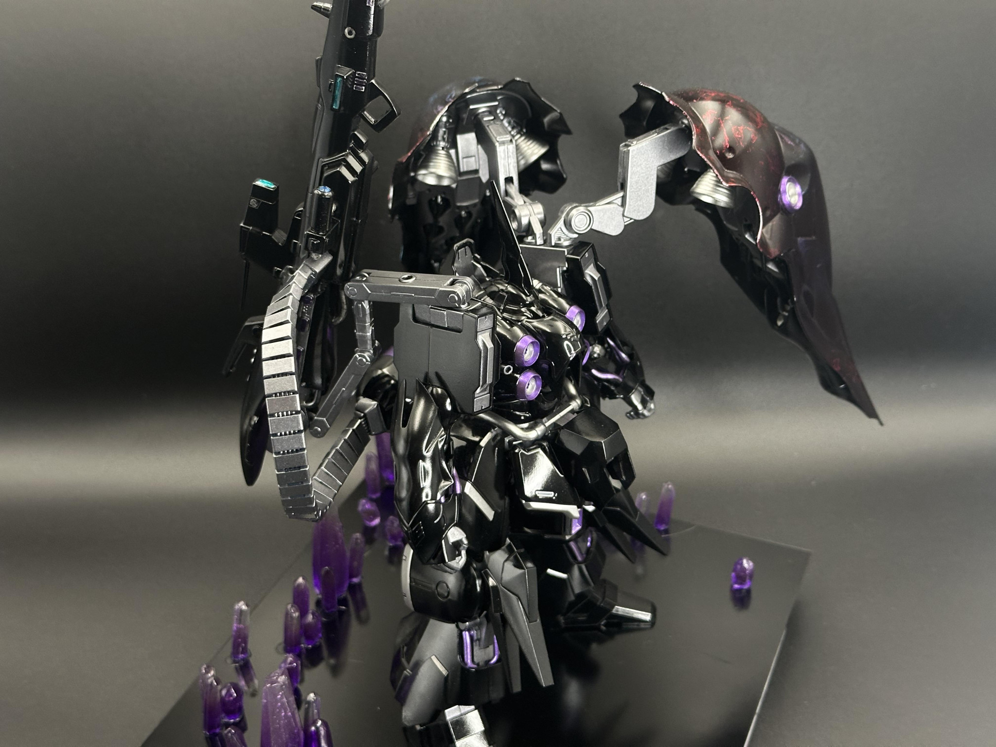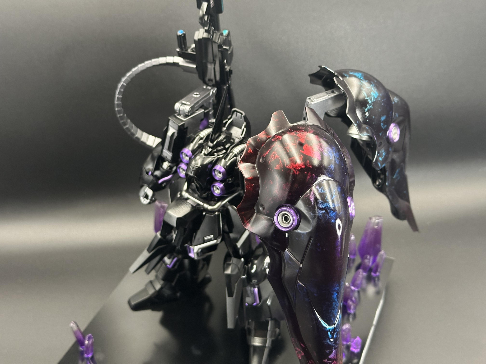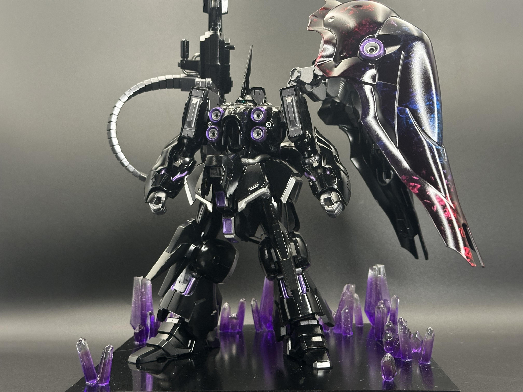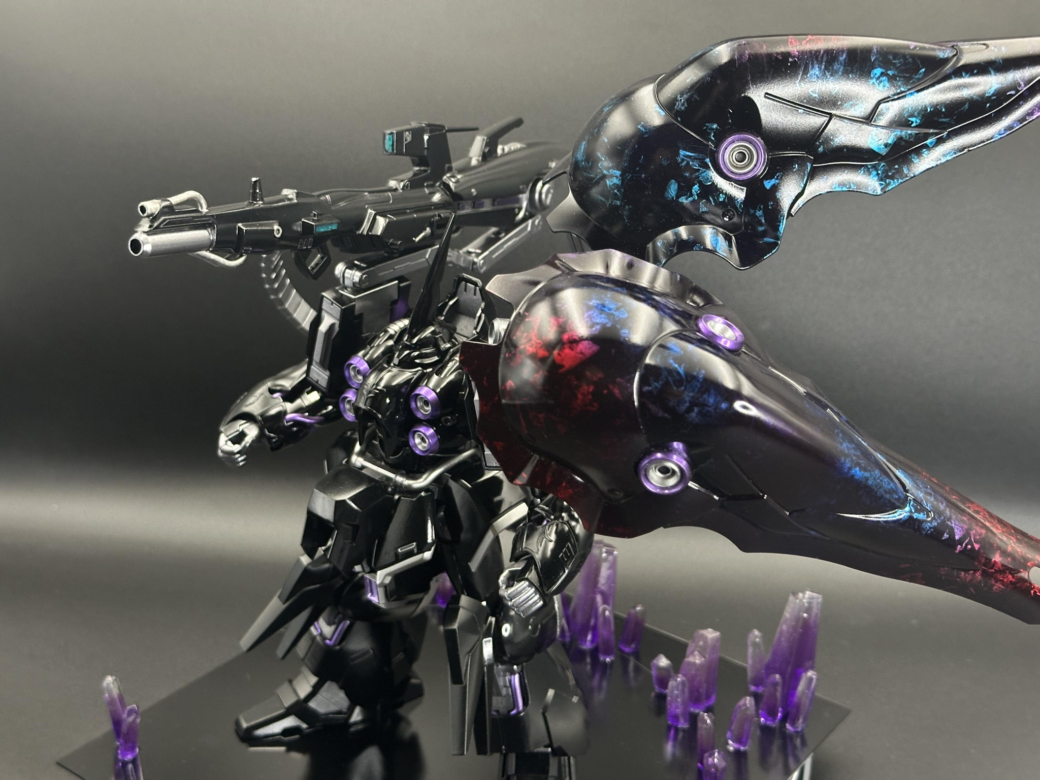 漆黒の機体に、赤と青のラップグラデ塗装仕上げが素晴らしいですね😆 ハイパーメガカノン装備のアシンメトリーな造形も魅力的ですね👍