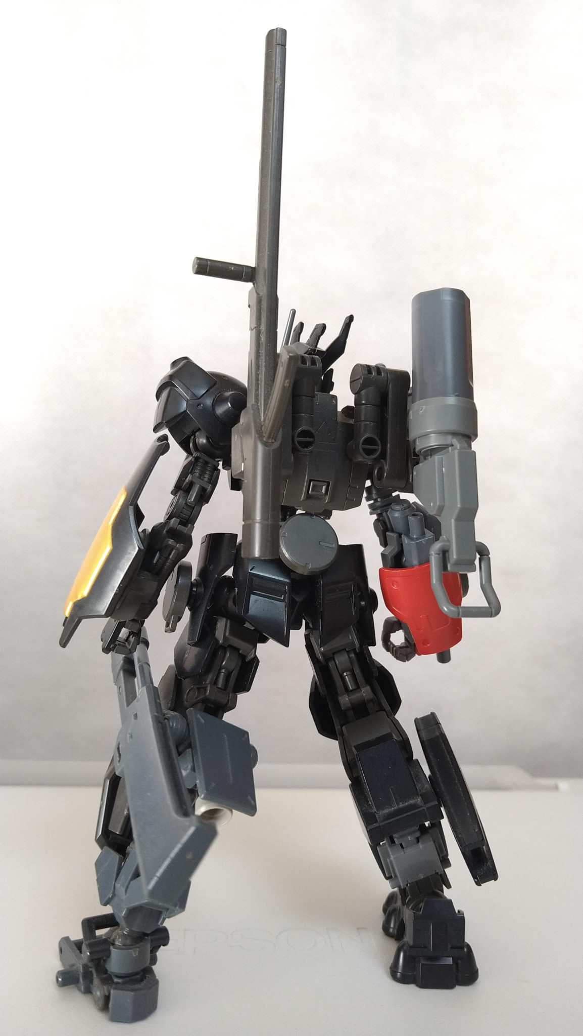 右腕、左脚ほか複数は武装類を内蔵する補修パーツに置き換えています。それぞれ肩部にはナイフ2基、腕部には上腕部の換装機構とビームサーベル、120mmマシンガンを装備。