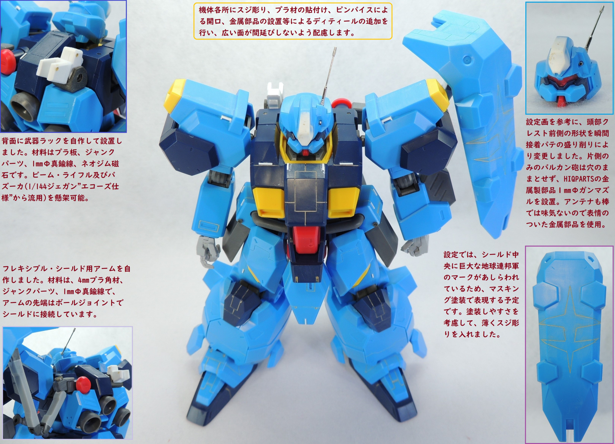 武器ラックにはビーム・ライフル及びバズーカを装着できます。バズーカはジェガン(エコーズ仕様)から流用しました。フレキシブル・シールド用アームは、先端がボールジョイント接続で自由に可動します。