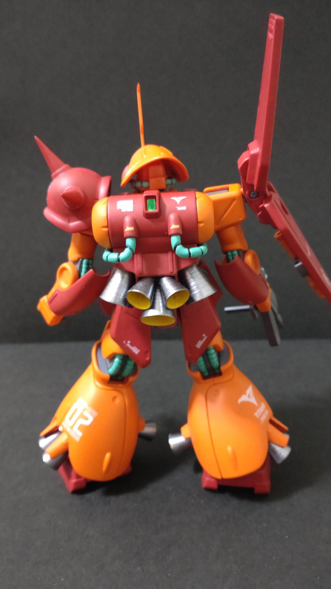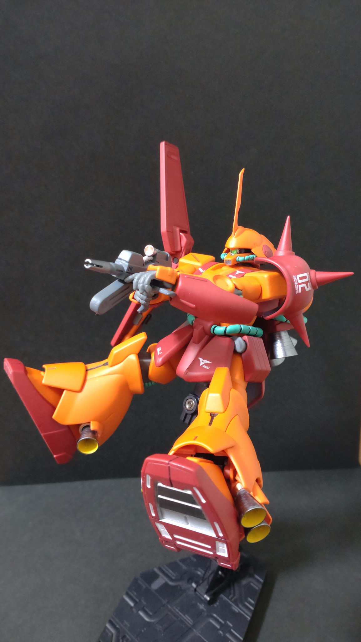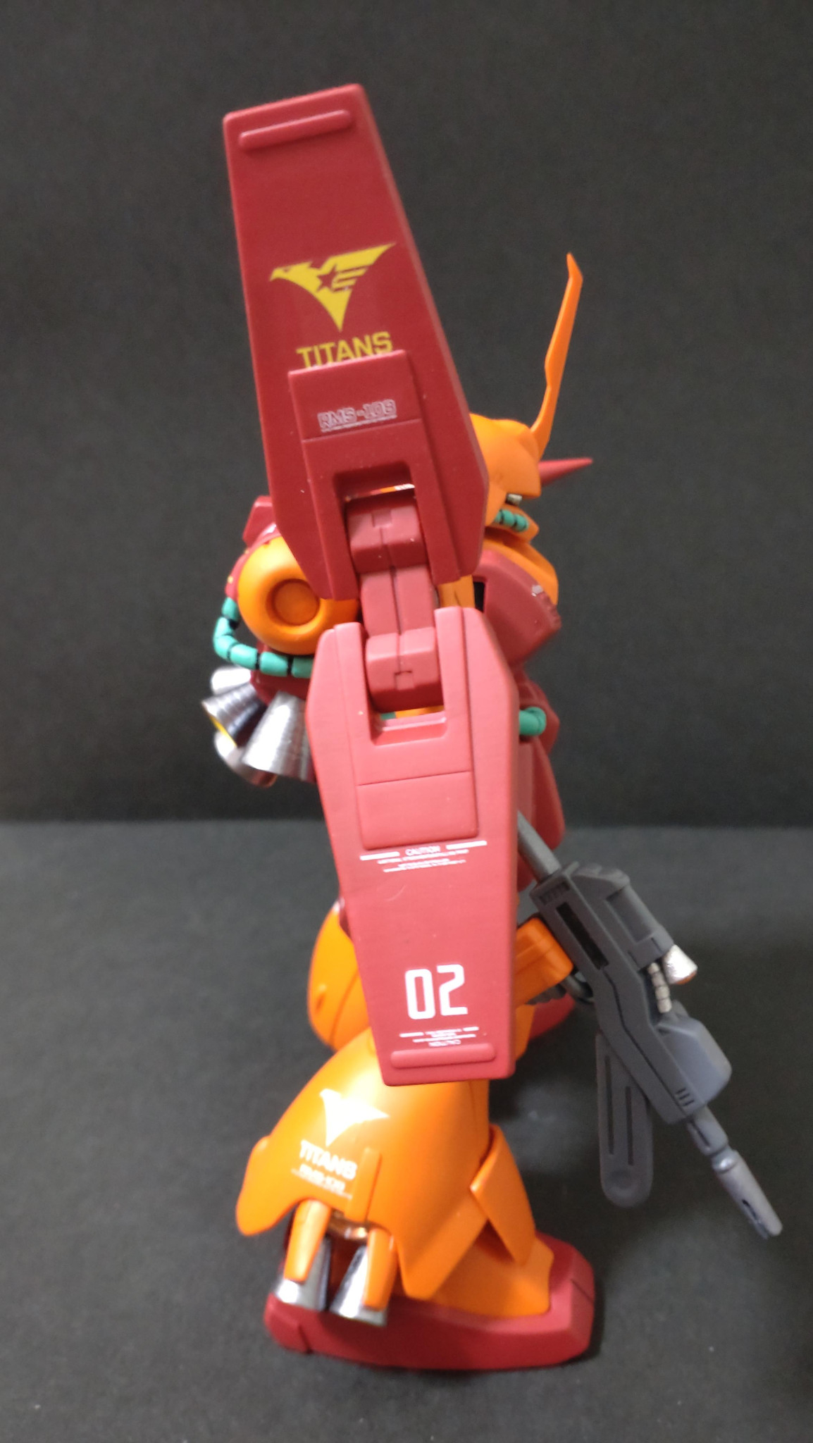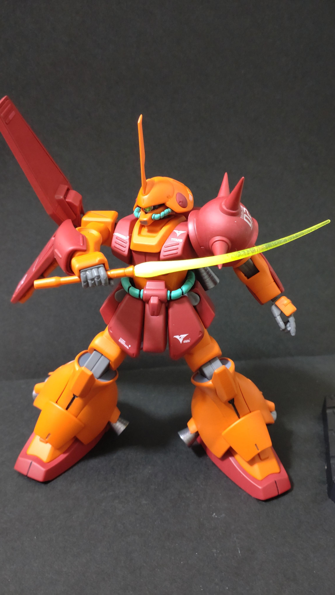 合わせ目、パーティングライン消しをし、モノアイSPプレート、Hアイズに変更、バーニアはコトブキヤに全変更、スパイクシャープ化、デカールはMGマラサイ用を使用、つや消しトップコートで仕上げてます。
