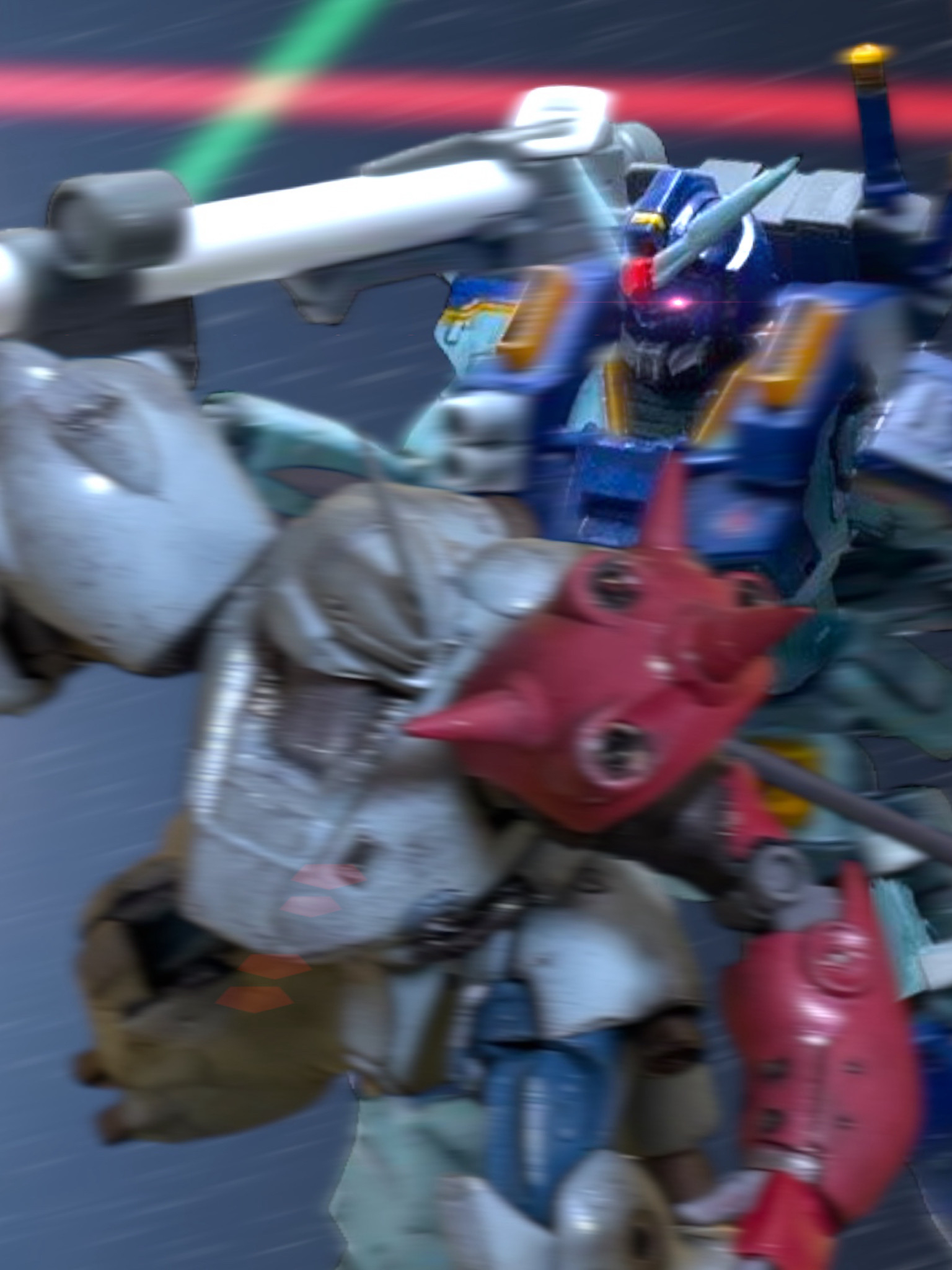 機体を推進させ、灰色の機体をゴリゴリと押し込むようにした。攻め手こそが、防御に働く時がある。同時に、右側に回り込んでいたザクを、貫こうとビームライフルを上げた。