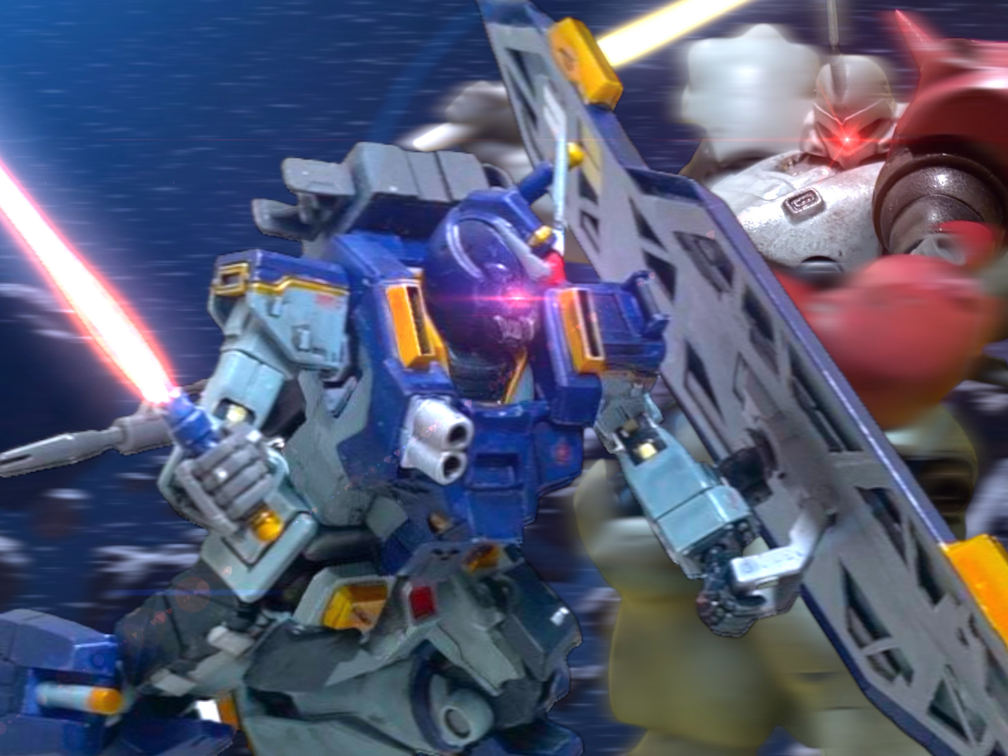 叫ぶや、再び衝撃が走る。正面から来ていた灰色の敵機と、ガンダムをぶつからせた。敵はビームサーベルを持っていた。そいつを振るってこちらを切り裂けないように、敵を押さえ込む。
