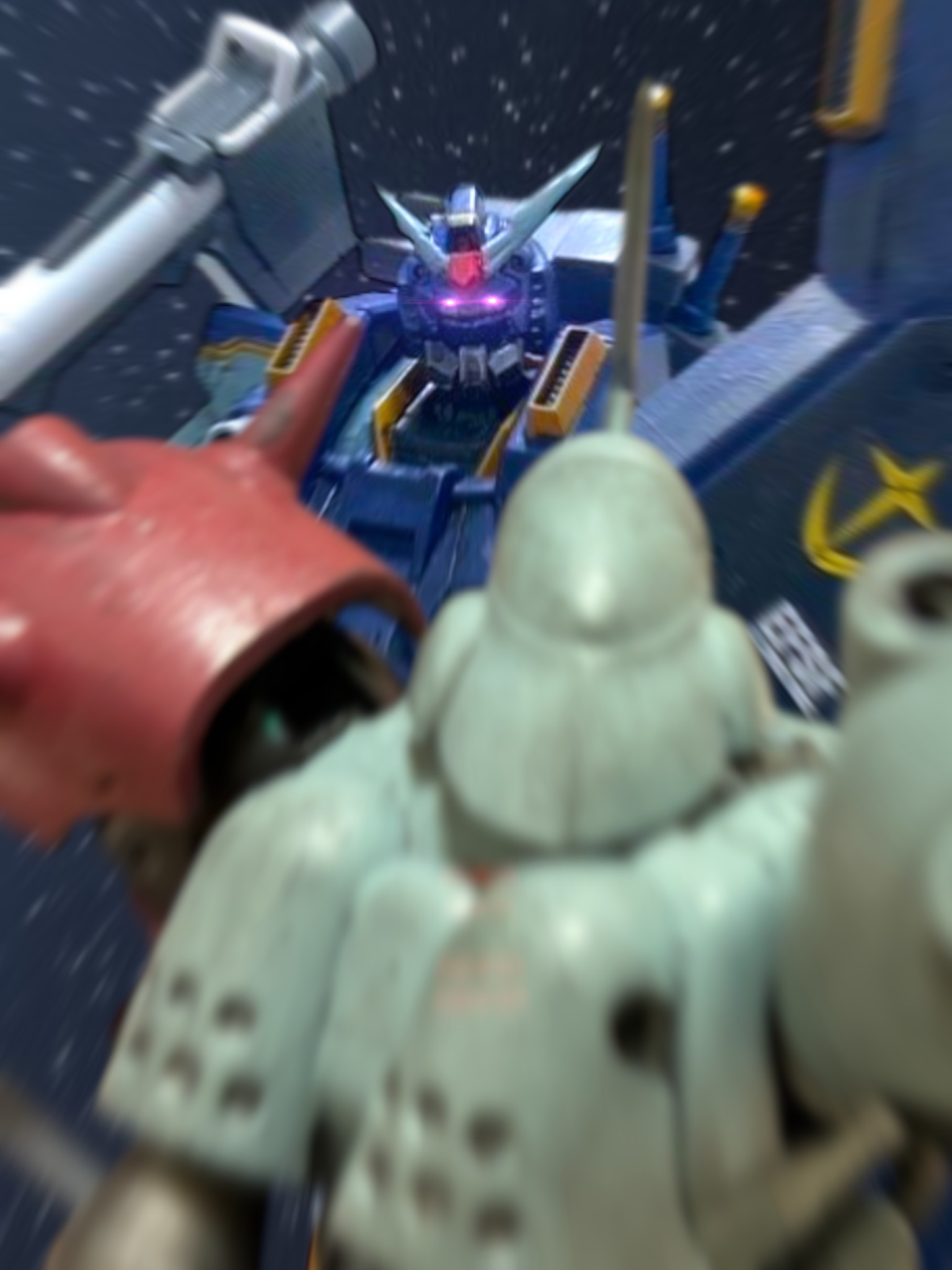 マイセンも、ハイパーバズーカを担いで推進する。今度は、敵の腰部にマウントされたシュツルムファウストが一発飛んできたが、これも、シールドで後ろに受け流した。しかし、これは囮だった。先ほどの赤い肩のザクが2機、ガンダムに再度挟撃を仕掛けてきた。