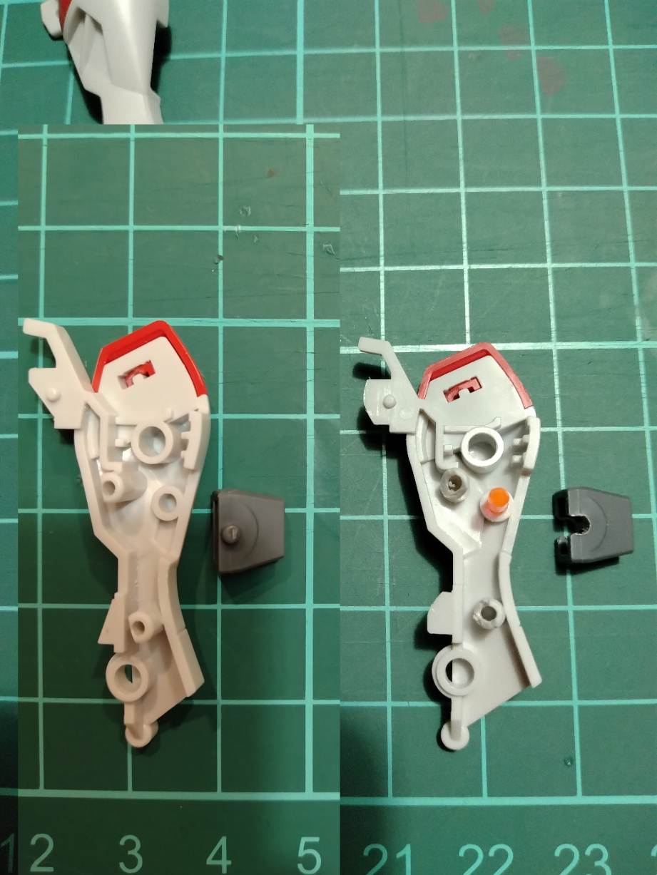 脛の裏側に大きく合わせ目がありそのまま合わせるとスラスターが取付けできなくなるので、塗装のを塗り分けやすくするためにダボ穴を変更してます。