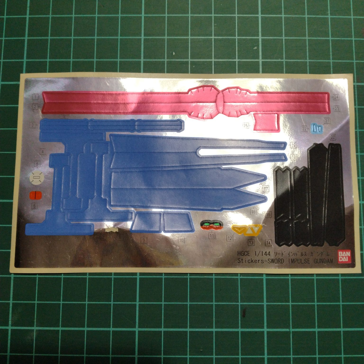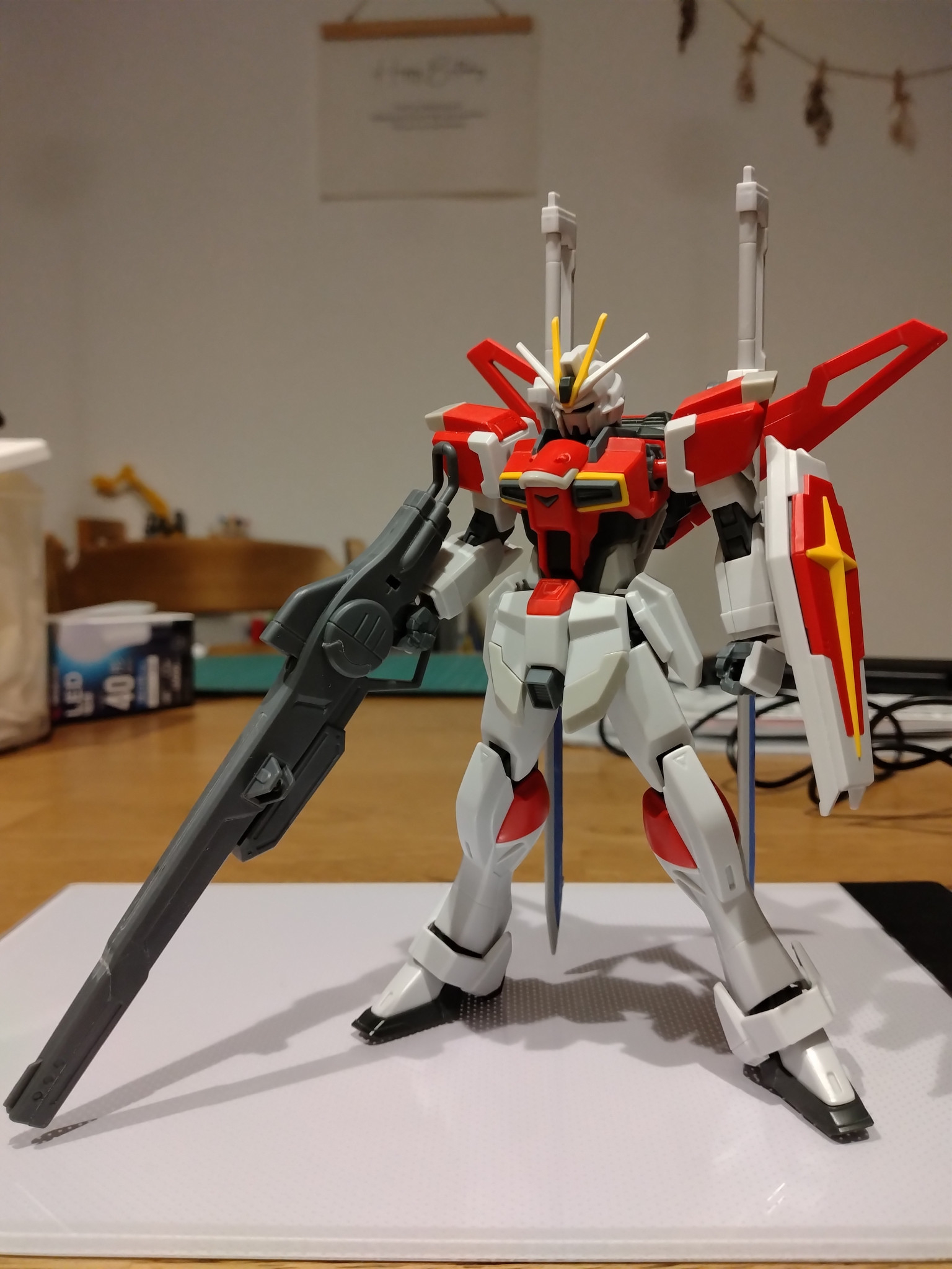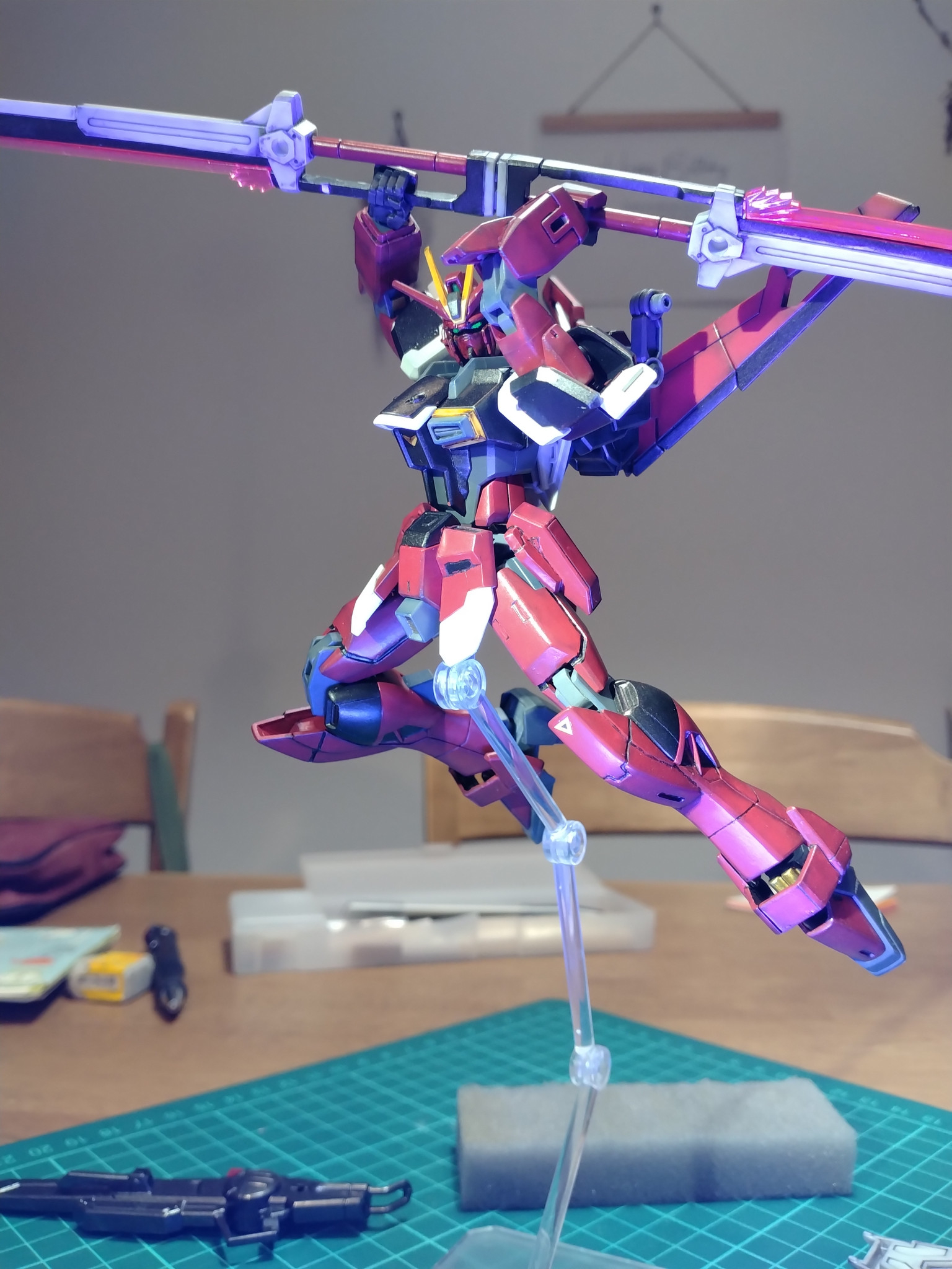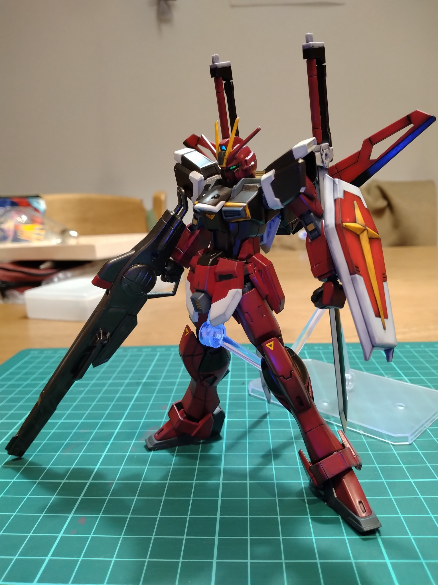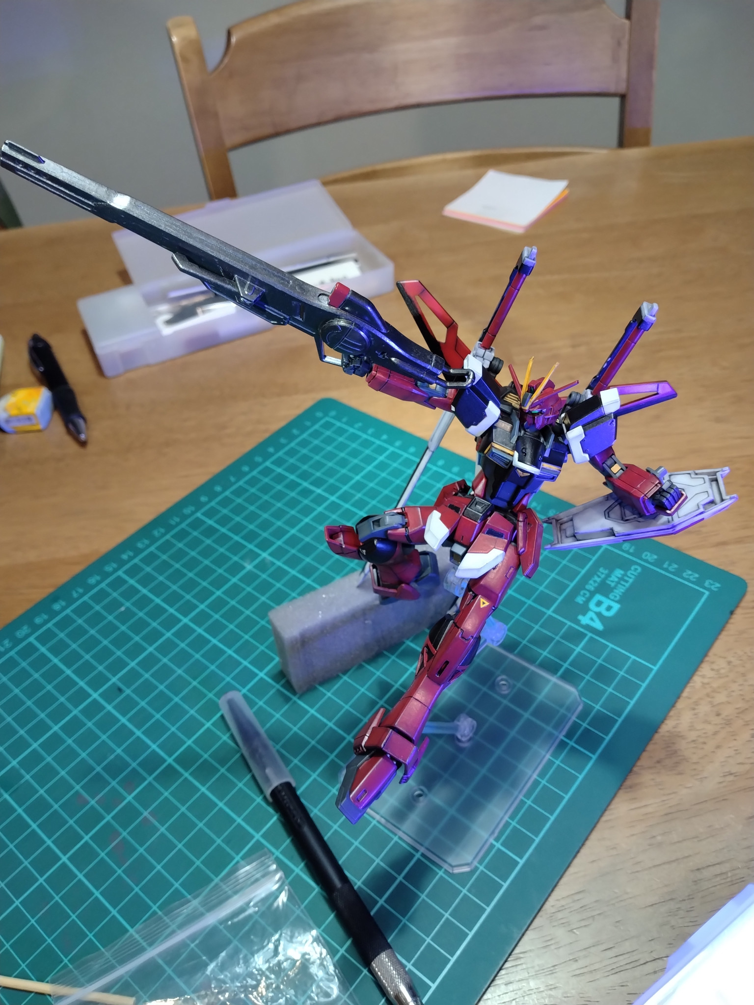 プレバンのインパルスを筆塗り塗装で塗り分け、試製レールガンはキャバリアーアイフリッドから拝借した謎の贅沢仕様です。シールドとアンテナ、ブーメランの部分はリアルタッチマーカーでグラデーションぽくしています。本体カラーと色合いを合わせるためです。この機体は角が多くエッジに塗料がうまくつかなかったのでウェザリングマスターで誤魔化してます(定番化しています)。