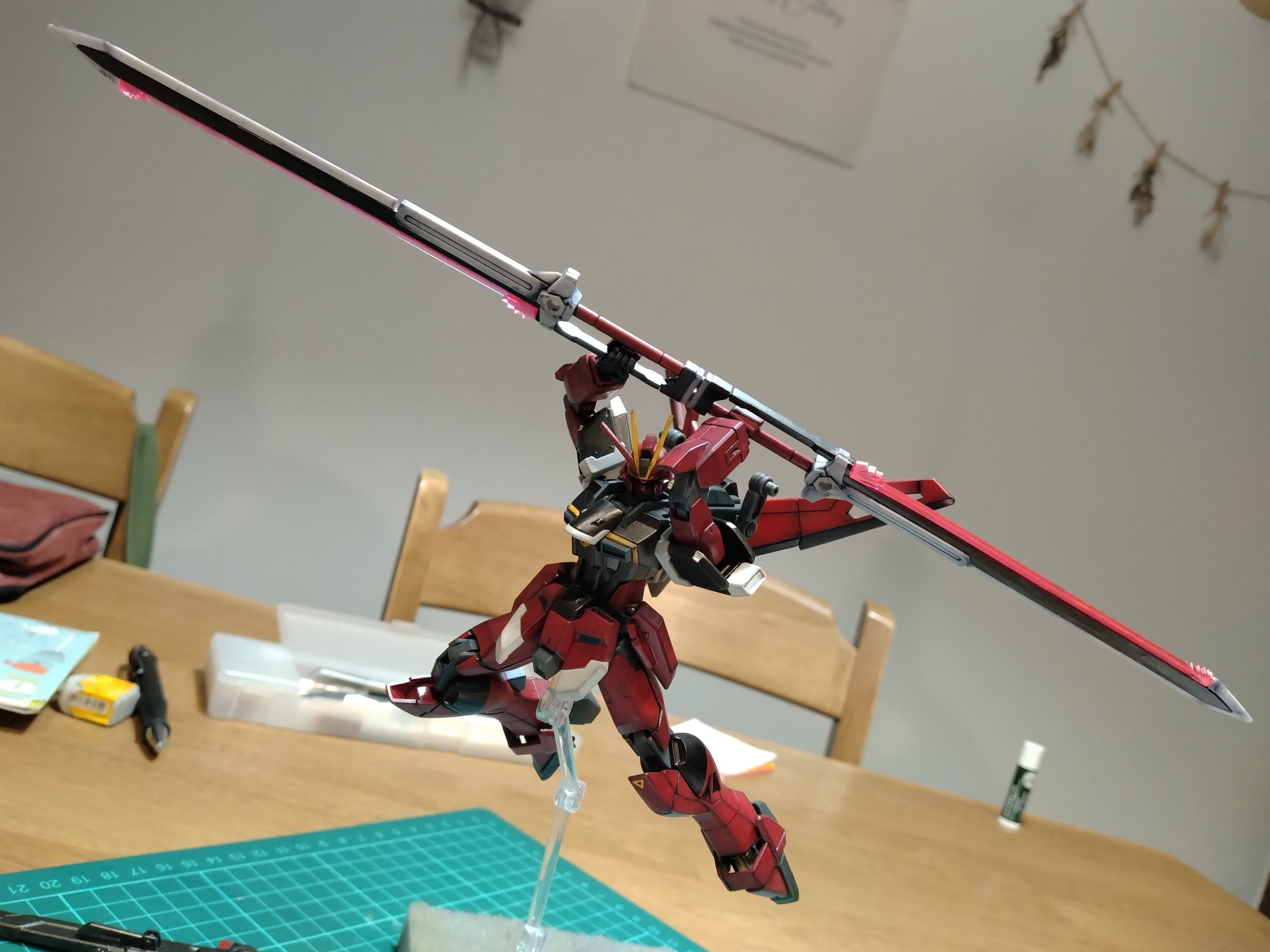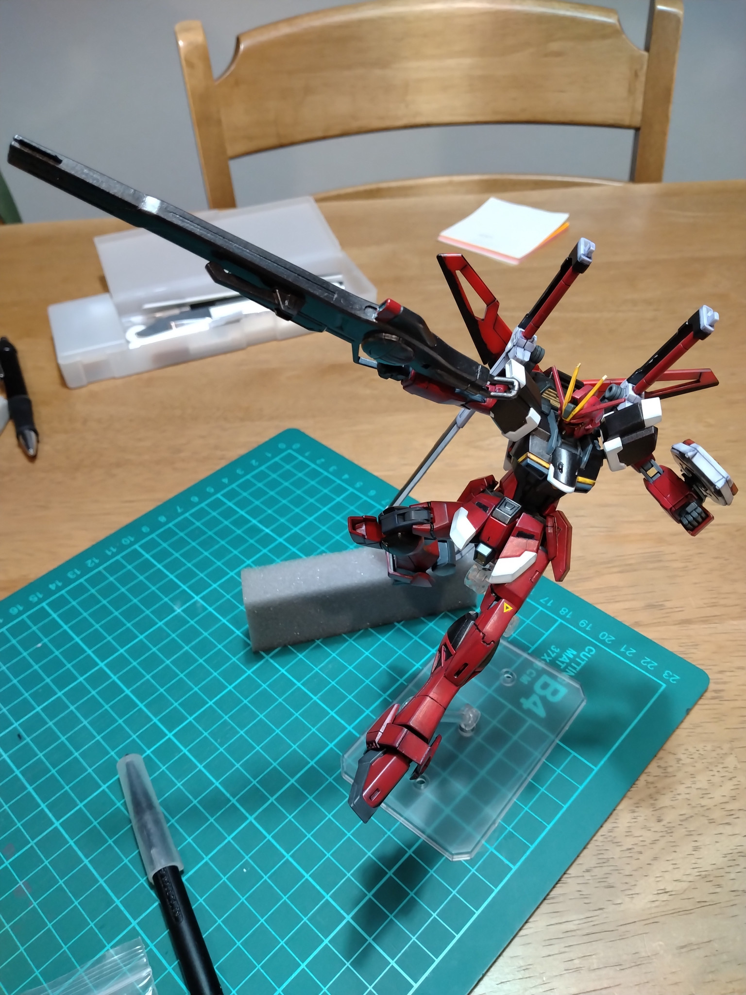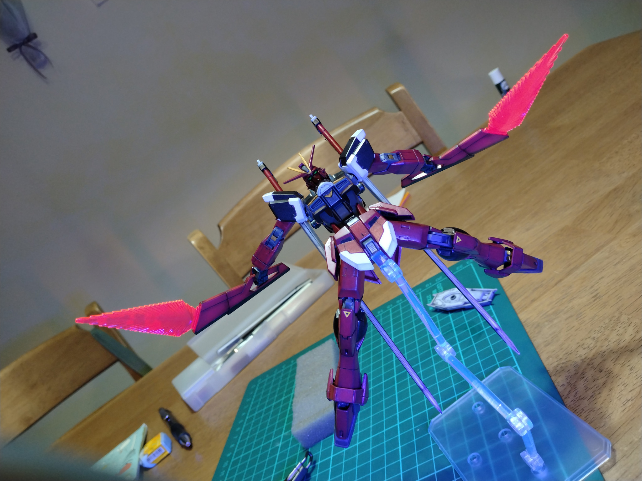 もうすぐで完成だと急いで組み合わせたら目が光らないじゃないですか・・・ずっとツインアイのパーツを逆光で塗り分けやUVライトで当てていたから気付かなかったんですよね。こうやって書いたら当たり前のことなのにやらかした感がすごくて本当に落ち込みました。何とかしようと爪楊枝で目の部分を塗ったら下地が溶けたり他の部分に付いたり涙目になりました。リアルタッチの赤と黒でなんとか誤魔化してます。いやぁ、ここまでリカバリーできて本当によかったです。