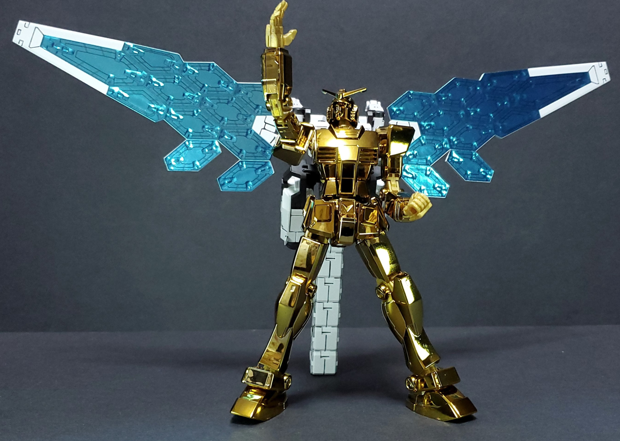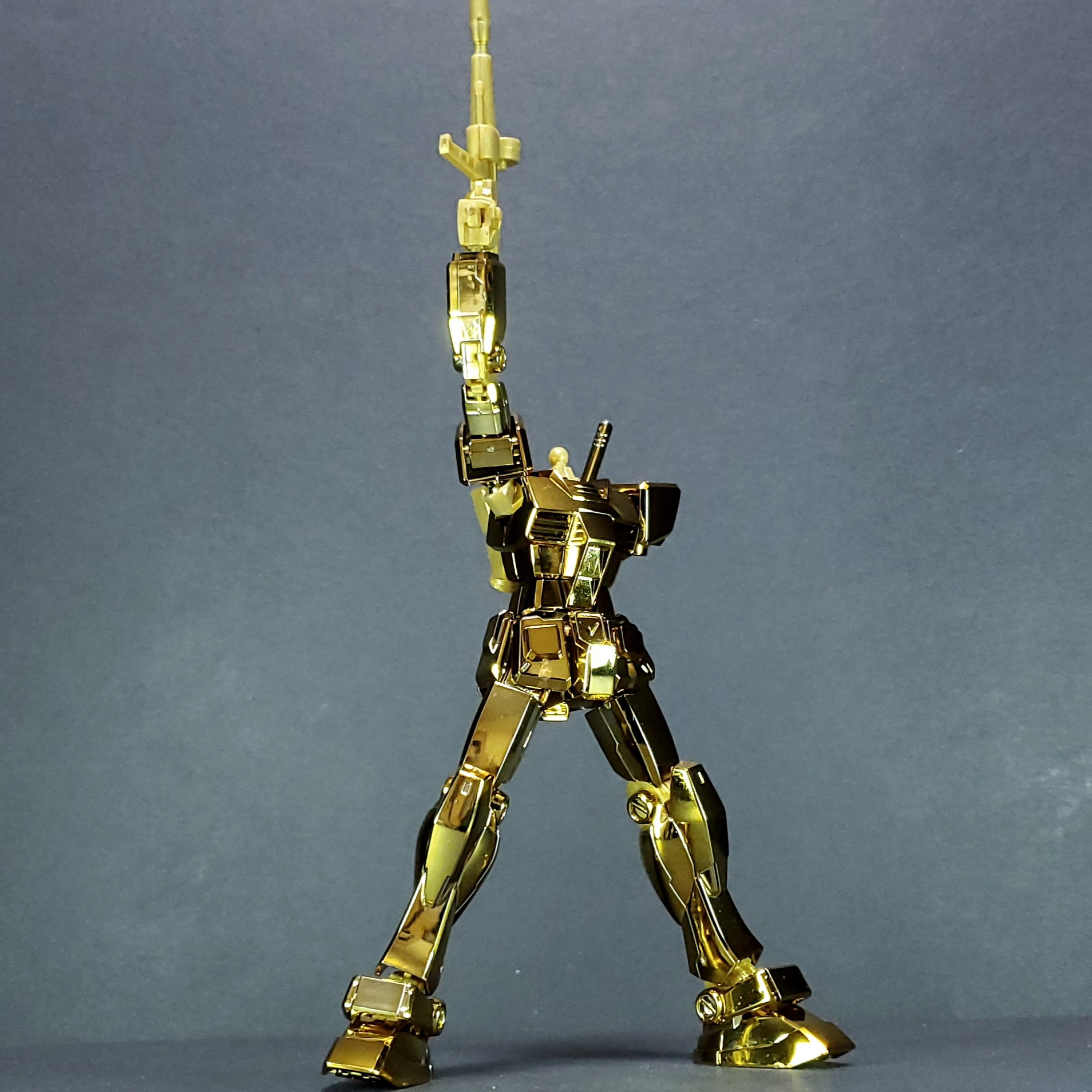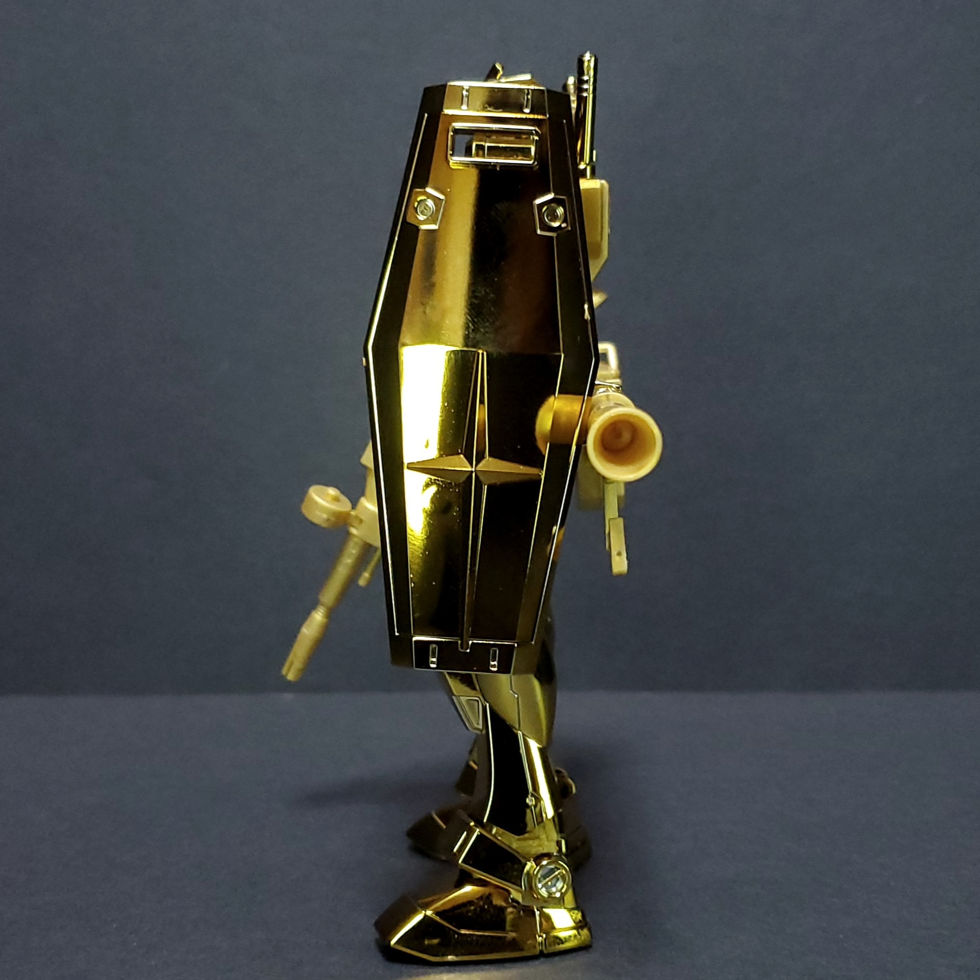 本体は金メッキ、武装や手首、関節はゴールドイエロー、ビームサーベルはクリアピンクです。