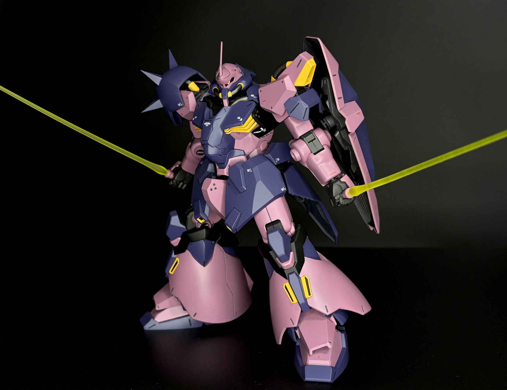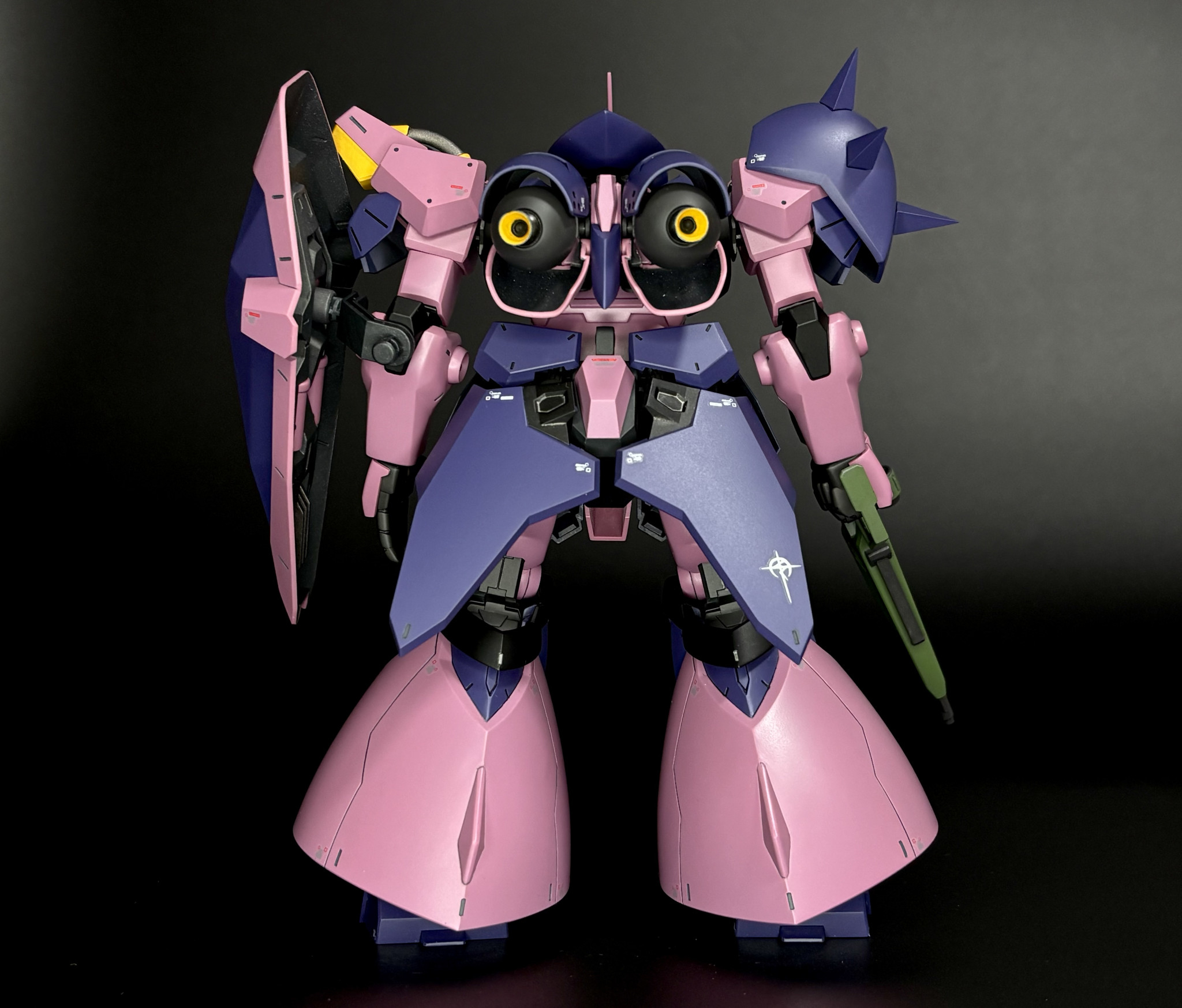 メッサーってザク系MSの最終到達点だと思うんですが、背中のバーニアにドムの系譜も感じます。F02装備はさらに脚のリフティングフレアで一層ドム感増し。