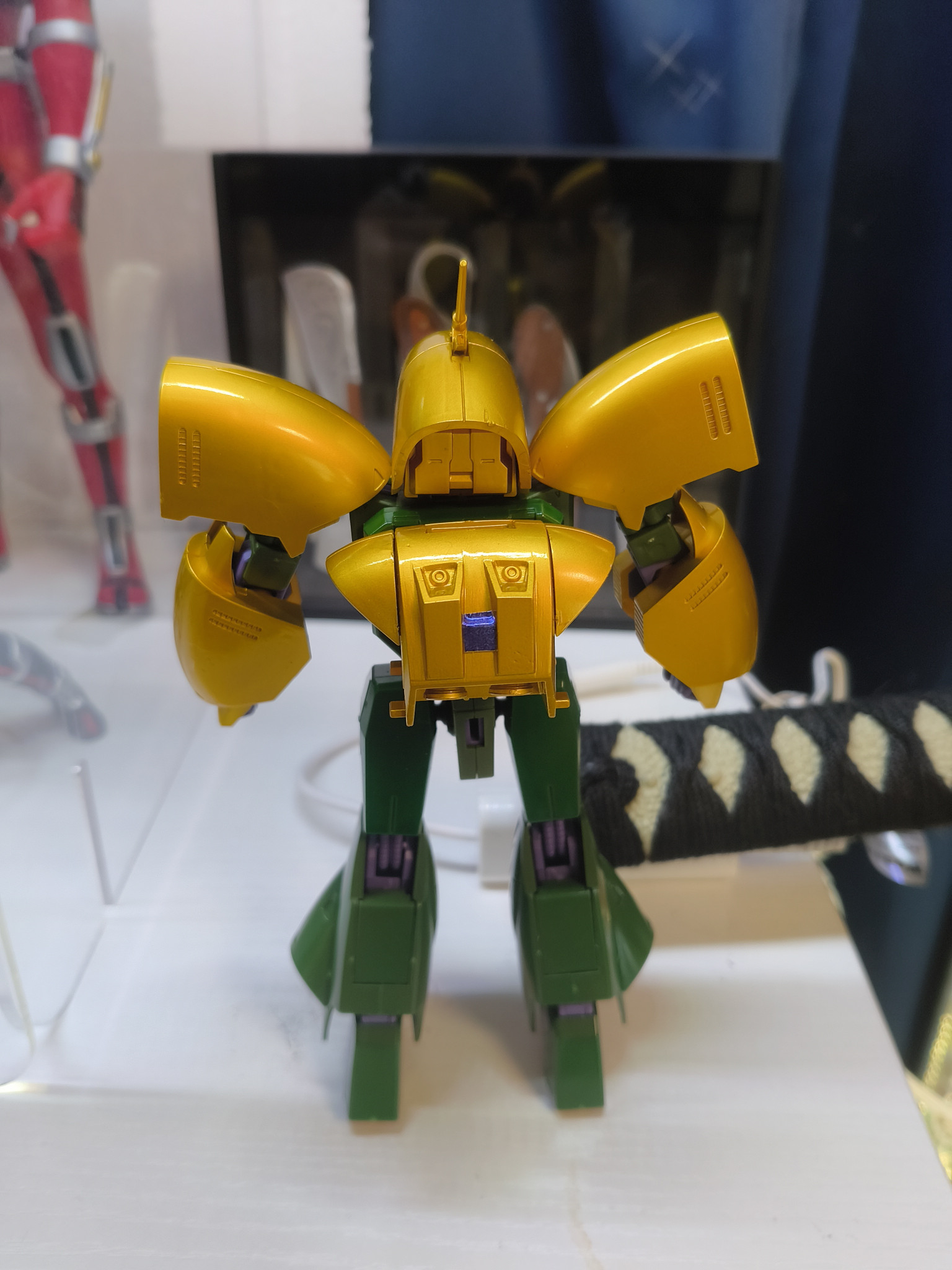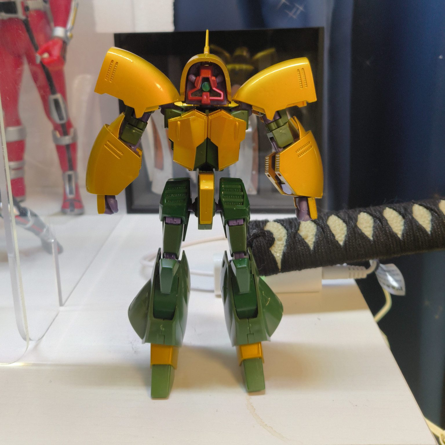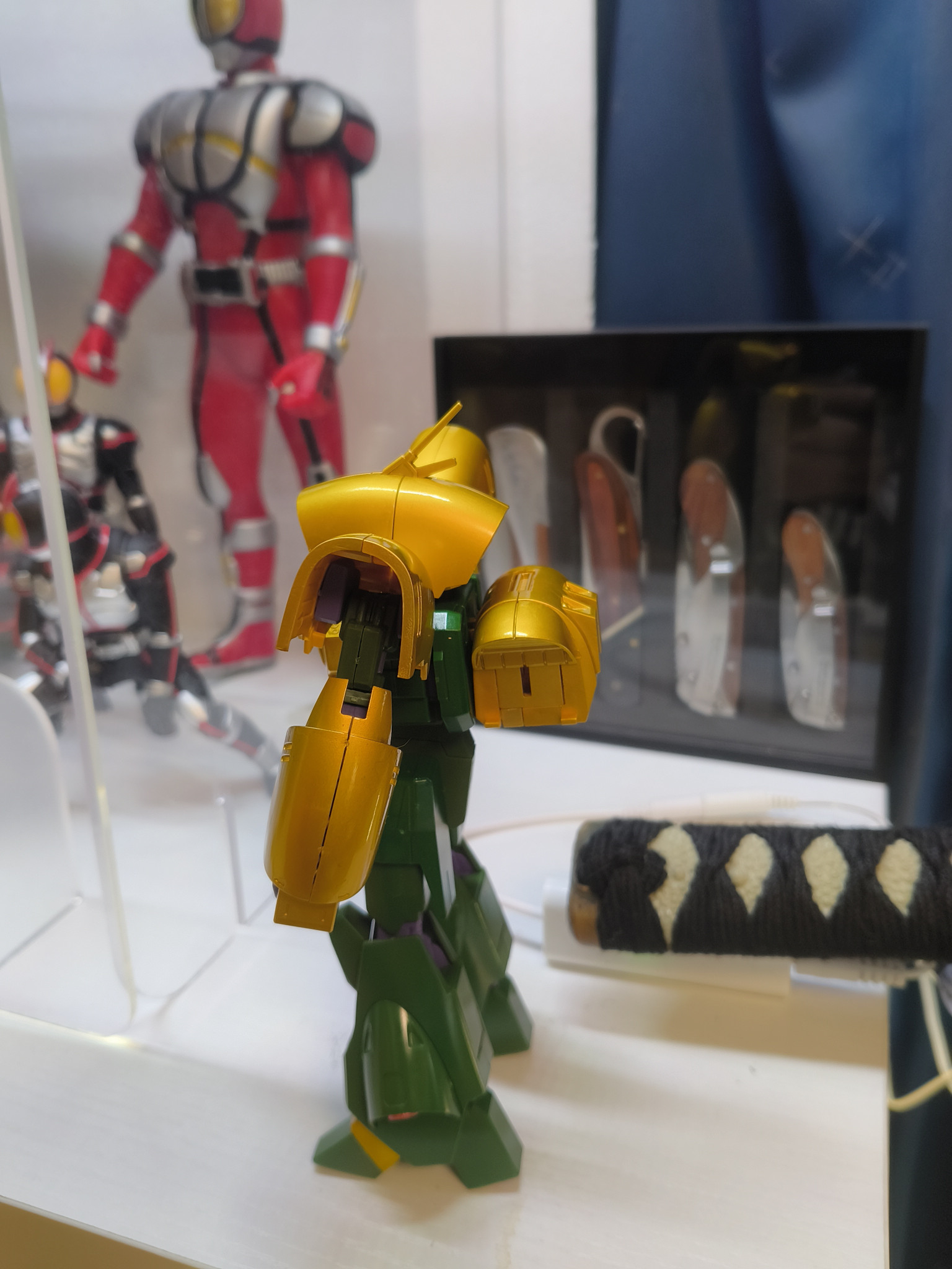 前に撮影場に使っていたスペースを手作りのクリアケースを設置してヤマトやらハーロックや仮面ライダー555などを飾ってしまったので色んな物が写り込んで申し訳ないですちなみに日本刀は無銘 乱れ波紋 黒石模様鞘の大刀と小太刀が飾ってあります