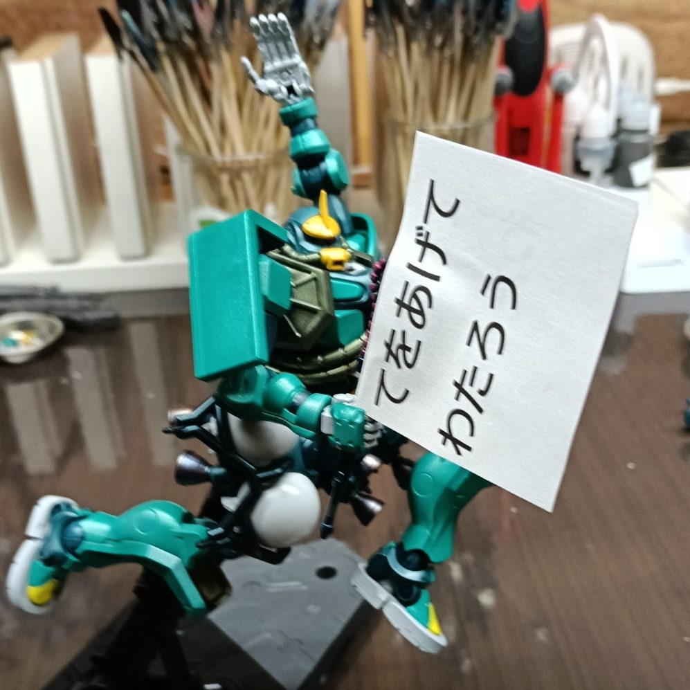 takatorab… HG 2026.02/08更新 シャリアブル専用ザク(GQ) 48 ??? 0 0 作品を共有 アナザーコンの応募作品です コンテストの予選期間中は自分以外の作品の「いいね!」数はシークレット表示になります。 気になった作品は、是非「いいね!」をして応援しましょう。 GQザク作ってたら足のタンクが卵に見えて 足が運動靴に見えて気が付いたら緑のおじさん仕様(しゃりあぶる?)ってことになってしまいました。 武器は ヒートフラッグのみです。 停止状態(信号待ち)青信号青になったから加速 開始 !!加速中も左確認 よし!!カメンライダ-色なのでライダ-キック! アナザーコン コメント コメントをして応援しよう コメントにはログインが必要です takatorabatta 病気療養中につき 自宅ガンプラ待機 4か月目 この作品をお薦め作品に設定する Please login to update your profile! Please login to update your profile! Please login to update your profile! Please login to update your profile!