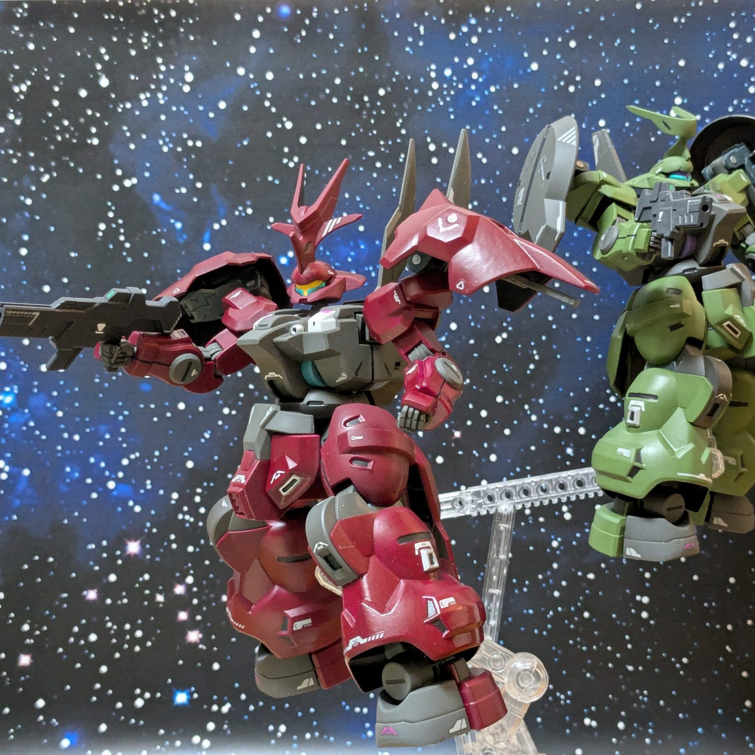 HG水星の魔女から、グエル専用とラウダ専用のディランザです。手元にあった塗料でぬったら、ゲームの配管工兄弟みたいな組み合わせになりました。