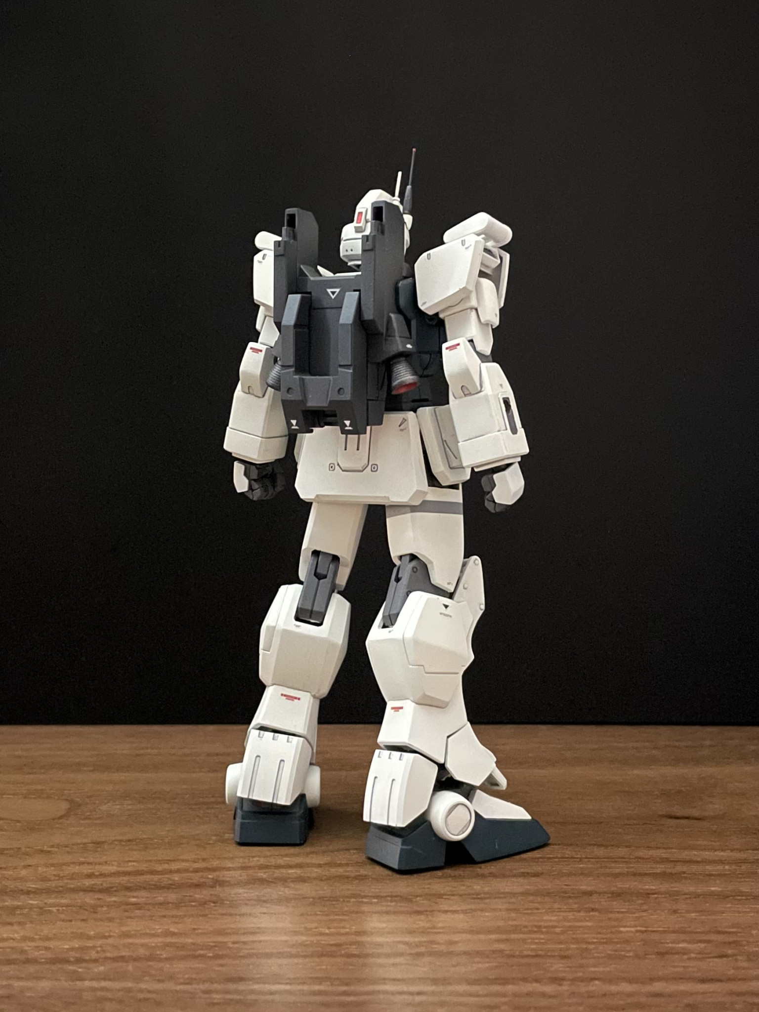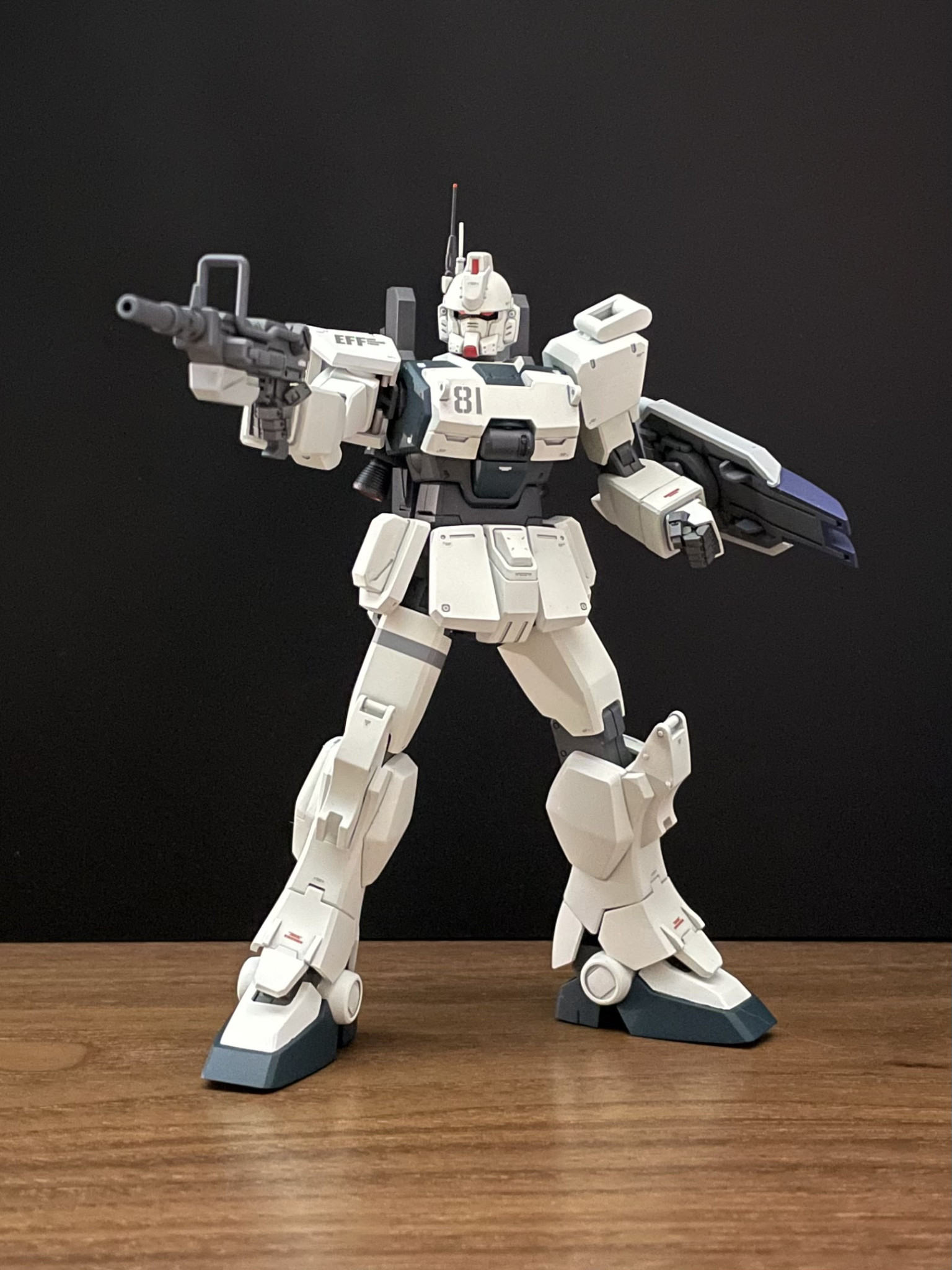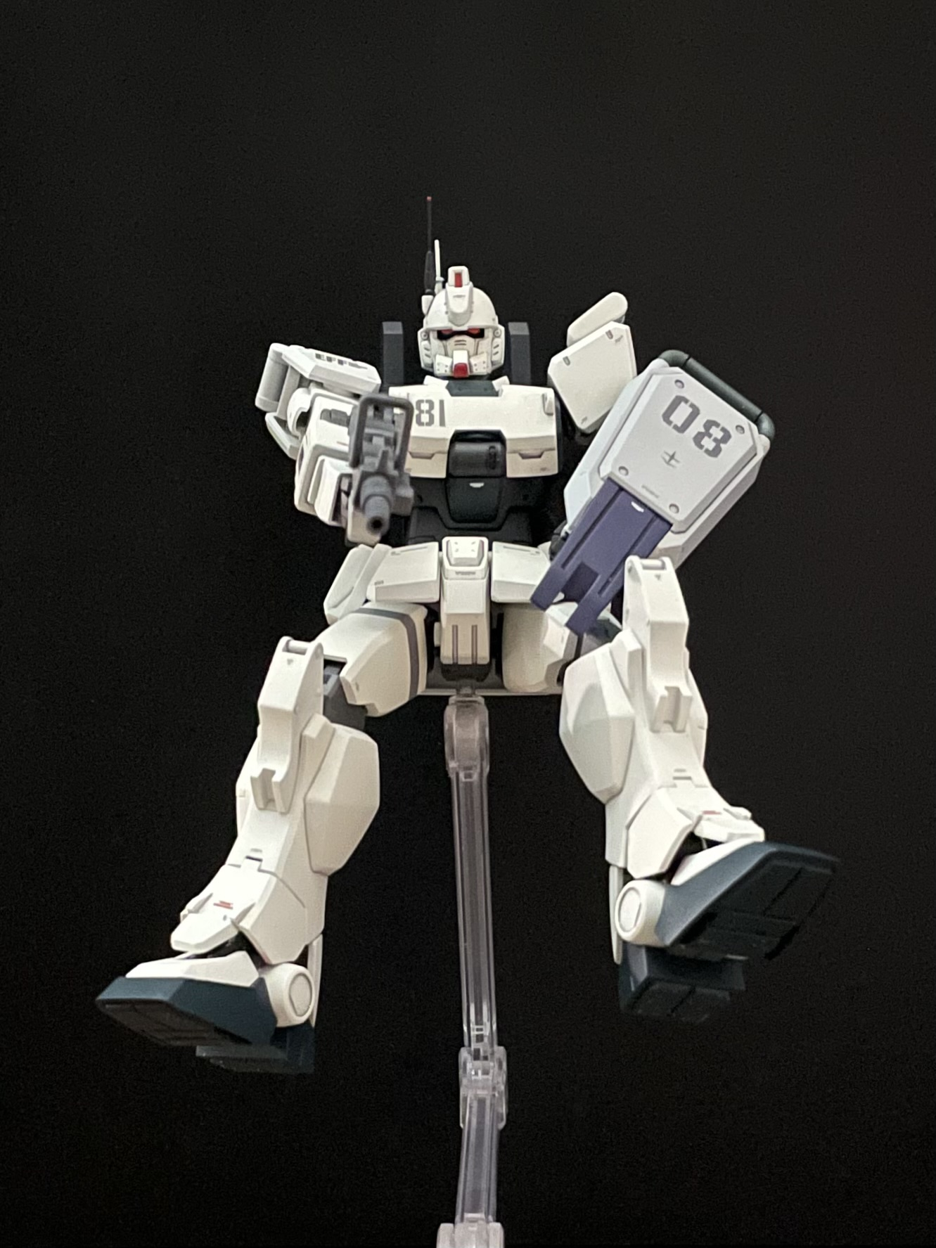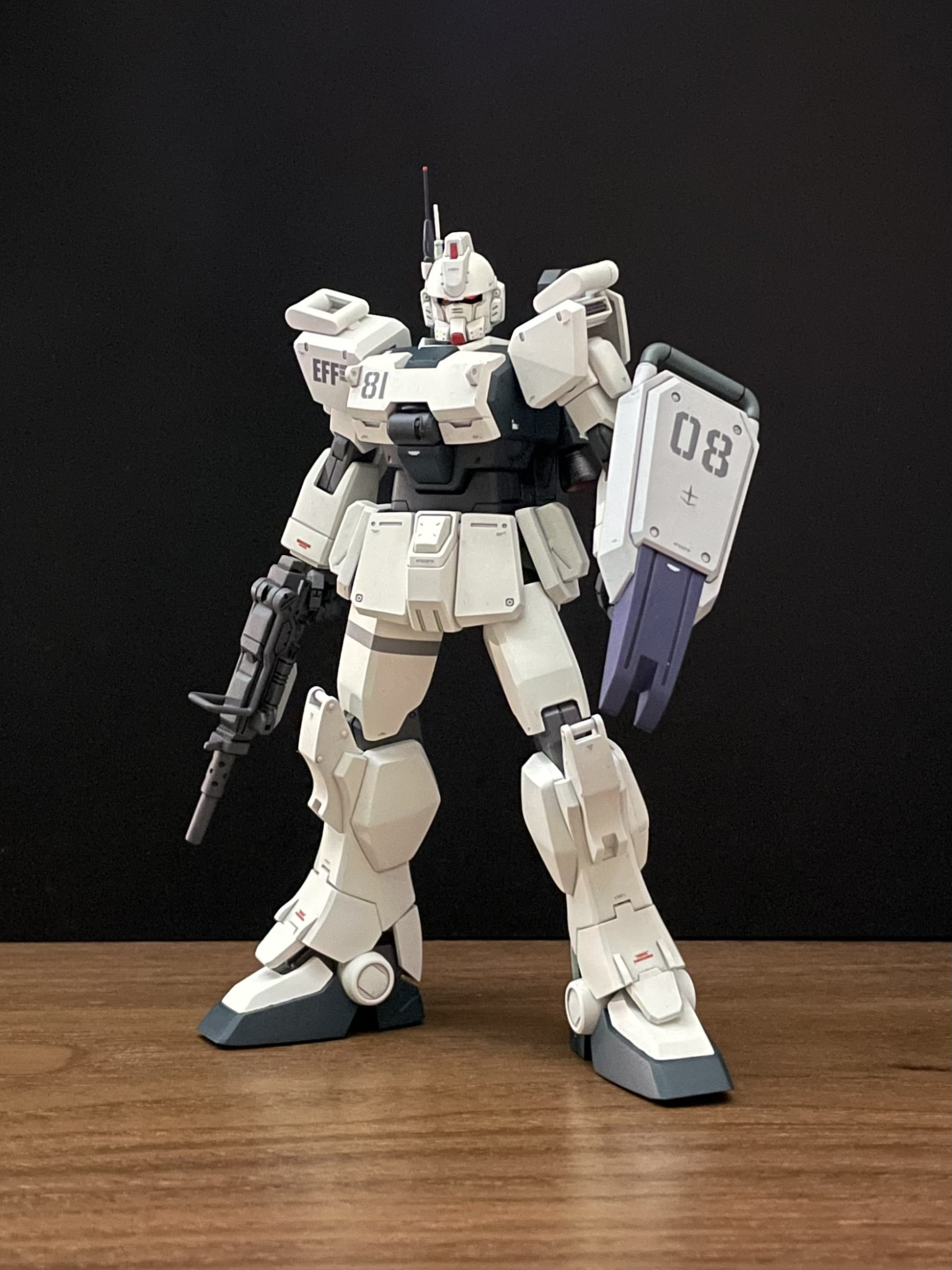 シールドや武器類は陸戦型ガンダムの流用という設定なので、本体とはカラーリングを変更しています。