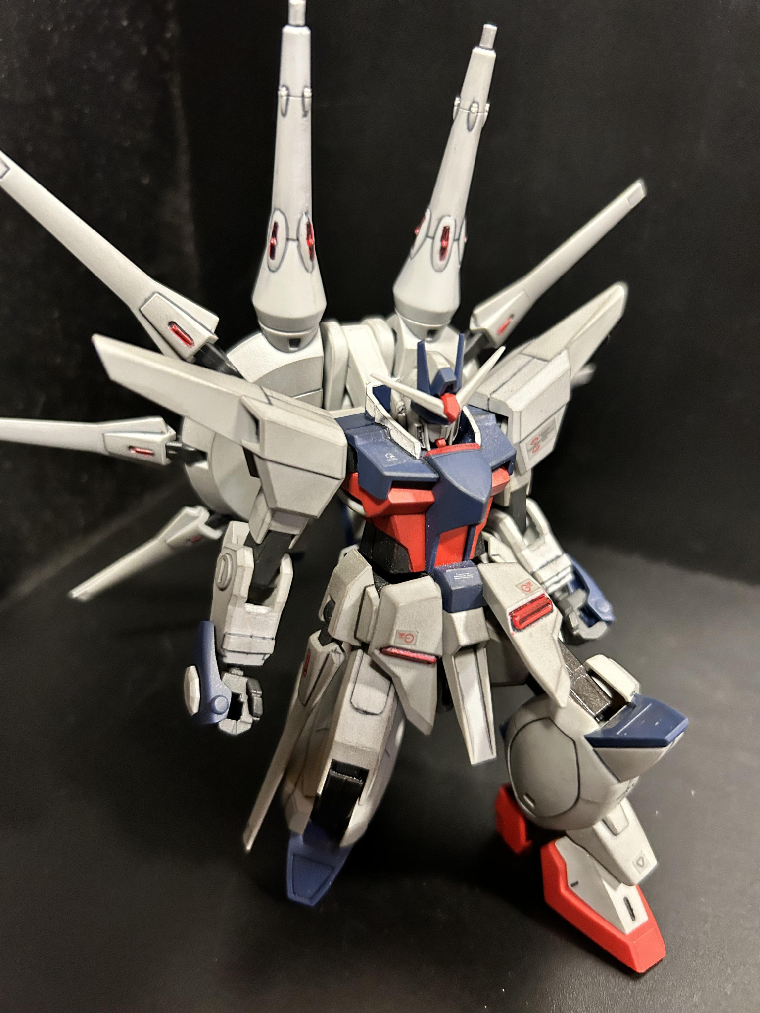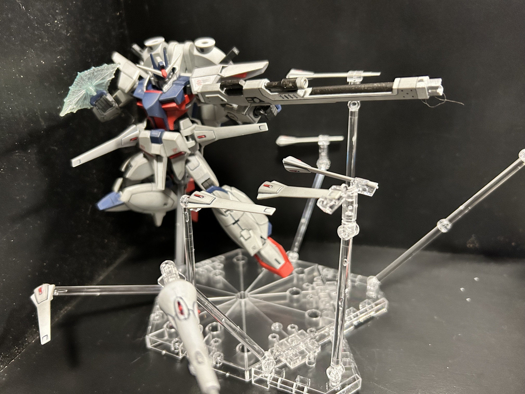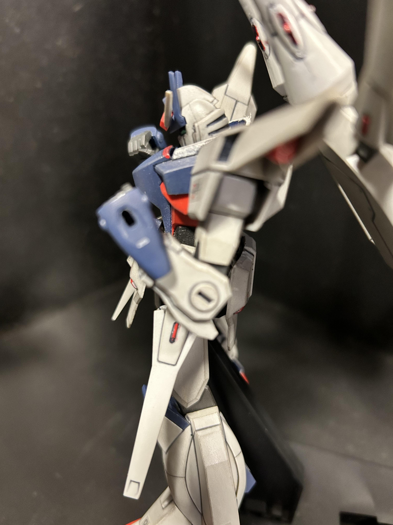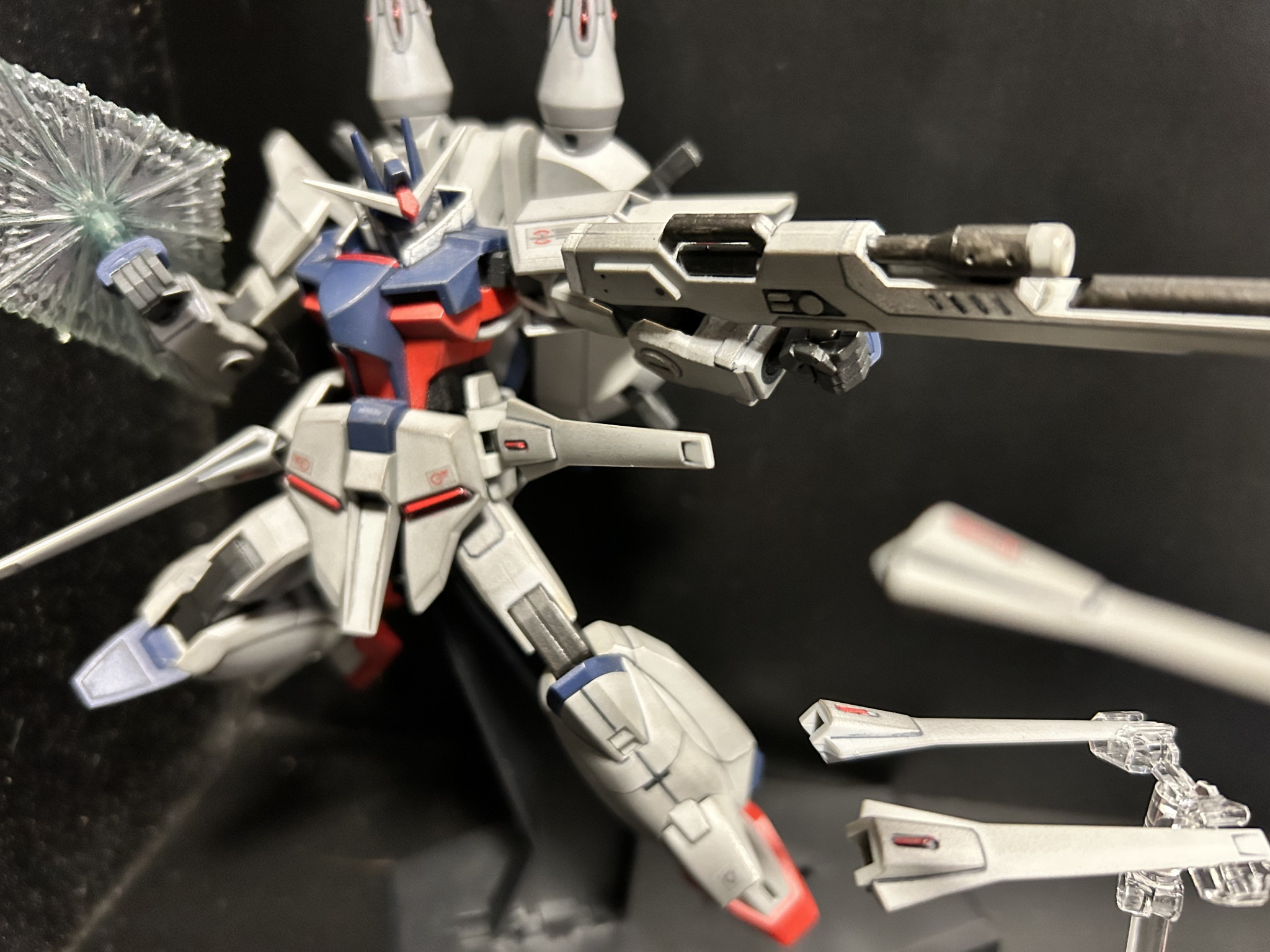 まず関節ですよね。とにかくちょっとでも可動域を増やそう、だが、大幅な改修はやりたくないんで、とにかく削りたおしました。股関節はボールジョイントの部分を旧HGストライクのをくっつけたら少し広がりました。そして背がちょっと伸びました。どうにか膝立ち、正座できます。