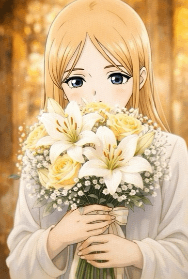 白い大きな百合の花と、黄色い薔薇と、懸命に咲くカスミソウと……淡い色合いが、”マリア”の明るい髪色と、弾けるような笑顔によく似合った。
