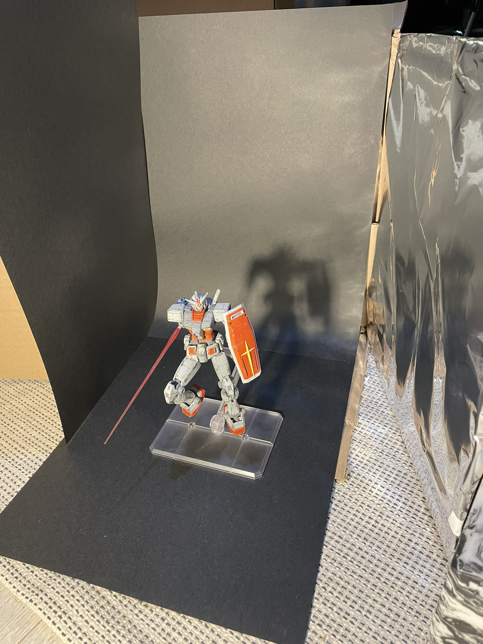 元々撮影の環境ほしいなーと思っていましたが某SNSでガンプラの写真撮影方法のコラムを読んだことで段ボール + 画用紙によるお手製ながらブースっぽいものを作ってみました