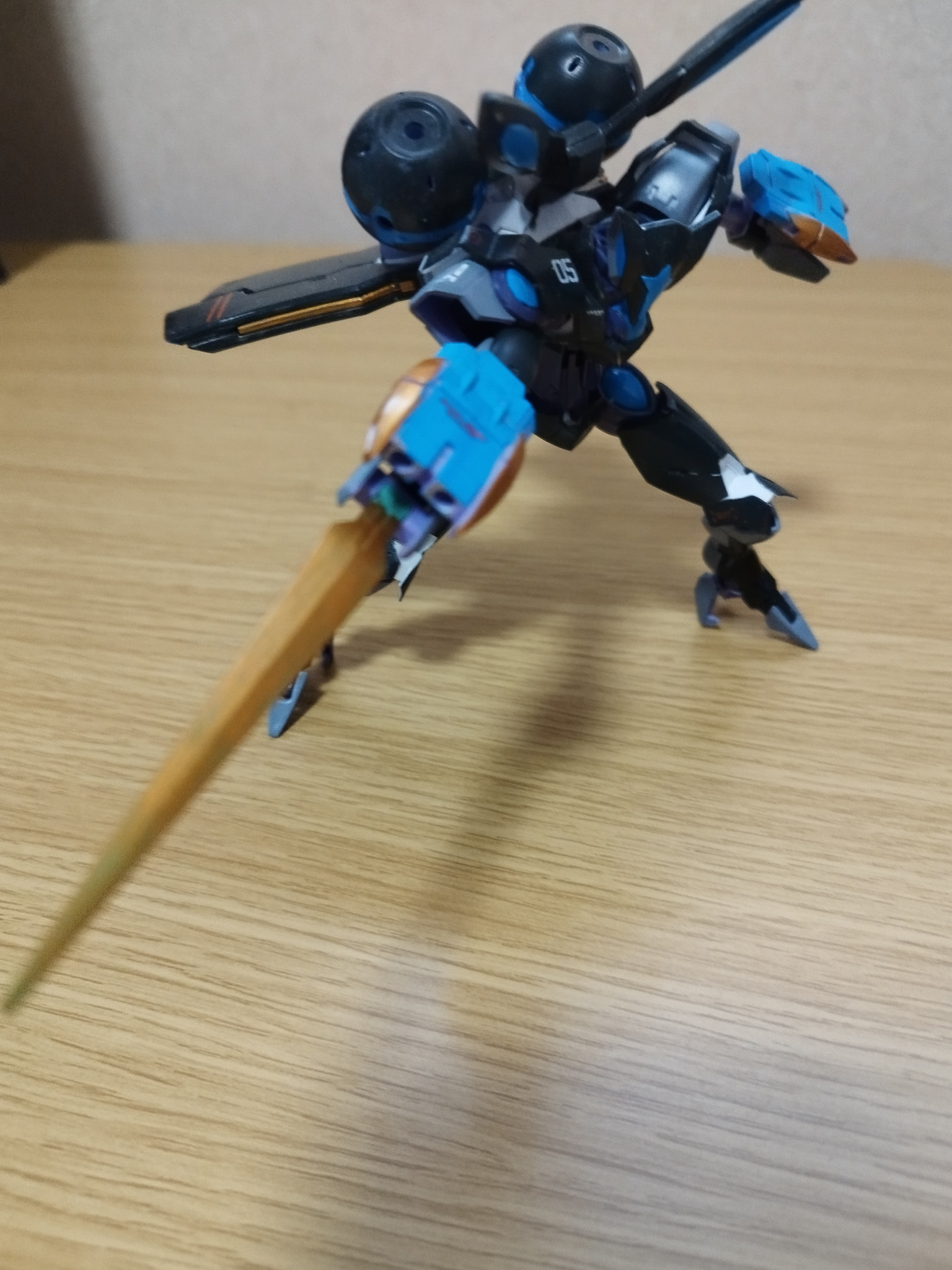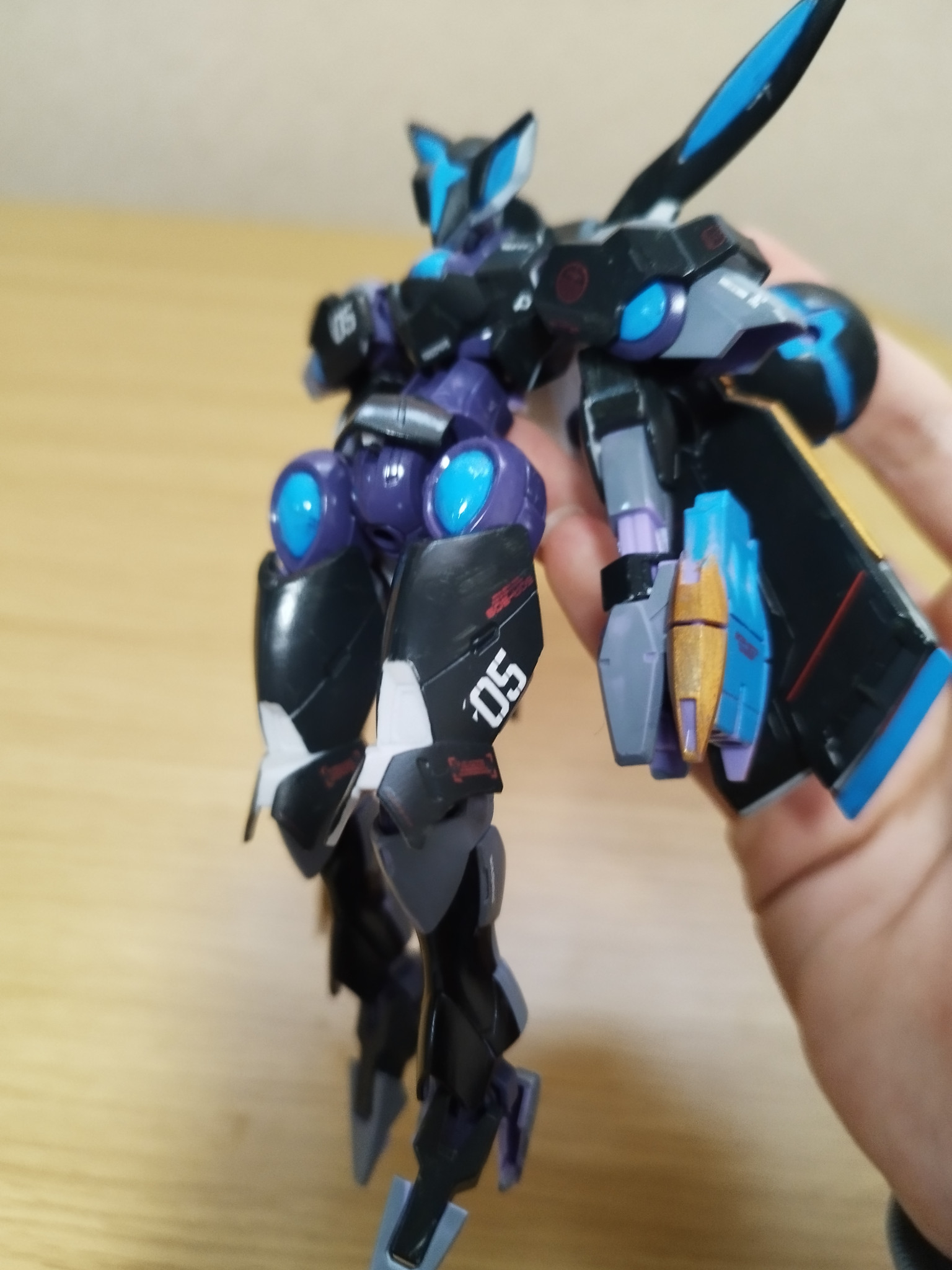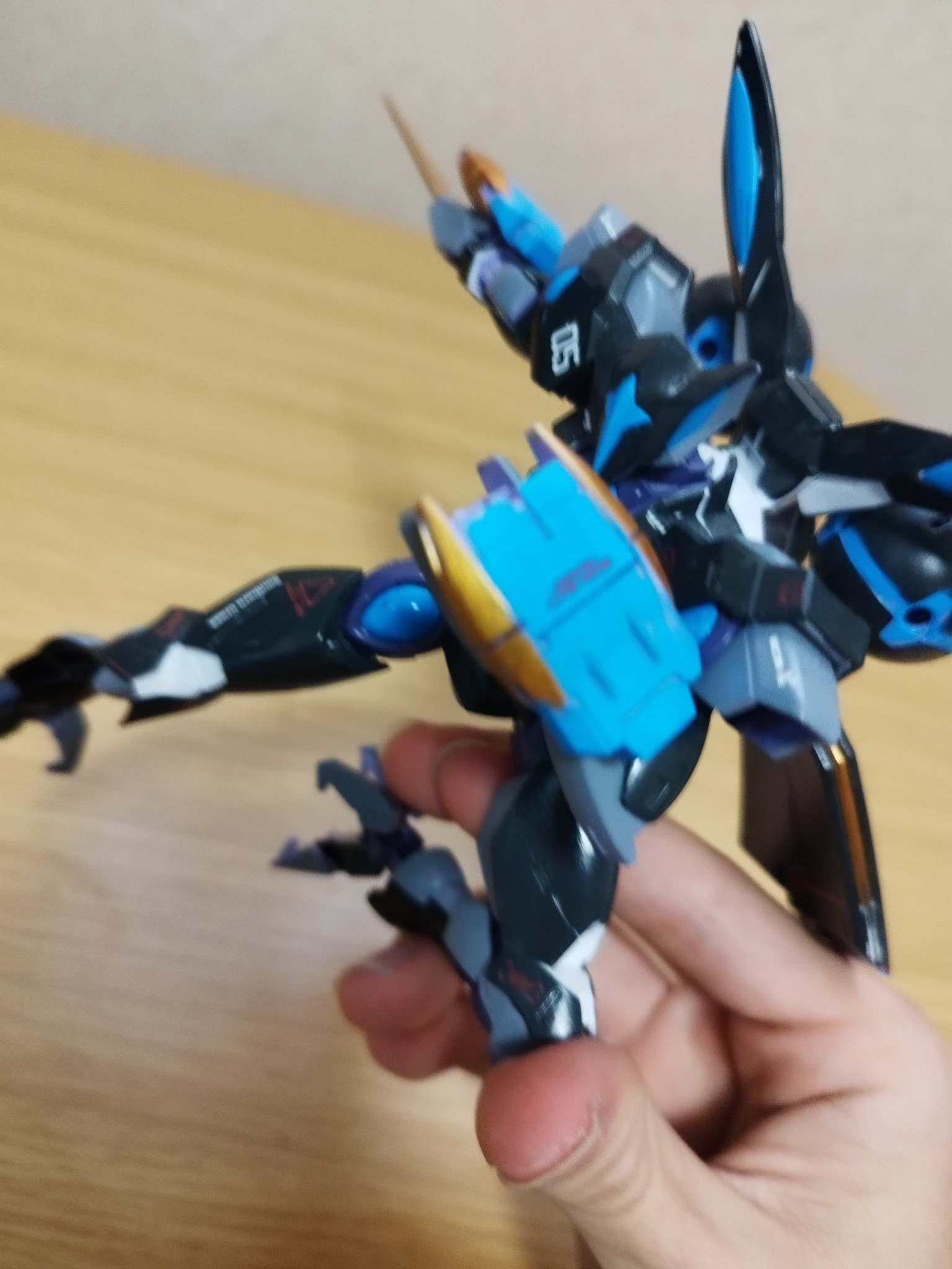 今回のベギルベウは夜兎をイメージして機体のカラーリングも暗めにそして所々月の光が水辺に映る水色を再現しましたそして月のイメージとして金色を配色、そしてスーパークリア吹いて光を反射しているイメージを再現!