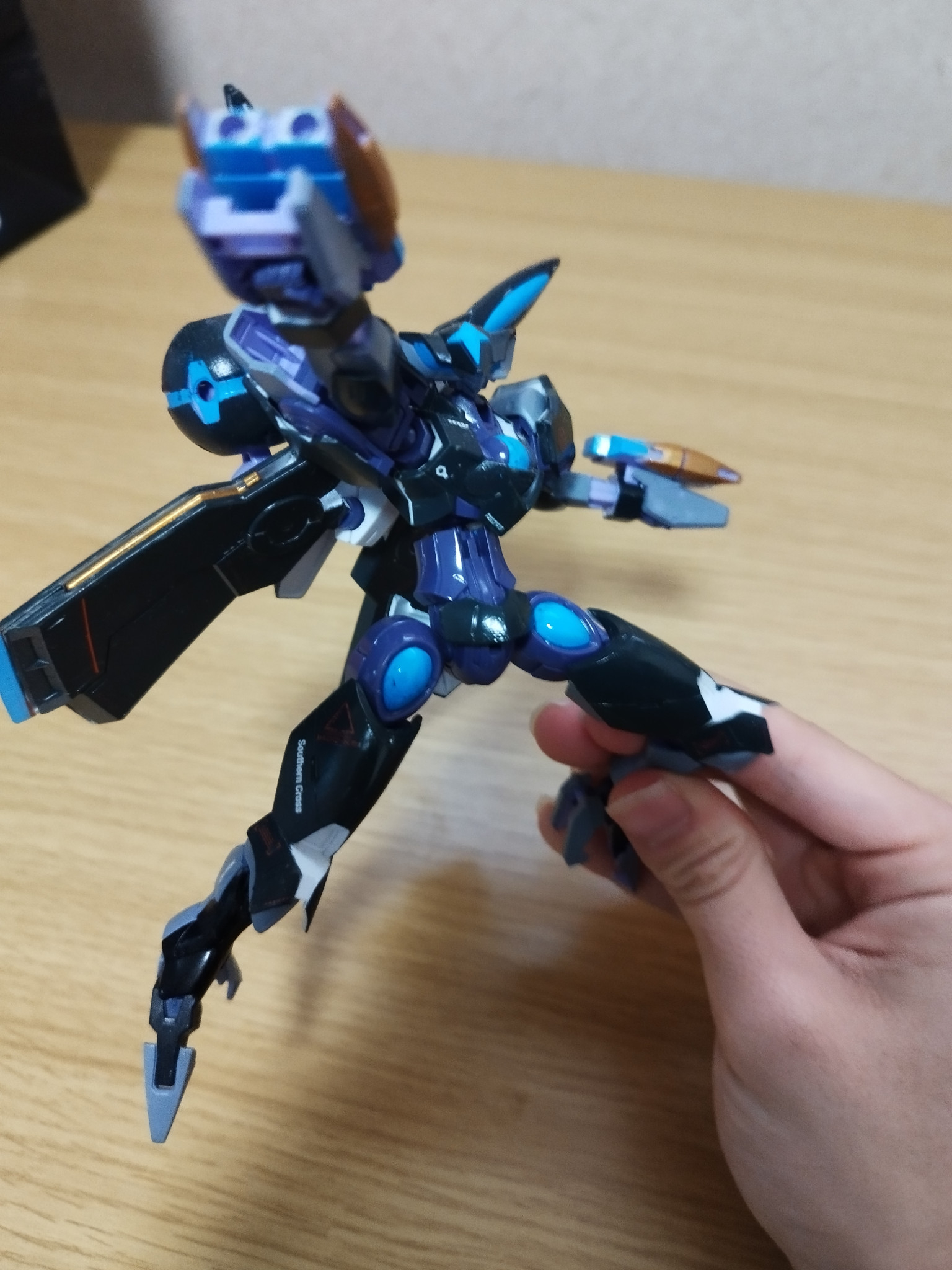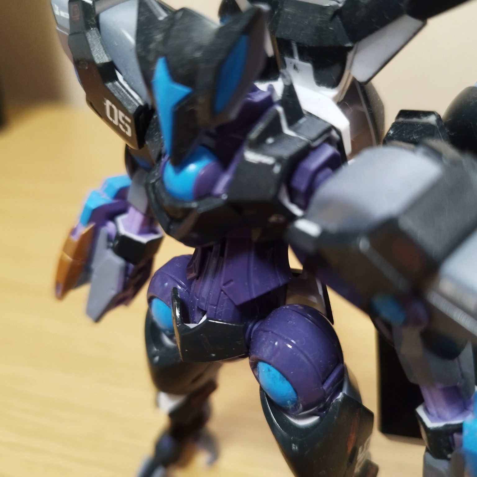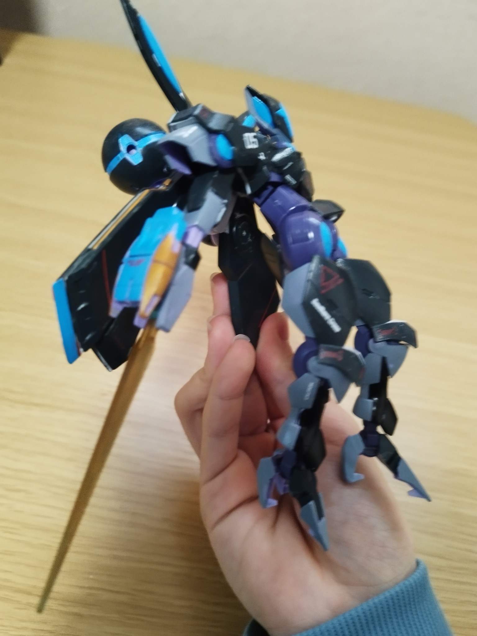 今回のベギルベウは夜兎をイメージして機体のカラーリングも暗めにそして所々月の光が水辺に映る水色を再現しましたそして月のイメージとして金色を配色、そしてスーパークリア吹いて光を反射しているイメージを再現!