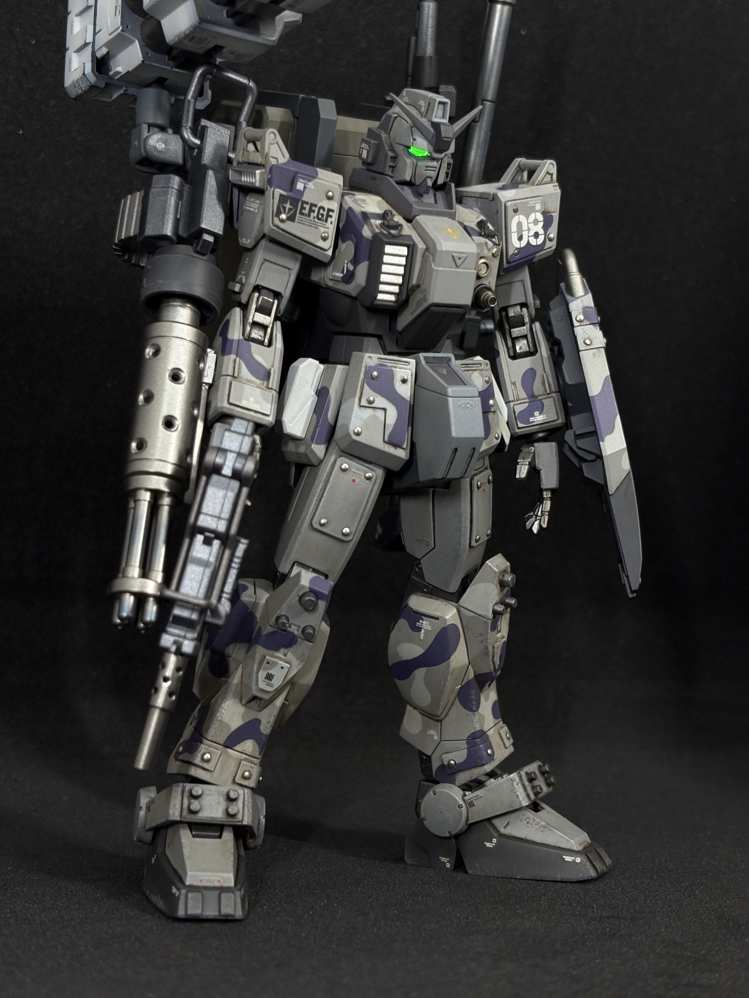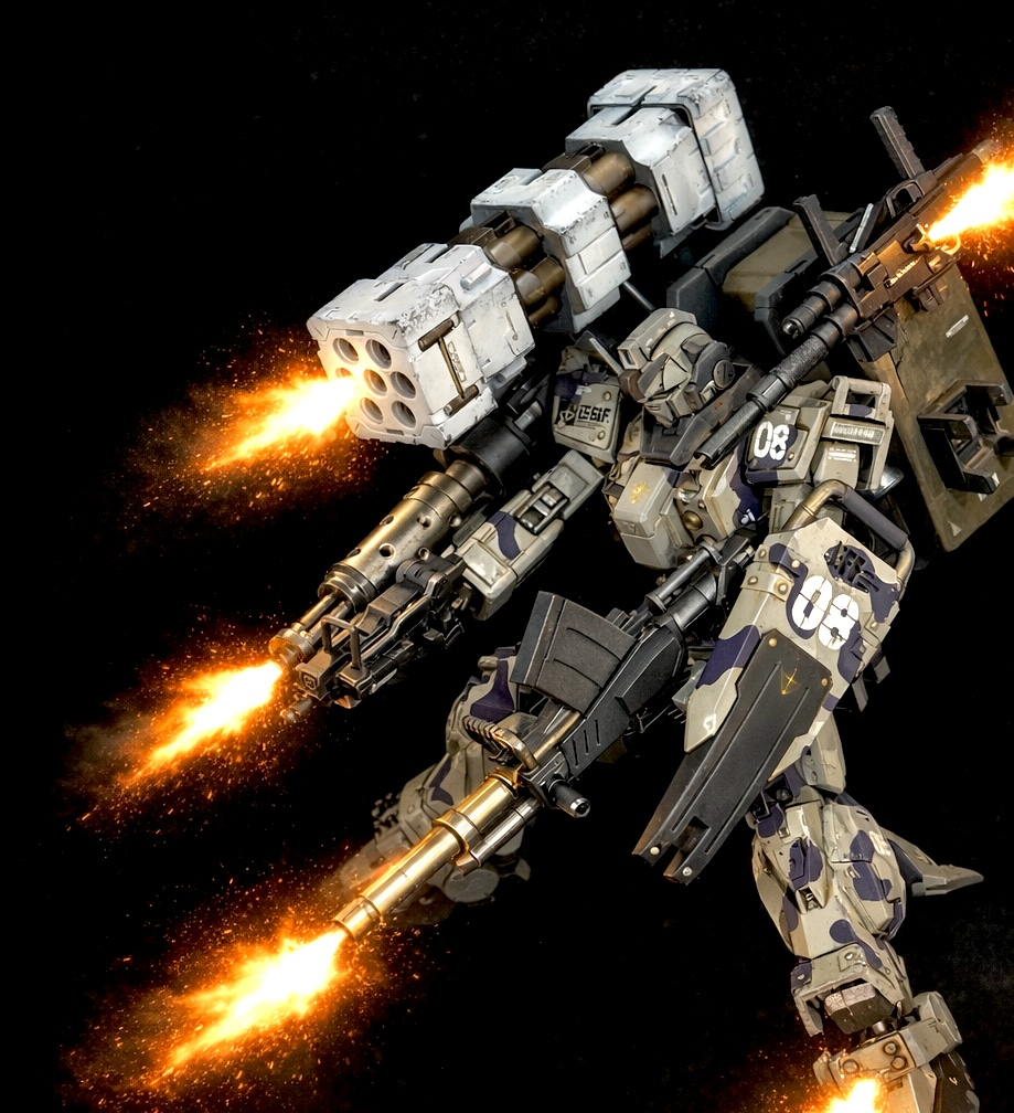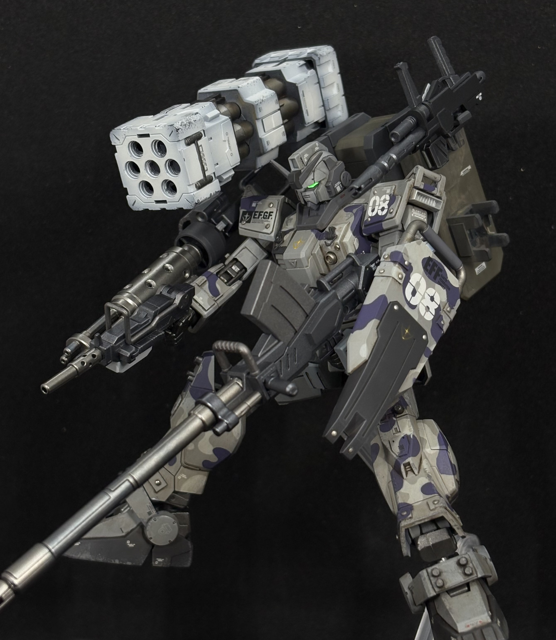 コメント失礼します!武器モリモリでテンション上がります!武器の塗り分けのセンスがあり、デミのガトリングがカッコいいです!迷彩も素晴らしいく、陸戦型のゴツさに磨きがかかってますね。良いものありがとうございます!