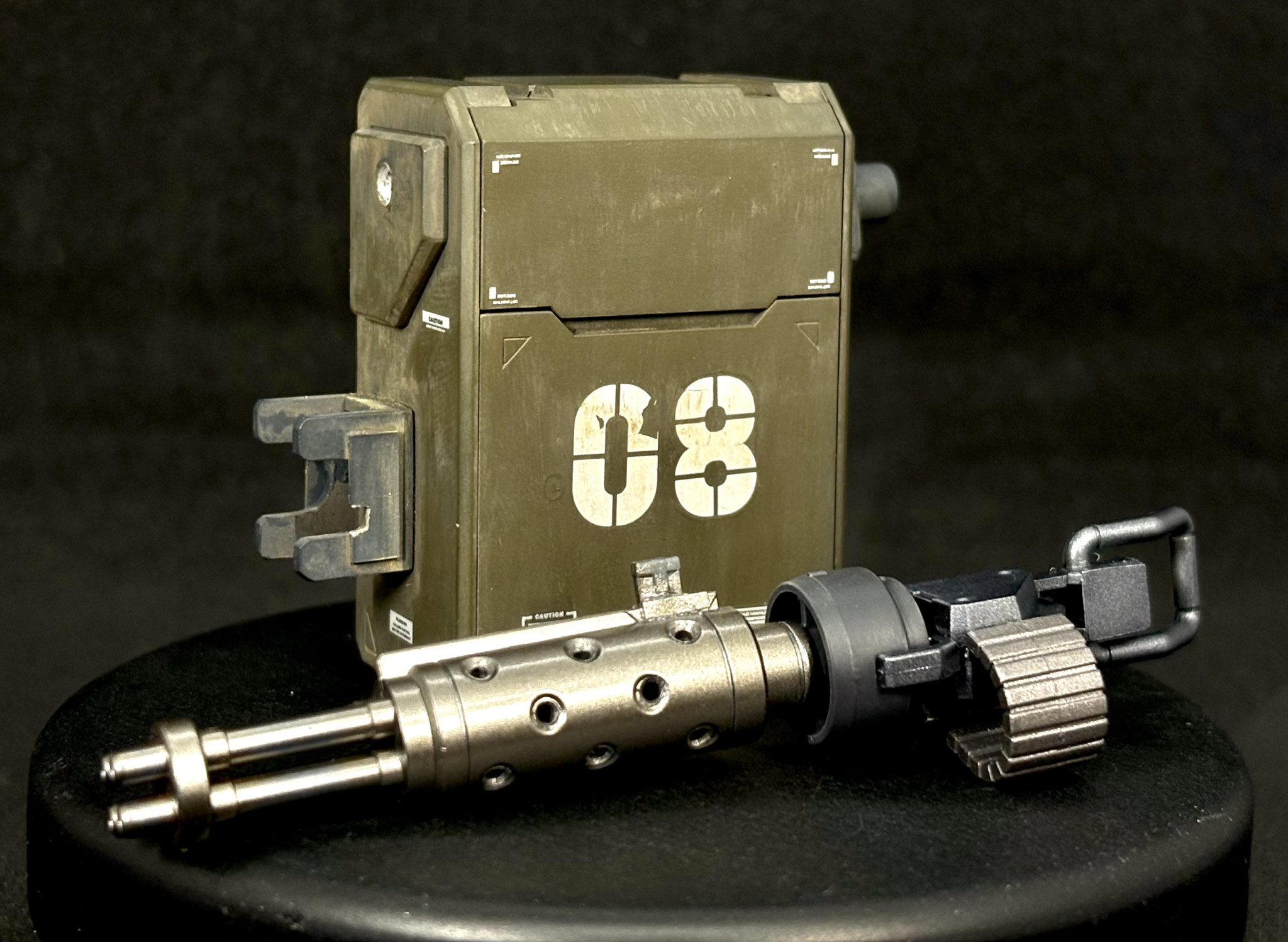 ガトリングはデミトレーナーの拡張パーツから拝借だったと思います。ちょっと長かったので少し短くし、右腕に取り付けても違和感ないようにしました。銃身は穴を空けてリアリティアップ。