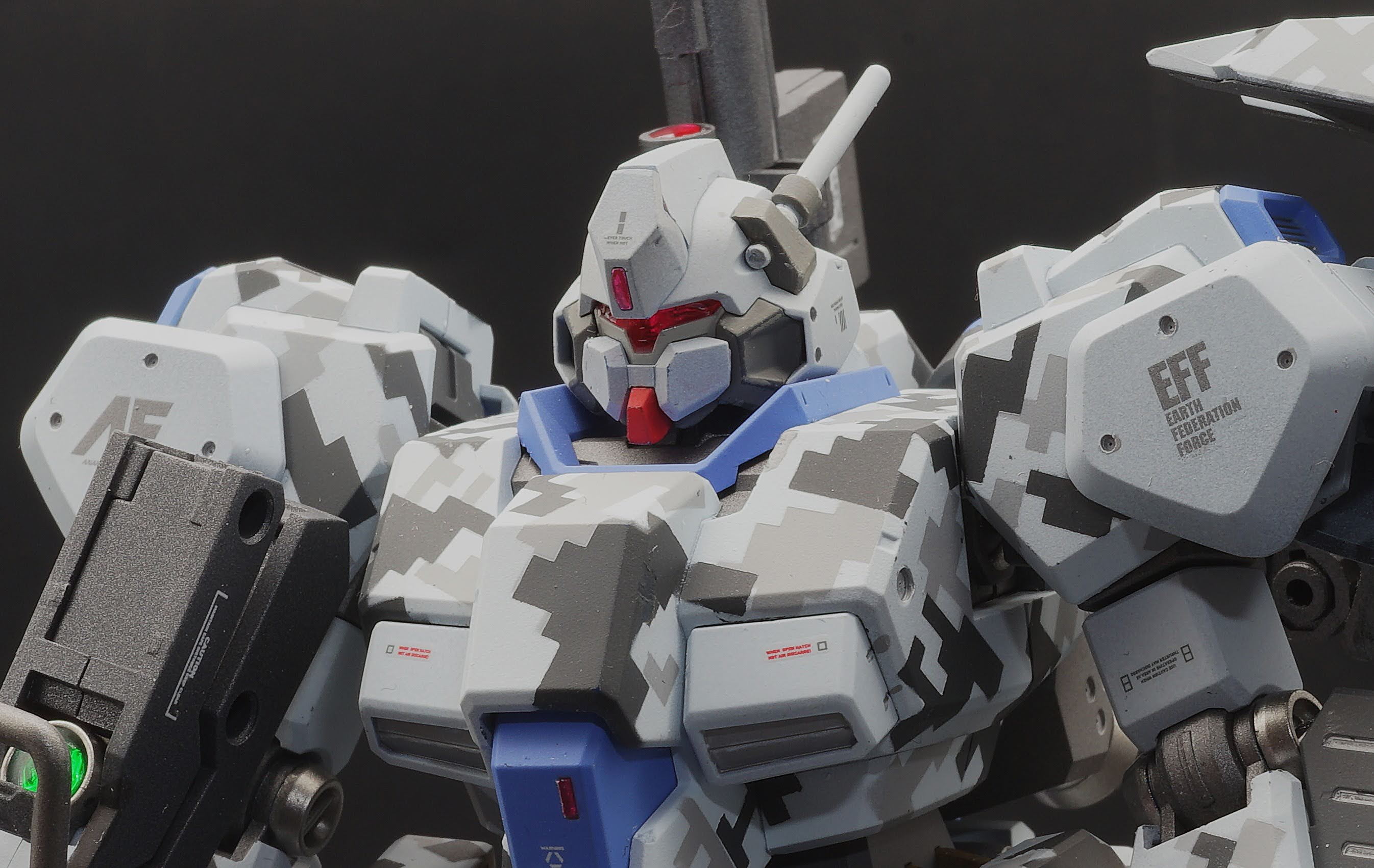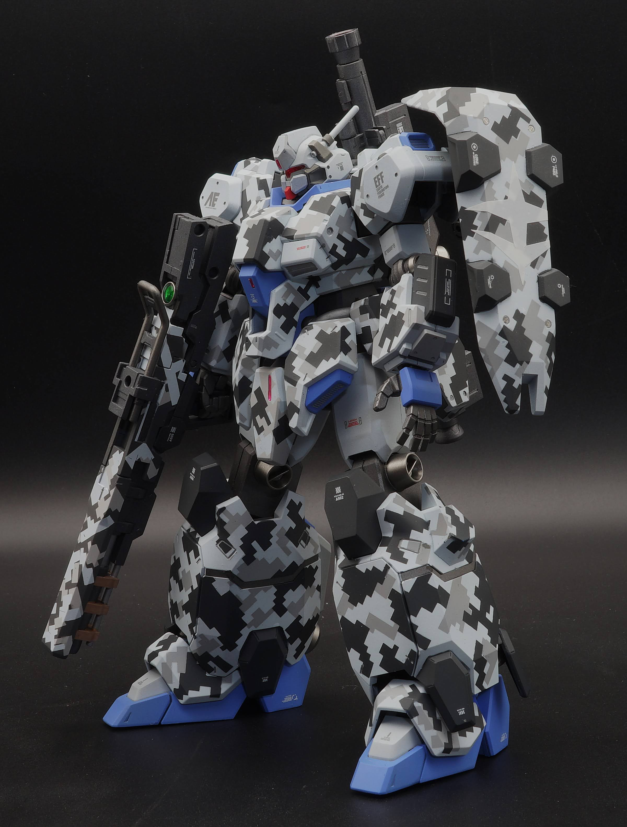 都市迷彩は専用のマスキングシールがあったので思ったより簡単にそれっぽく見えてめちゃくちゃ良かったです。まずメカサフスーパーヘヴィを塗装し、そこからマスキングして明るいグレー、白と三色の迷彩にしました。