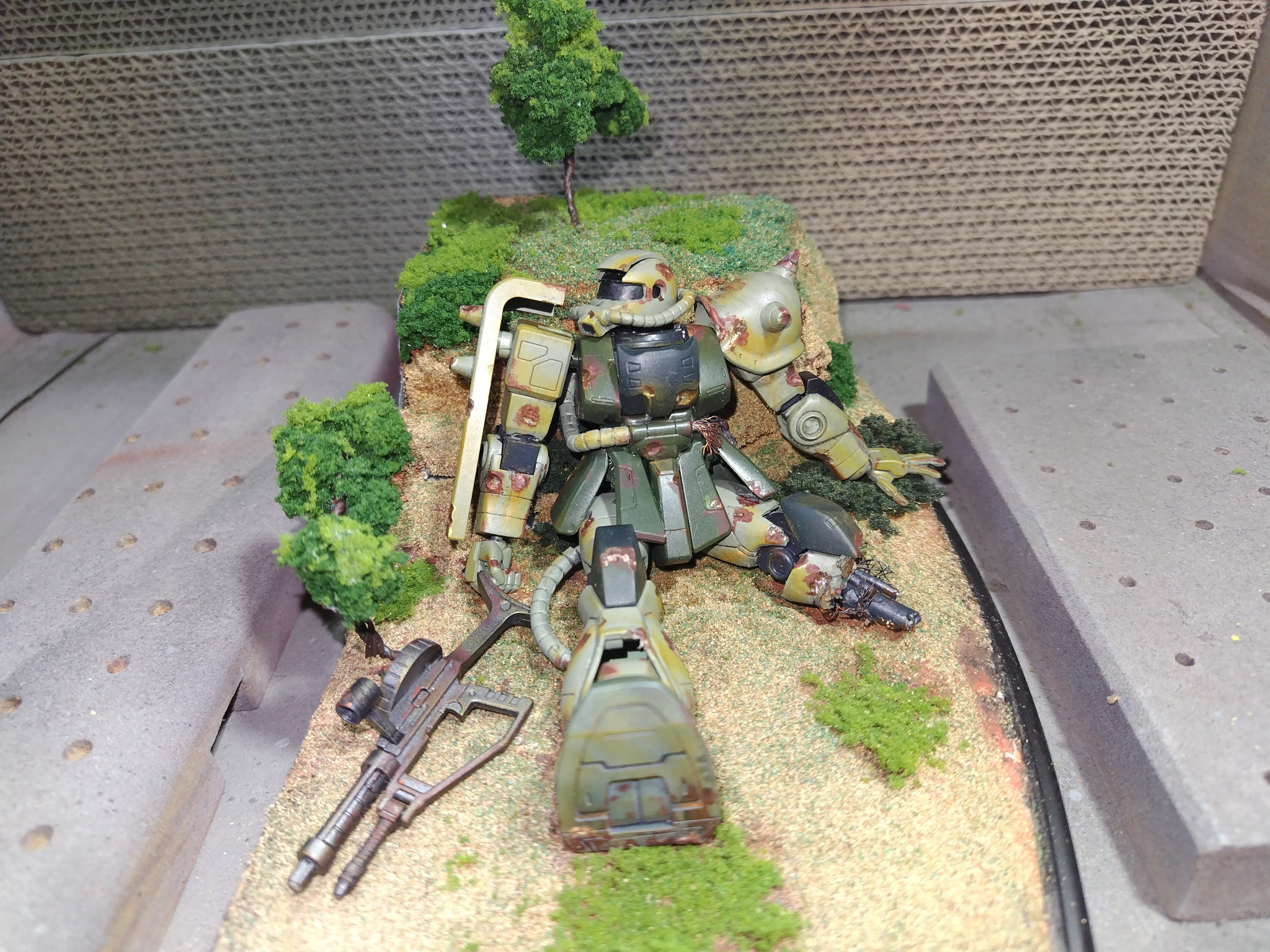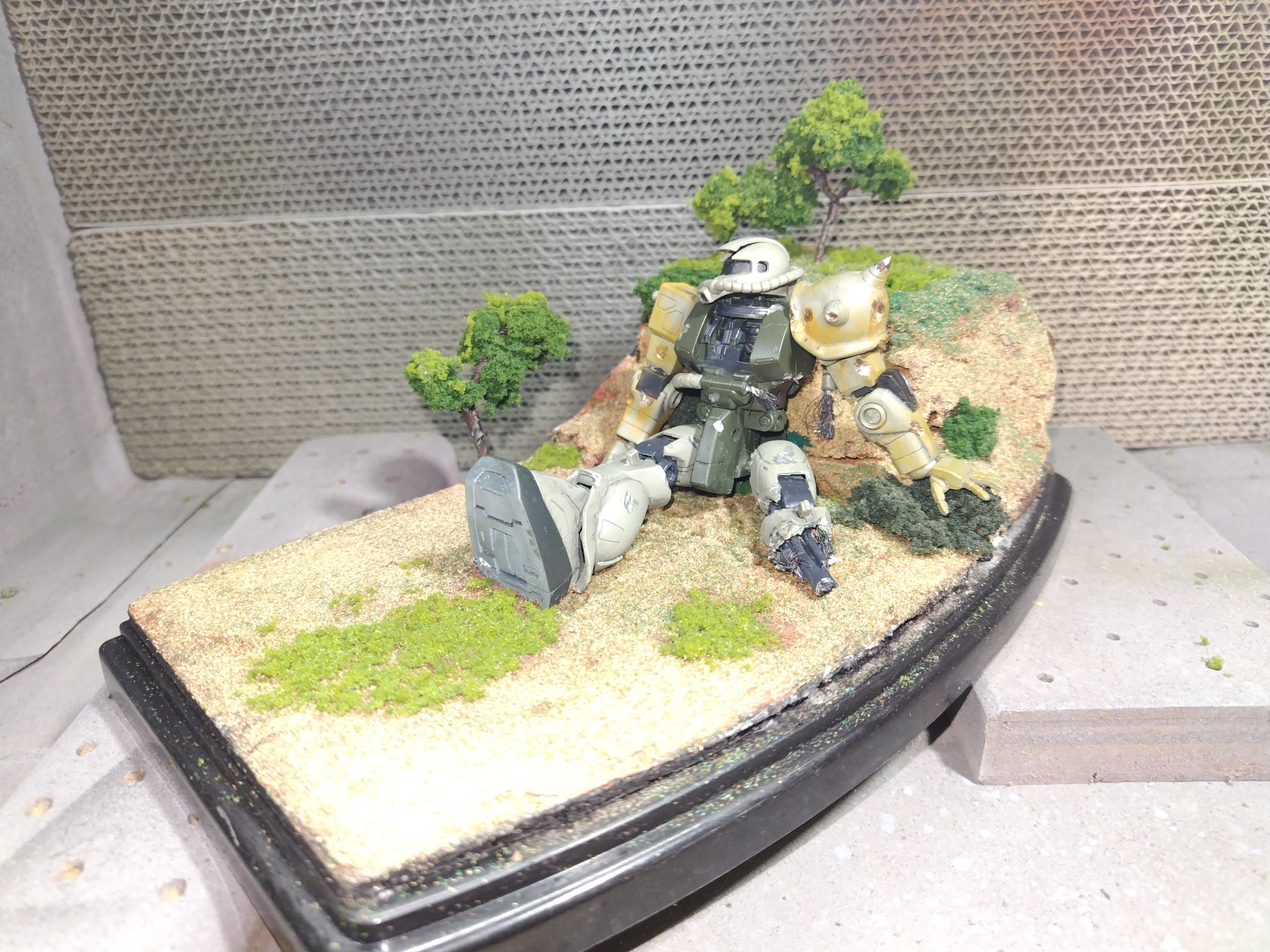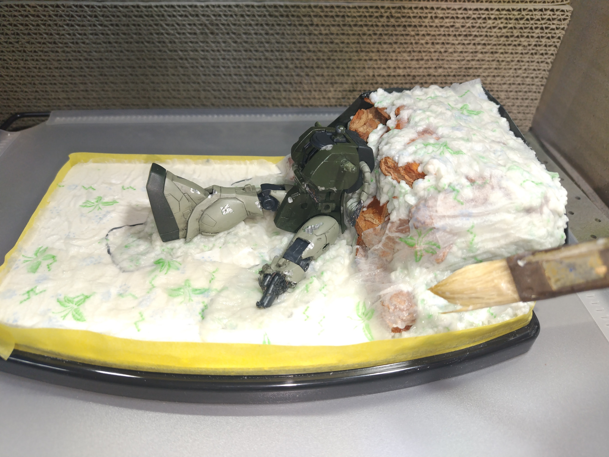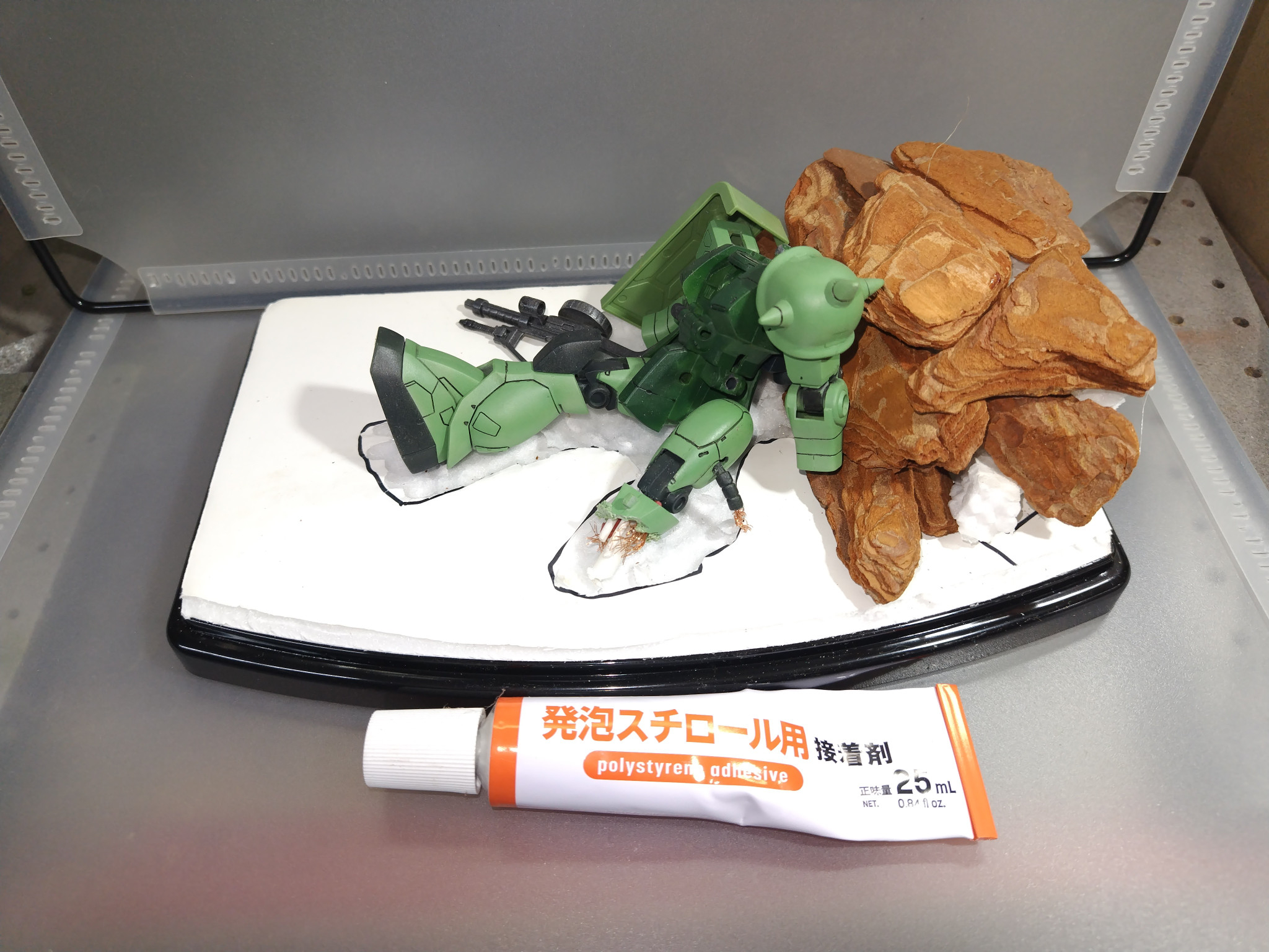 発泡スチロールとバークチップをボンドで貼り付けて、ザクの配置位置を少し掘ります。