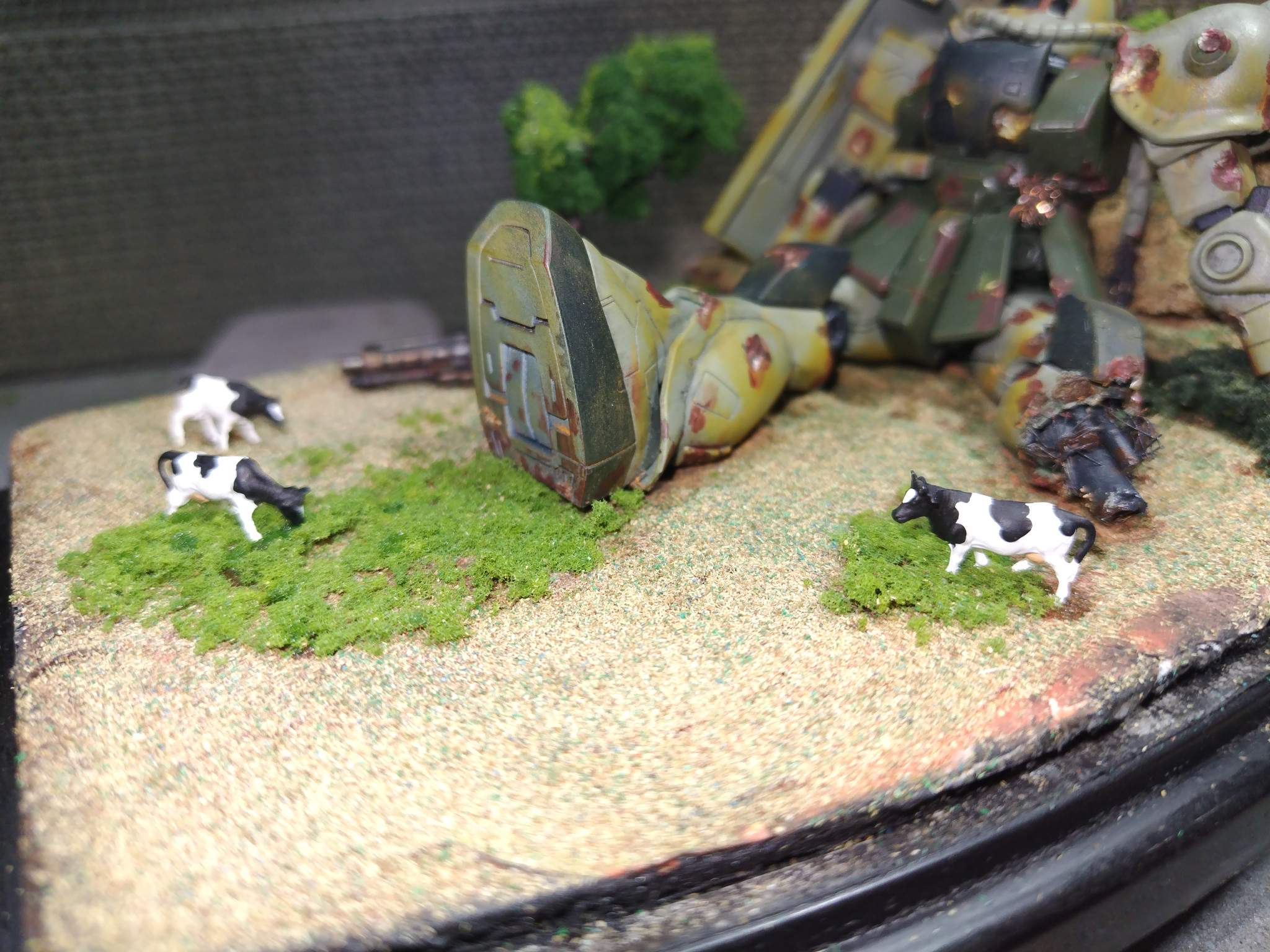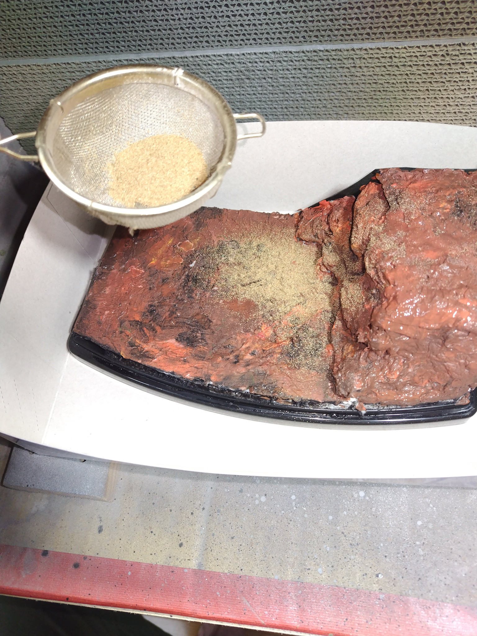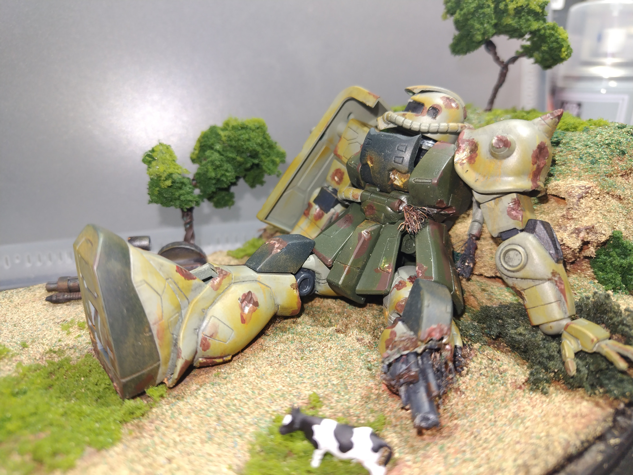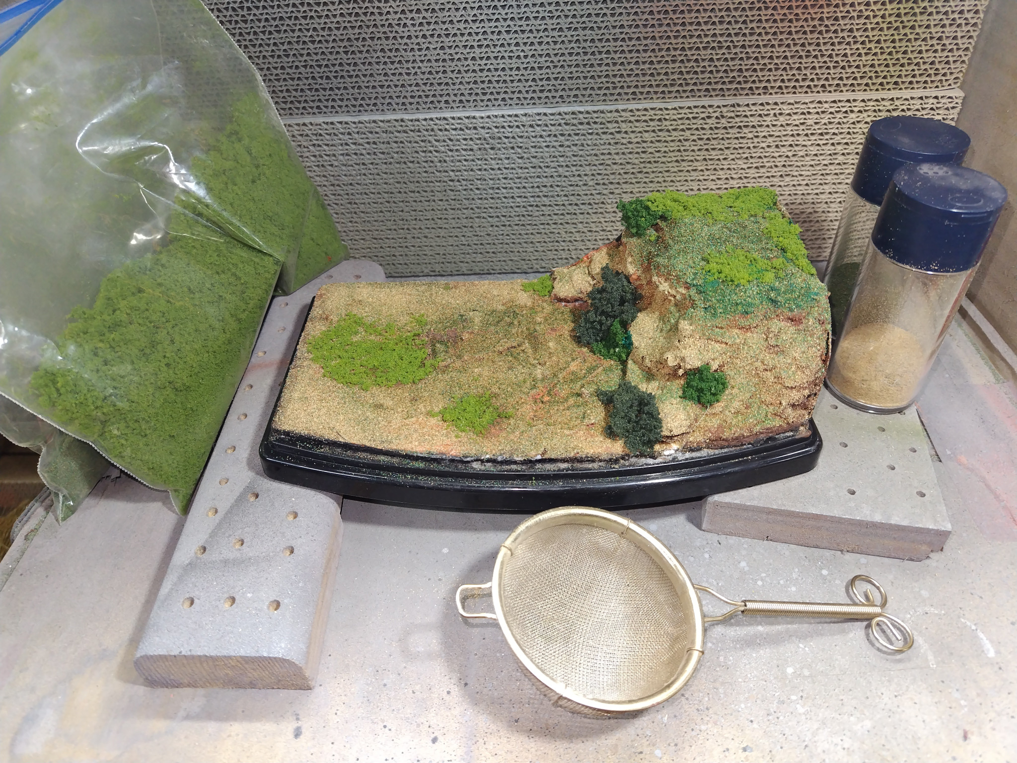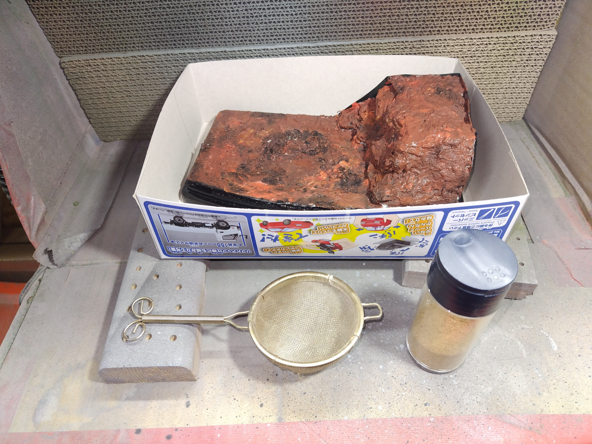 発泡スチロールとバークチップをボンドで貼り付けて、ザクの配置位置を少し掘ります。
