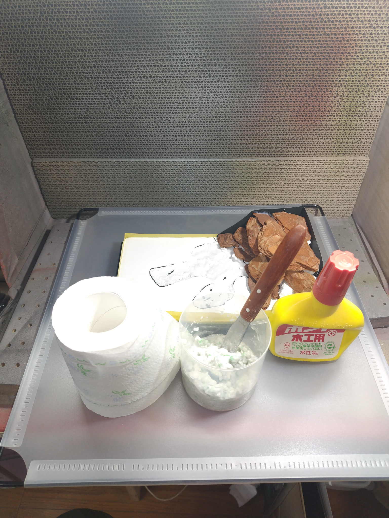 大体の盛り付けが済んだら、まんべんなくトイレットペーパーを敷いて、上から水溶きの木工用のボンドを染み込ませます。しわが出来たり破けても気にしません。