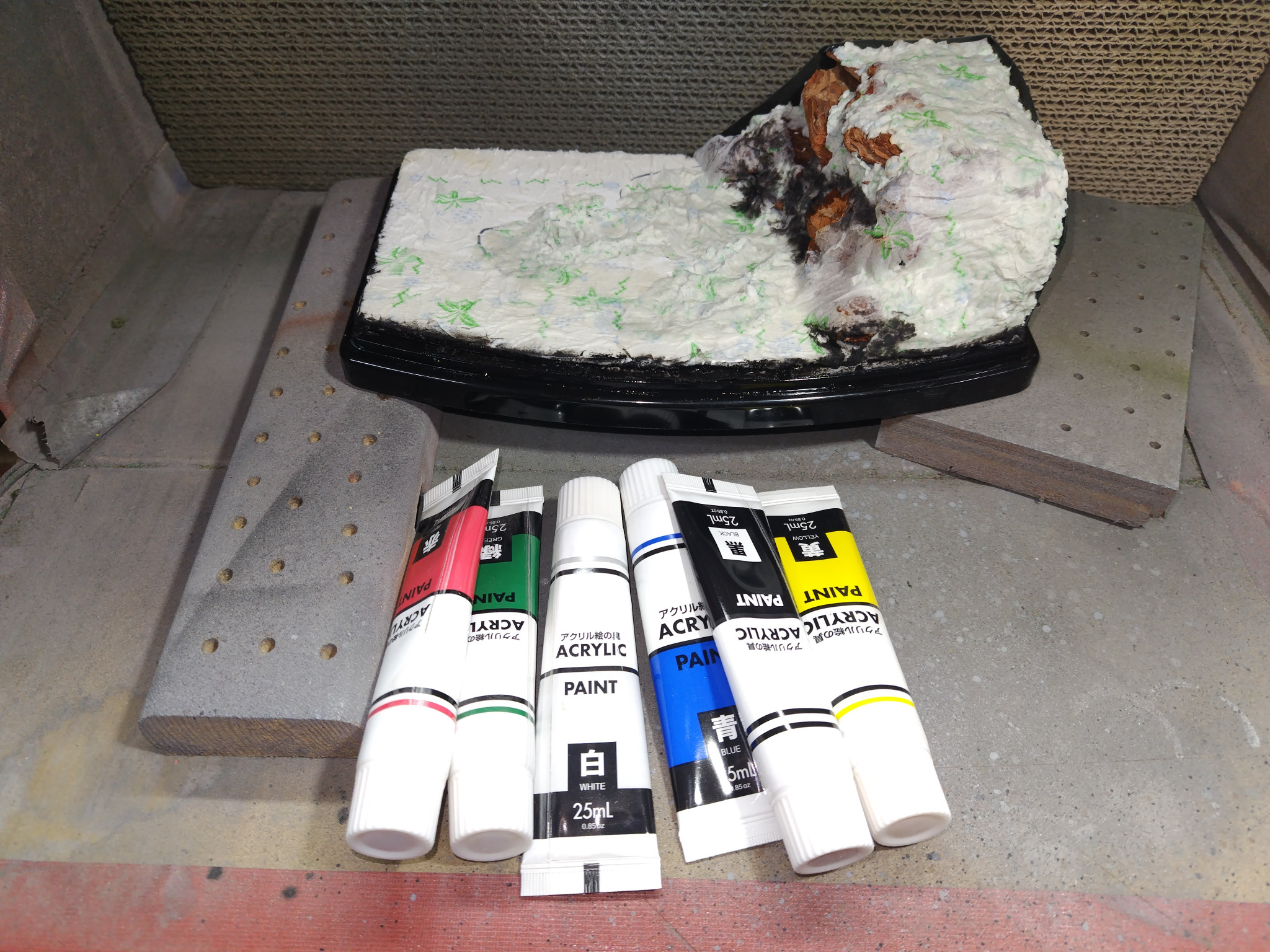 3日程すると大体固まりますが、柔らかくても大丈夫です。本来はスプレーで色塗りしますが、今回はダイソーのアクリル絵の具を使用します。多分、かみなので普通の絵の具でもいけると思います。