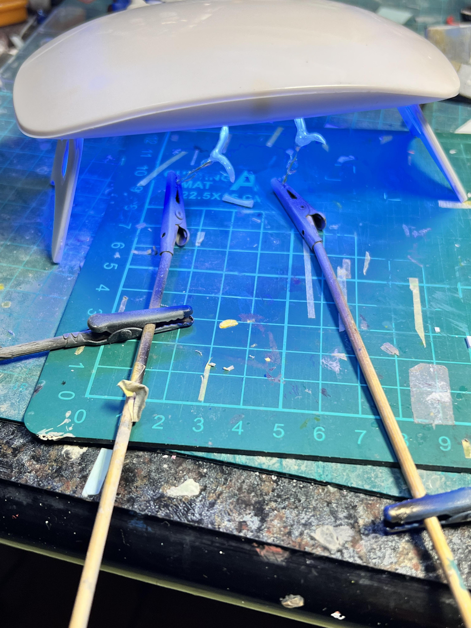 扇子から飛び出す水柱は真鍮線とプラ版にレジンを塗り固め、クリアブルーを塗って仕上げました。