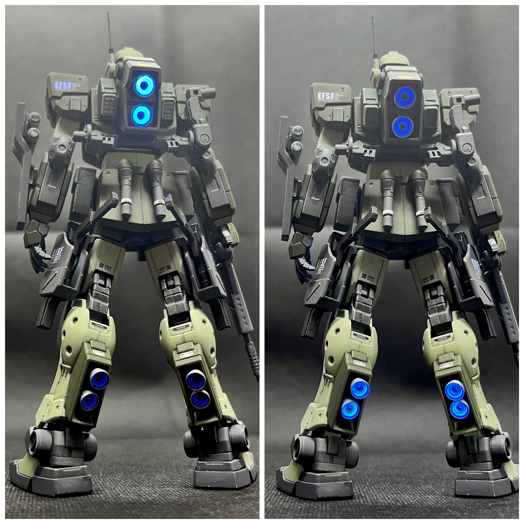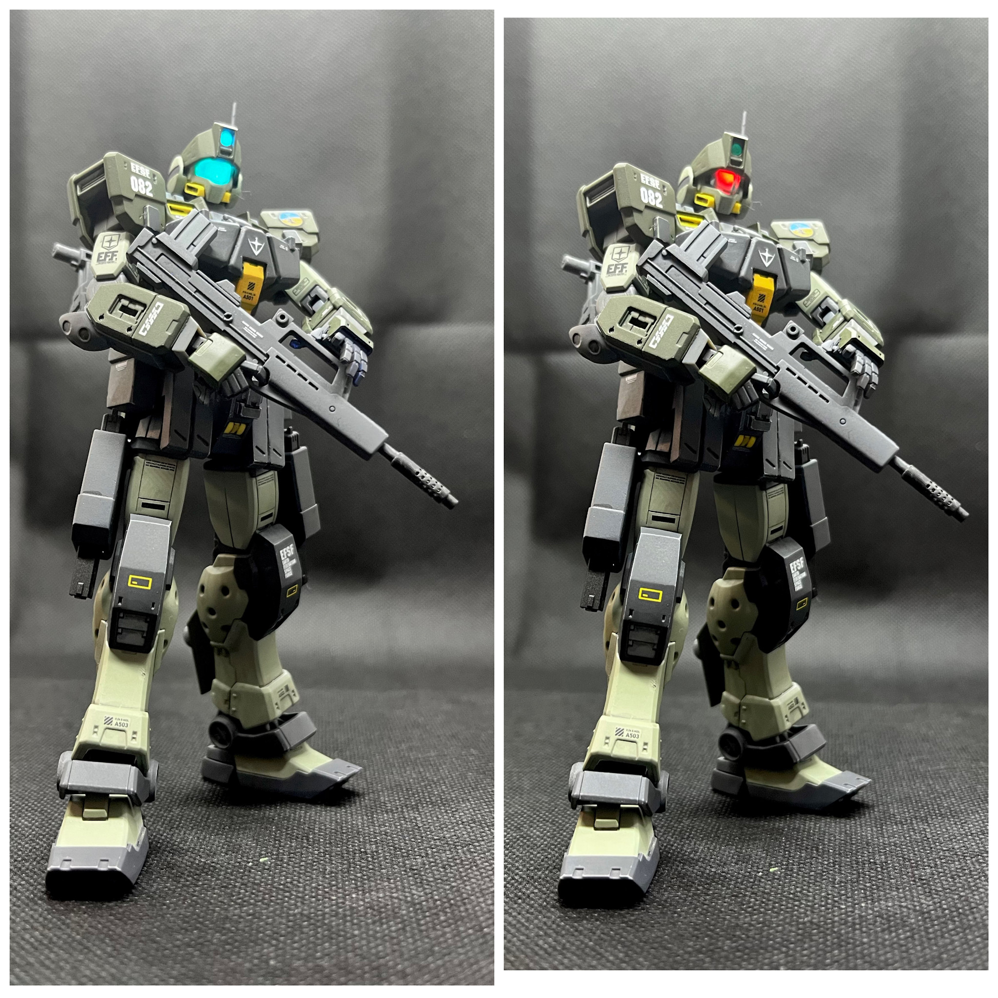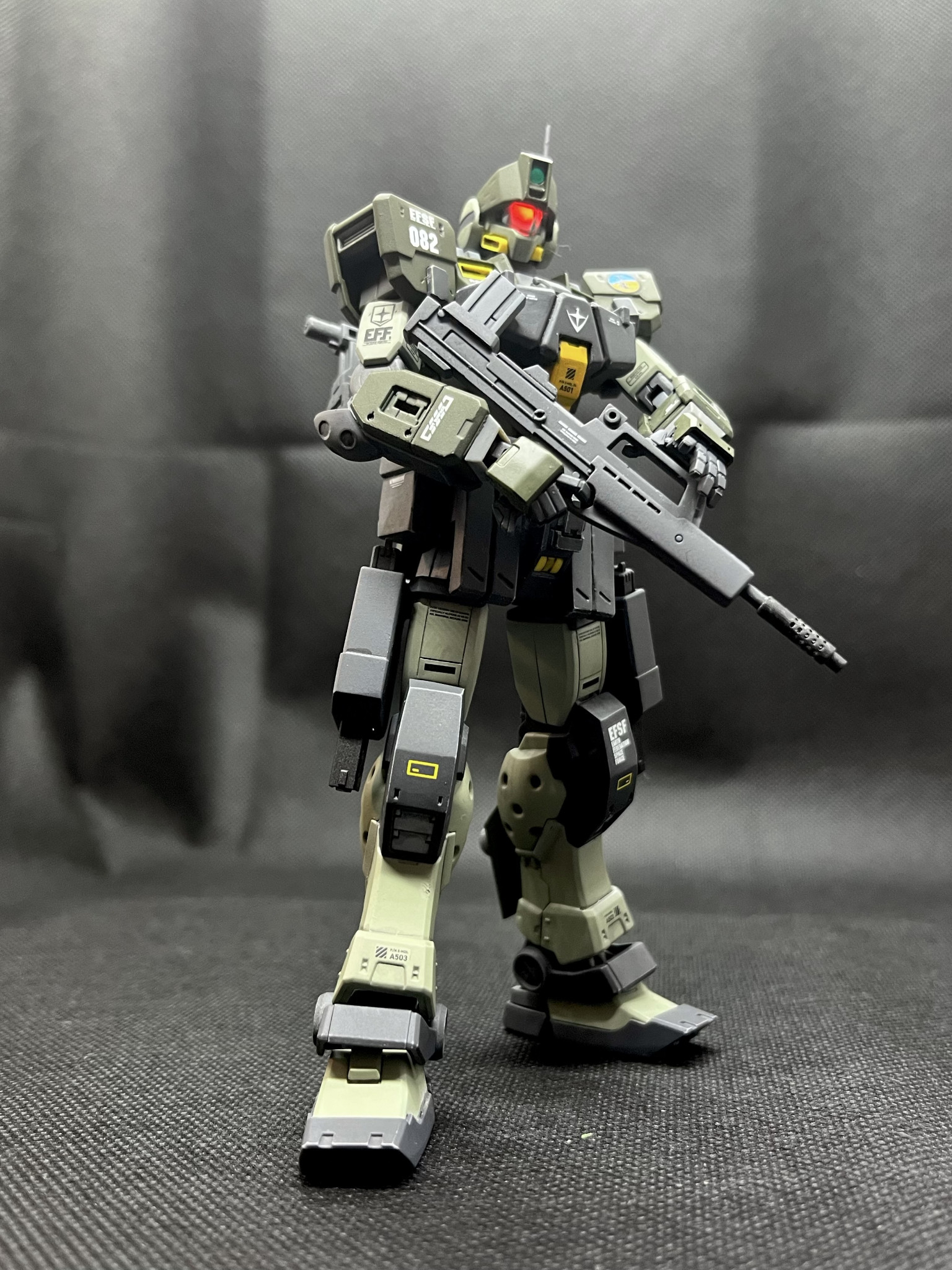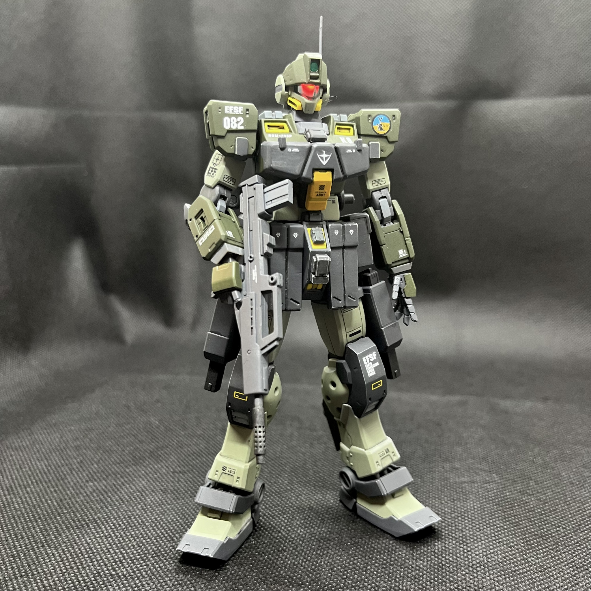 スナイパーライフルを背中に背負って、中距離での格闘スタイルで。ライフルはジムキャノンⅡのものを改造(マガジンを上下逆に付け直し等)したものを。