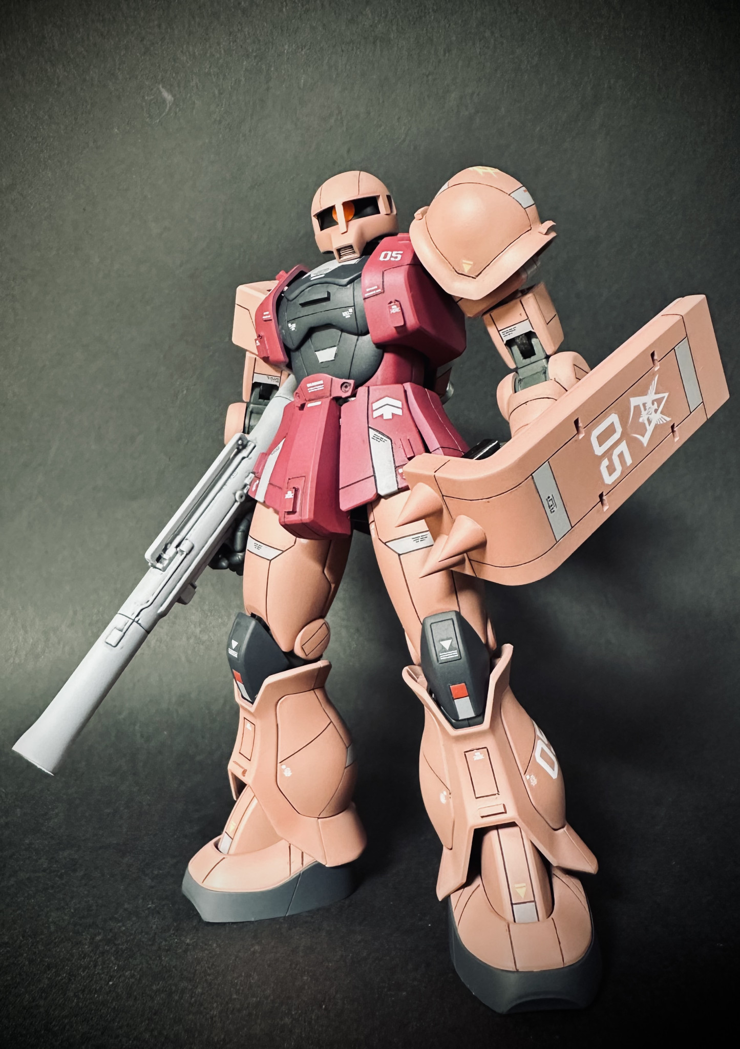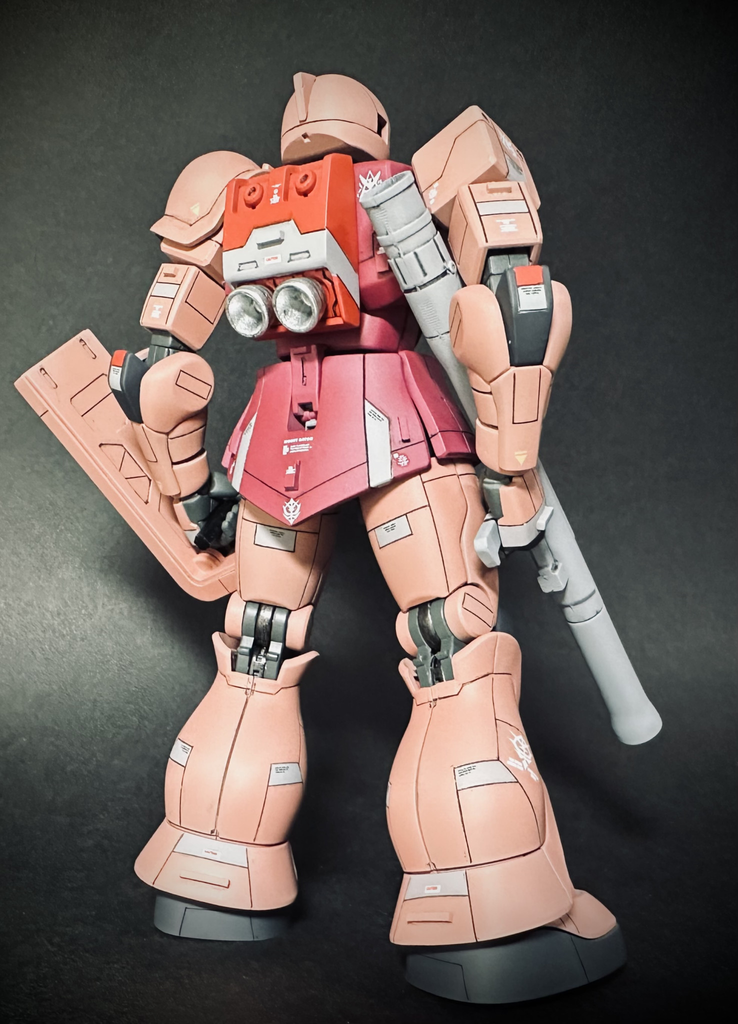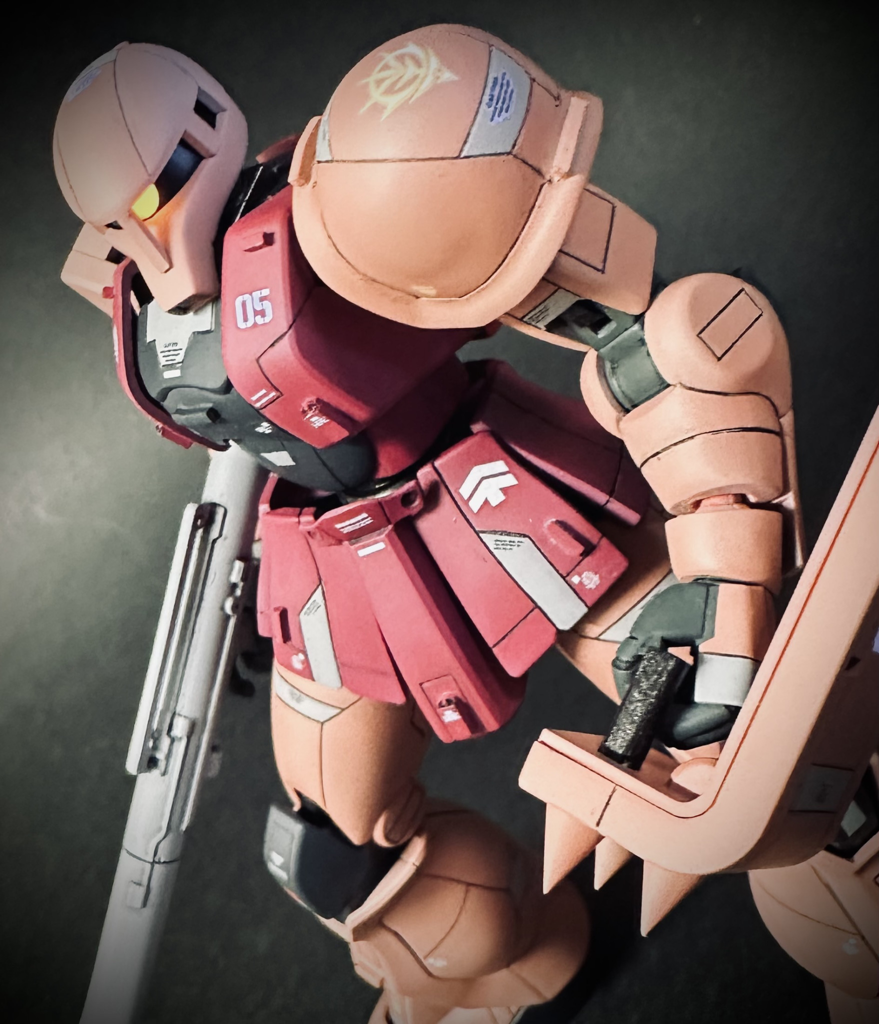 先に完成&ガンスタ投稿した友人がノーマルカラーだったので私はシャア専用カラーにスジ彫り&部分塗装&余物デカールで仕上げてみました。