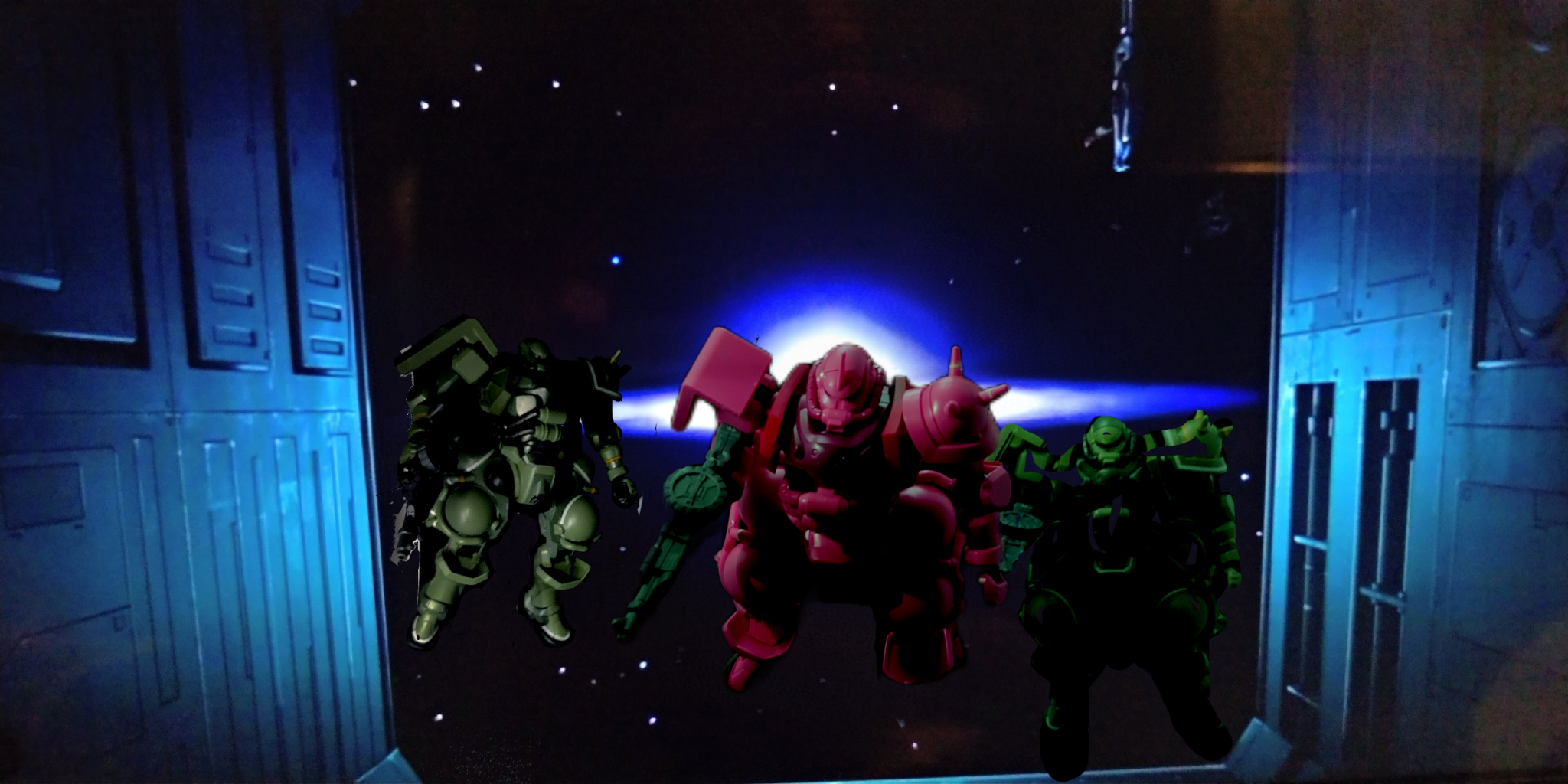 サイド7潜入捜査作戦、ファースト好きにはこのシーンは外せませんよね。早速再現してみました。上の突起物に肩がぶつかり宇宙へ跳ね返っていくシーン、GQでも再現されてましたね。