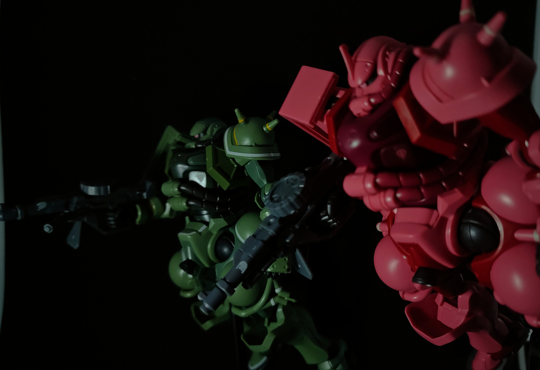 ツーショットで並べてみました。やっぱり赤い機体は存在感があります。赤いザク、ニュータイプじゃなくてもあの人が乗ってるって分かりますよね。