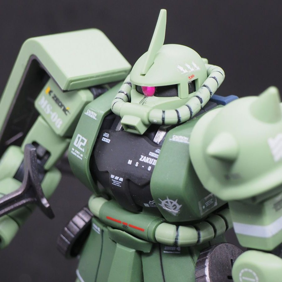 モノアイはデコシール、武装類やシールド裏は焼き鉄で塗装、デカール増強しています(zaku-kao5)