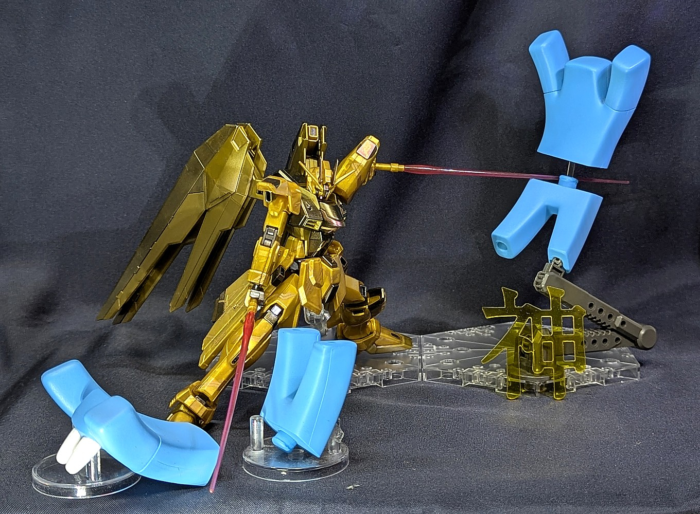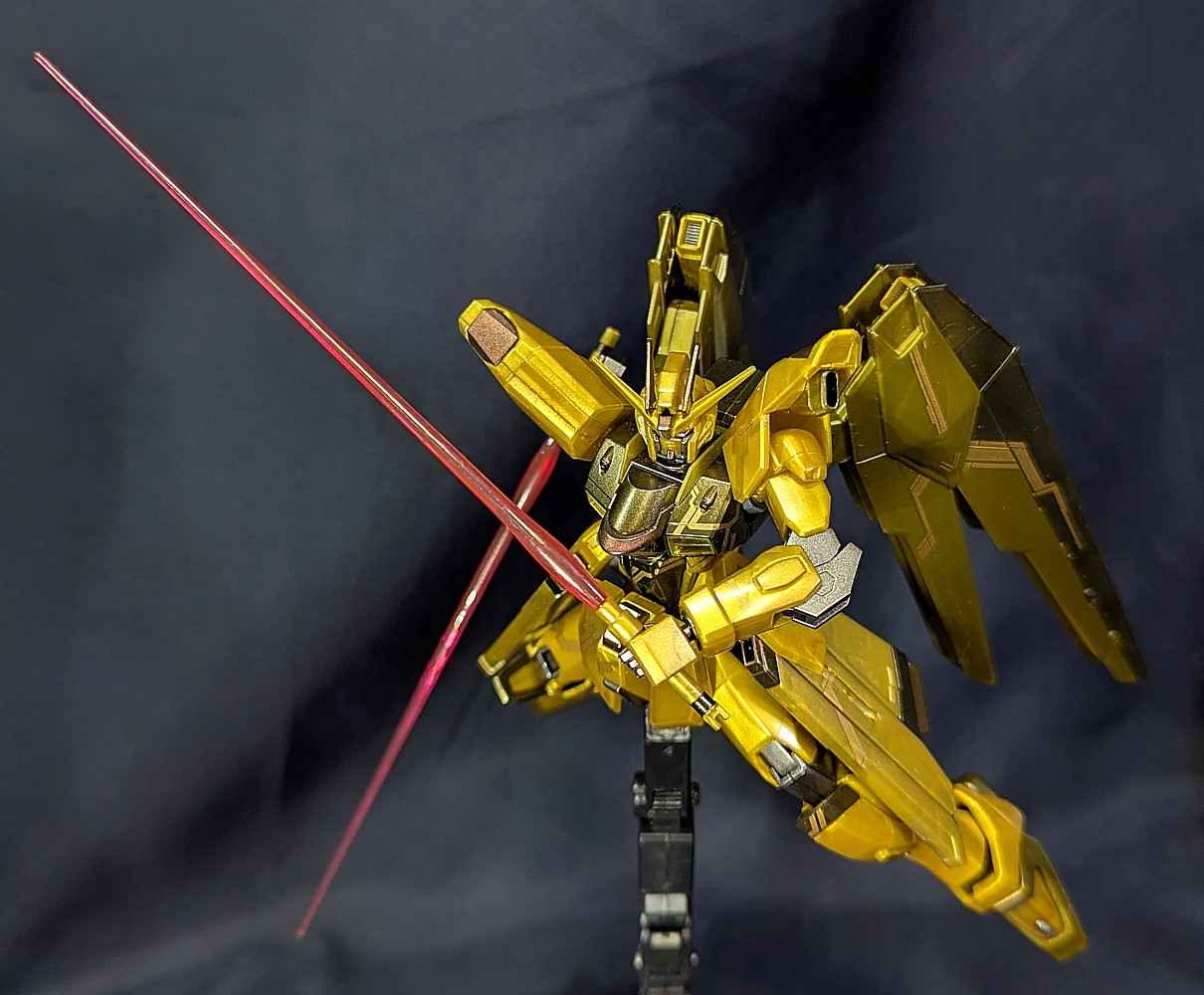 と言いつつも、デカール作業前の過去作状態で全体に光沢クリアにゴールドを極少量混ぜたものを、関節はガンメタ、元が赤いパーツには偏光塗料のマゼンタゴールドを塗装してます