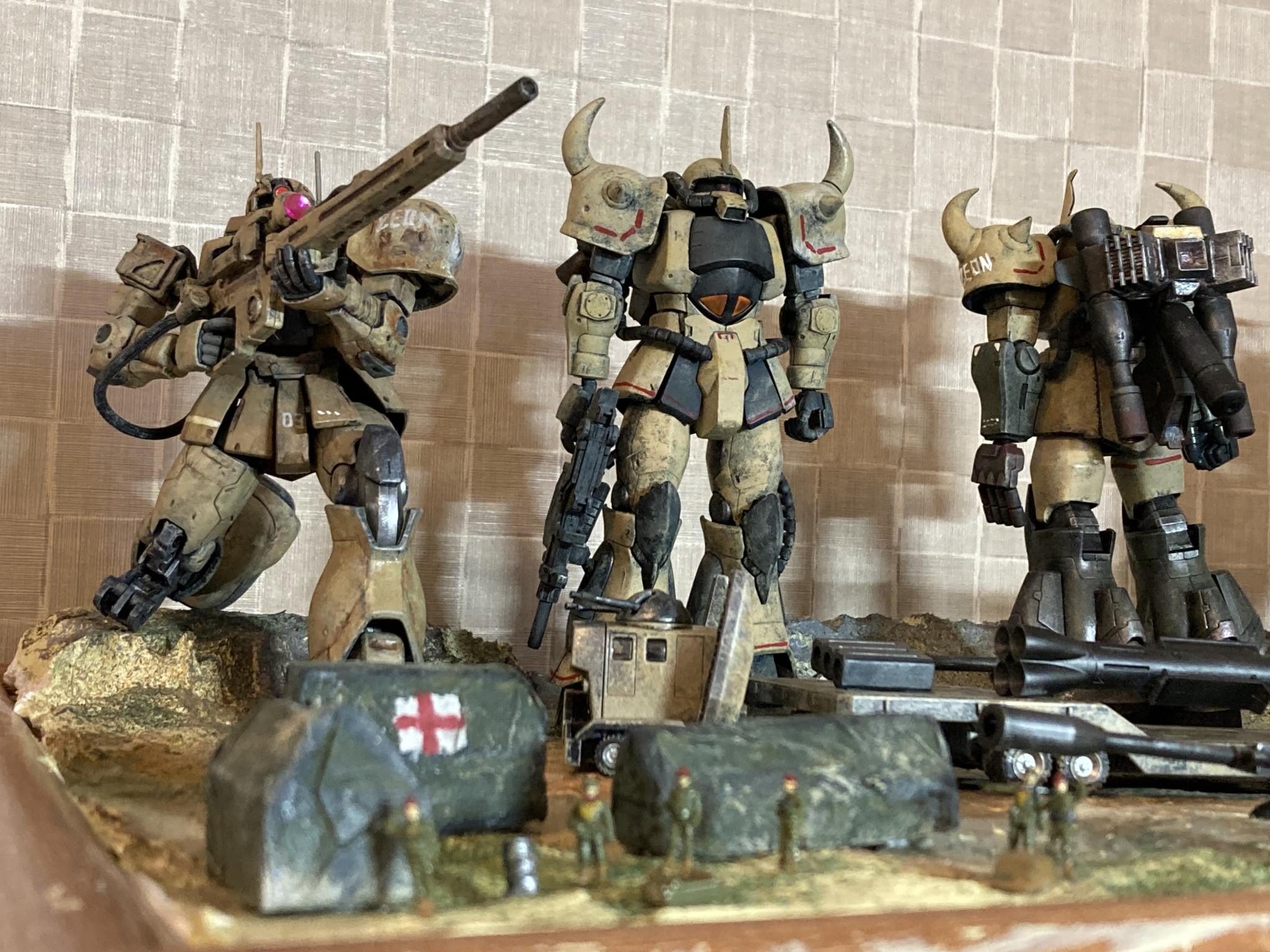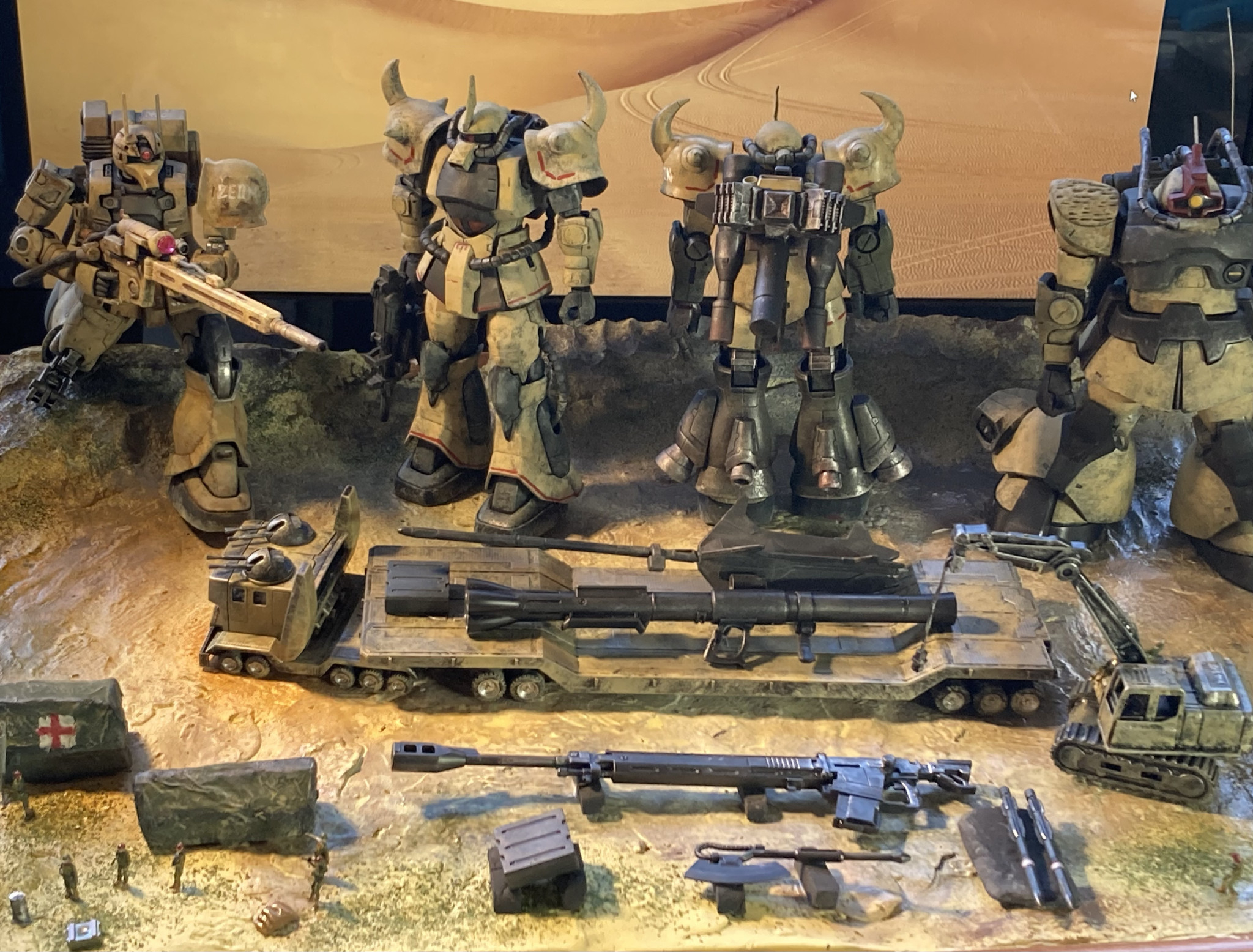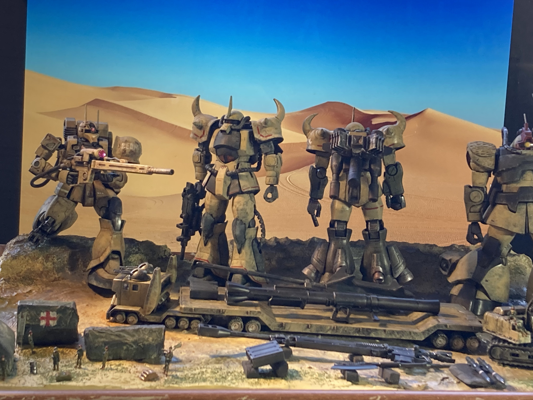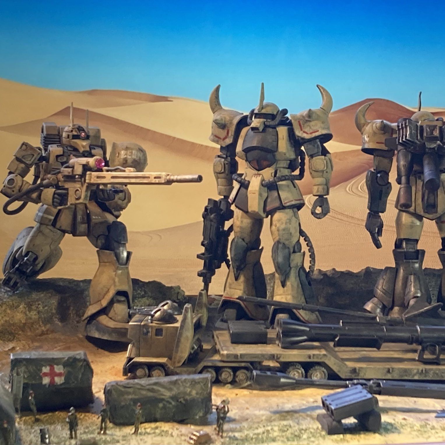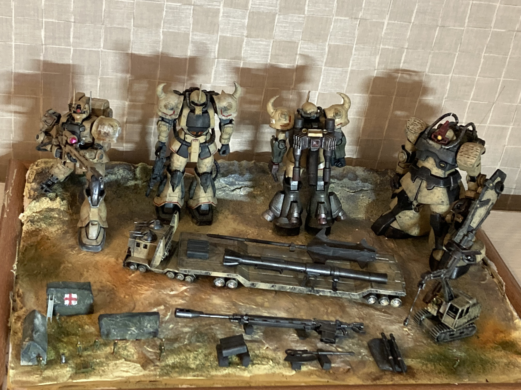 ダレヤ?ローガンツ HG 2026.02/23更新 砂漠の駐屯隊 オマージュ(こんなんもんでごめんなさい😢) 40 45 いいねしたモデラー(45) 1 0 作品を共有 伝説のジオラマ 川口名人の砂漠の駐屯隊をオマージュ‥こんなんで、すいません😭 サムソントレーラーにはザクではなく、武器類を載せました。武器の積み下ろし作業的な雰囲気で‥上から。クレーン車、兵士はダイソーから入手です。背景なしで。テントは紙粘土をこねこね。サムソントレーラーがくると、急にスケール感が増しました。全体の景観。ドムさんが、ちょい寂しい‥この絵面もいいですかね。クレーンの兵士が暇そうでいい感じです^ ^今回もご覧いただきありがとうございました😭 砂漠の駐屯地 ドム グフ ザクスナイパー サムソントレーラー 砂漠戦仕様 砂漠 ジオラマ コメント コメントをして応援しよう コメントにはログインが必要です ウドの珈琲屋 2時間前 情景はいいですね〜♪お見事です(*^^*)私は一機仕上げると気力が尽きてしまうので情景作品を作られる方には尊敬しかありません。 ダレヤ?ローガンツ 40年ぶりのガンプラ再開。 プラモ作成には拡大鏡が必須! 楽しいことはいい事だー!^_^ 6 北アフリカ戦線 モビルスーツテスト部隊 ドムホバーテスト機砂漠戦仕様という設定です. 先日から投稿し… 7 グフ砂漠仕様試験機 グフ砂漠仕様、先日投稿したグフ砂漠仕様よりも、脚部推進力の向… 5 熱砂の戦い‥グフ砂漠戦試験機 リバイブ グフを砂漠戦試験機という設定で製作しました‥ 7 エクスターミネーター‥ブラックドッグ隊 先日投稿したジムスパルタンのカラーリングをブラックドッグ隊仕… ダレヤ?ローガンツさんのページ この作品をお薦め作品に設定する Please login to update your profile! Please login to update your profile! Please login to update your profile! Please login to update your profile!