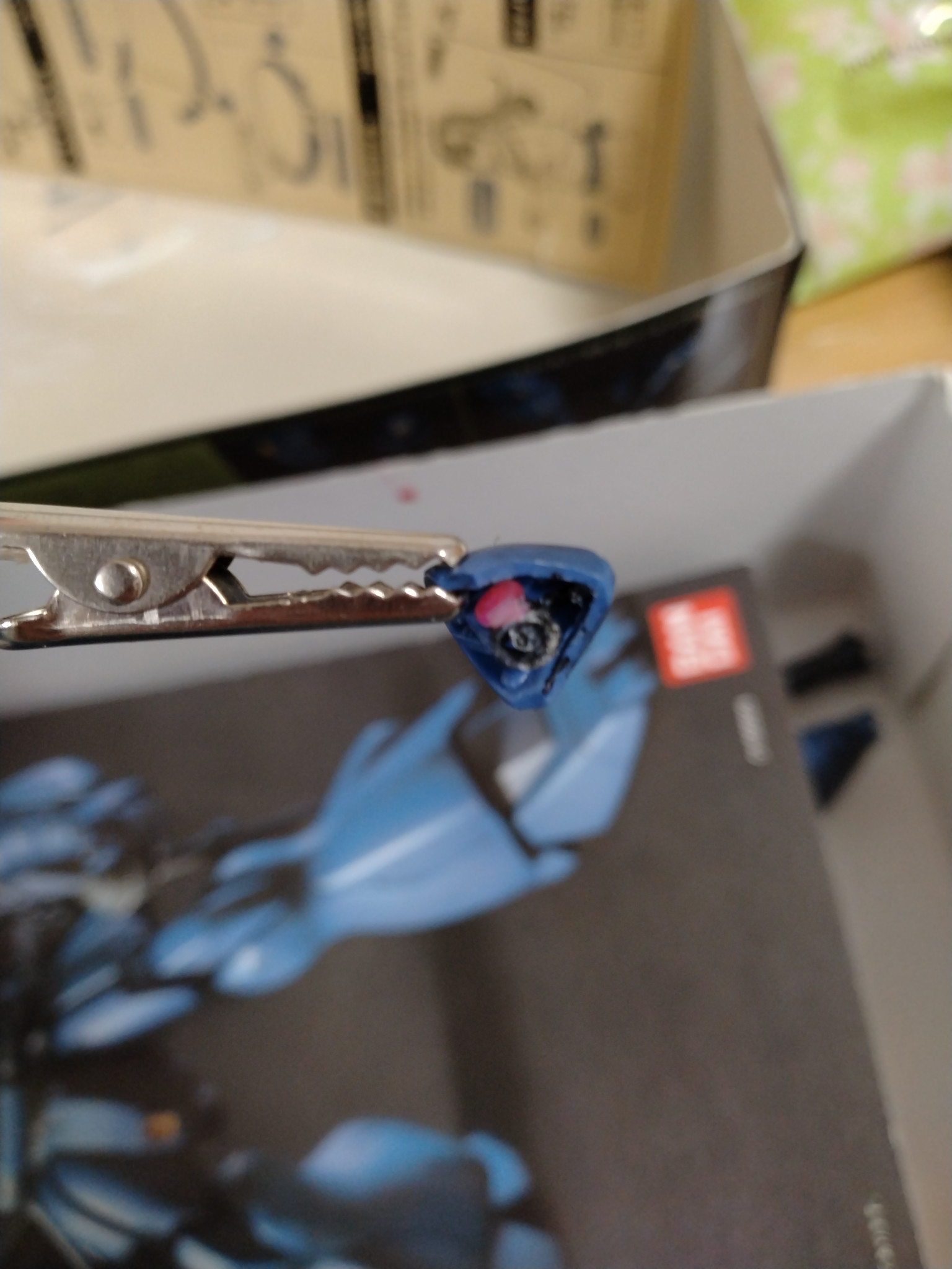 中身はこんな感じで、中に電線通して腕に仮止めしてます(ピンボケしてますが…)
