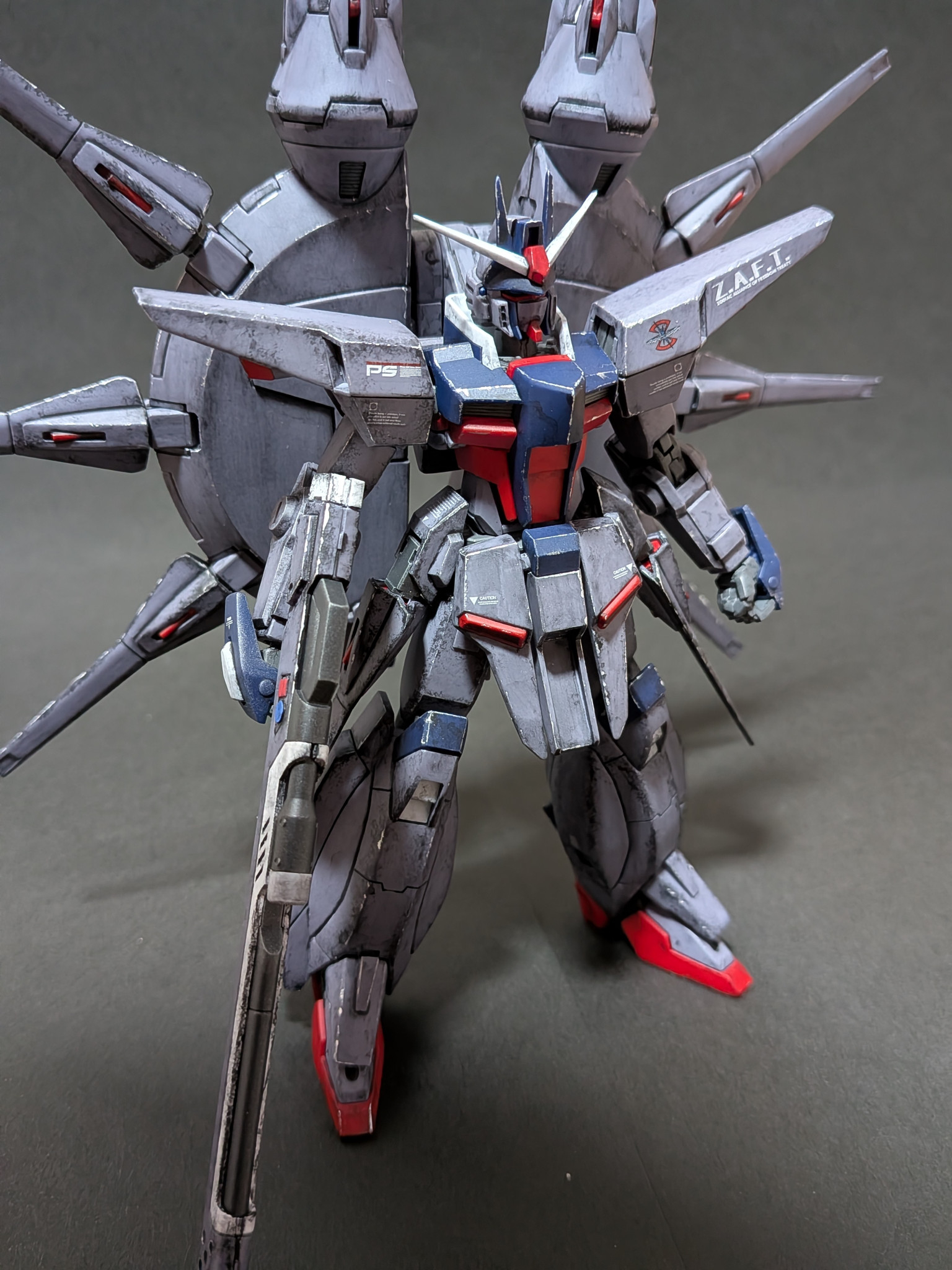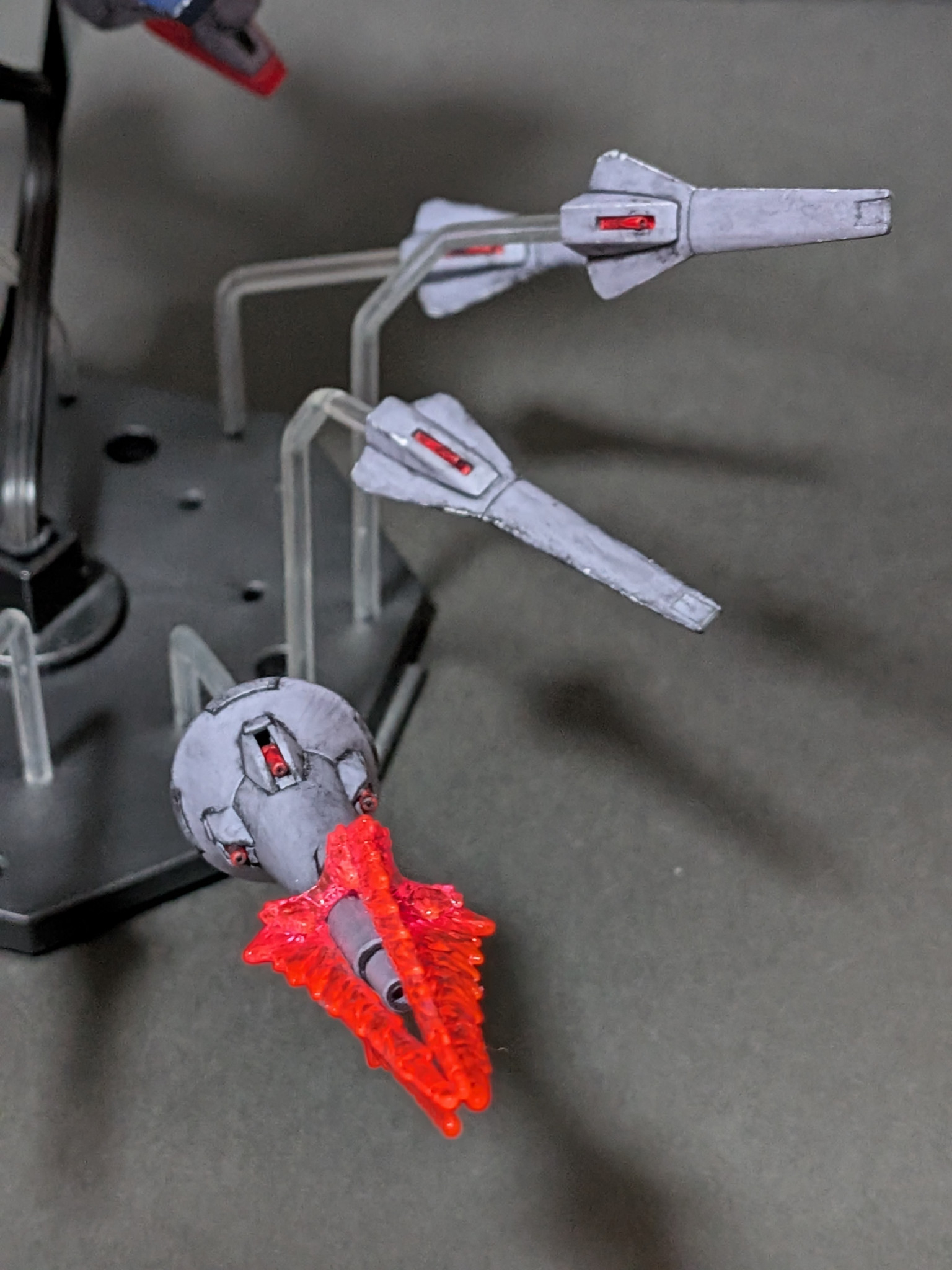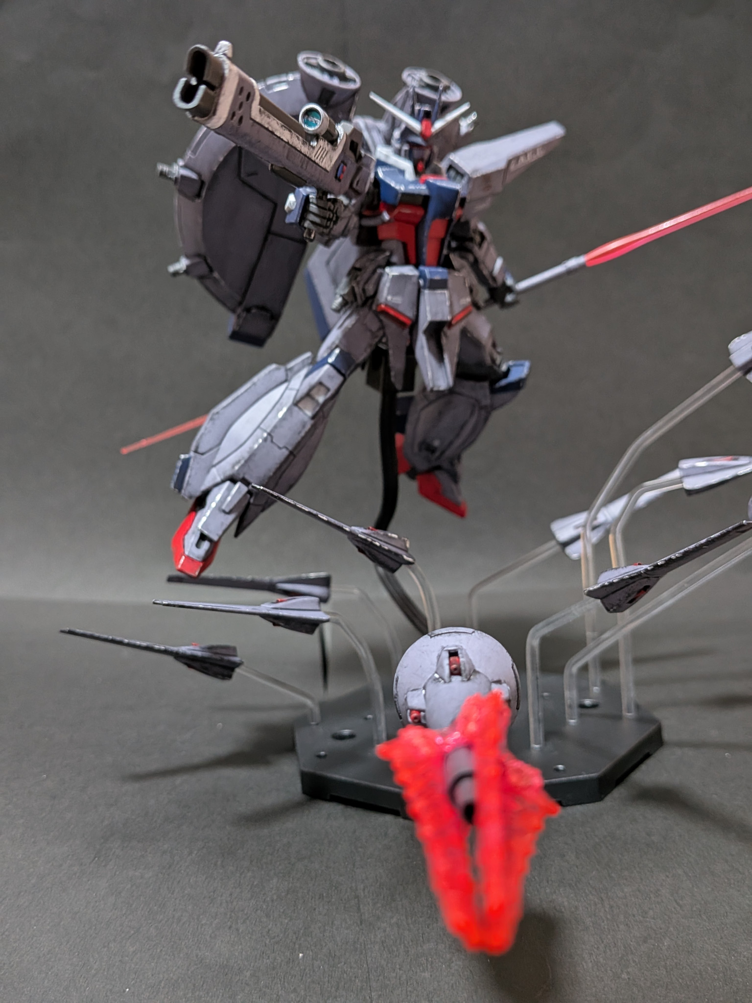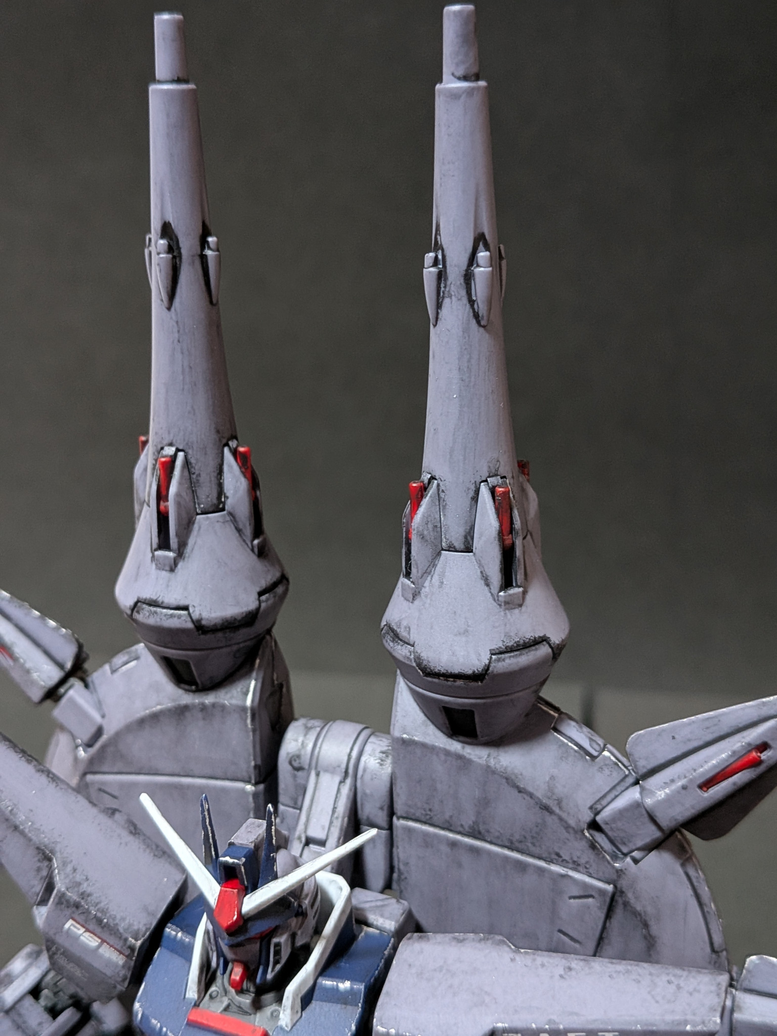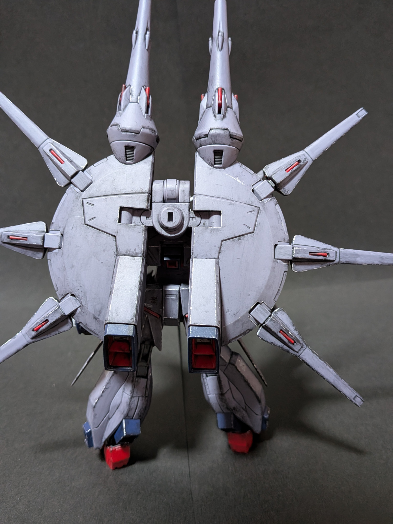 全体をいつもの様にウェザリングし塗装箇所はフレーム、ビームライフル、大型ドラグーン内部等部分塗装して残りは成形色のままです。