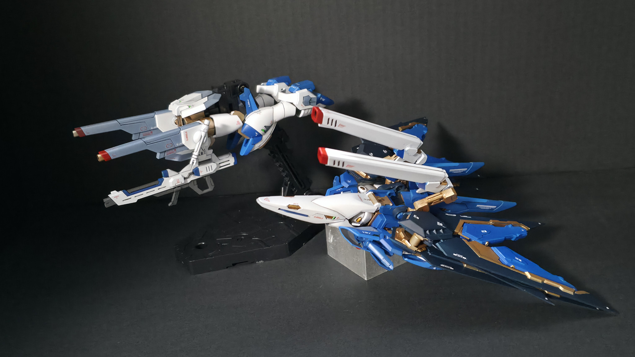 以前ジャスティスを作ったとき、上半身と下半身を繋ぐボールジョイントが折れてしまった経験があり、ネオジム磁石に接続方法を変えたのですが、何となく下半身をいじっていたら飛行形態で行けそうだったので、チェストフライヤーとレッグフライヤー形態もとれるようにしました。