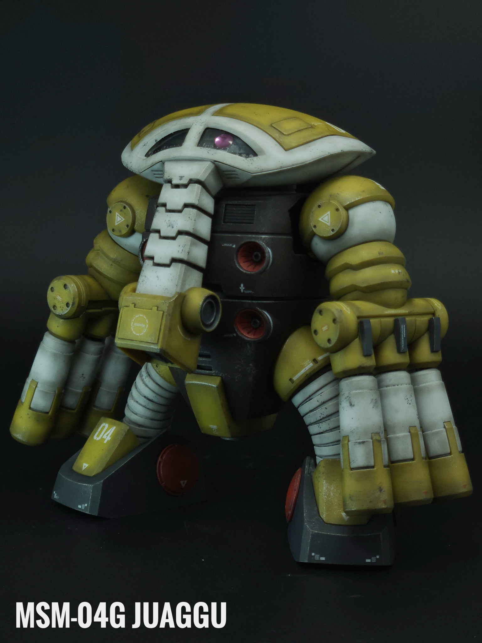 この巨体にしては可動範囲がかなり優秀です。モノアイの可動はもちろん、鼻(ゾウの鼻)にリード線が入っていて表情をつけられたり、6本指が独立可動したり、腰の回転も可能です。唯一、脚部のパイプには関節がありませんが、全体的には十分満足できる出来です。