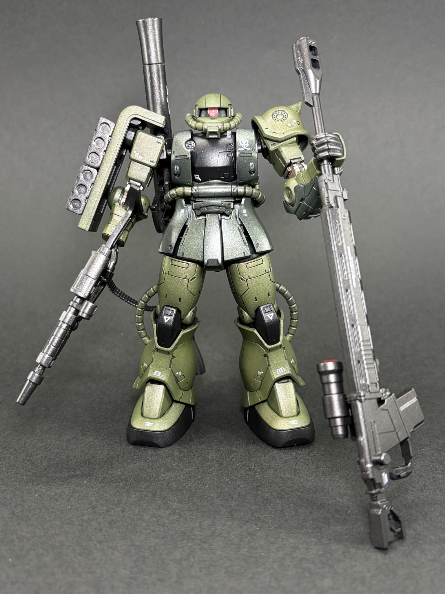 最初の投稿のシャアザクと少し遅れて作成していた(作り方がほとんど同じなのでシャアザクを参考にしながら)ノーマルのオリジンザクです。シャアザクもこのザクも中古屋でパチ組み部品欠品で売っていたものです。足りない部品をやりくりしました。