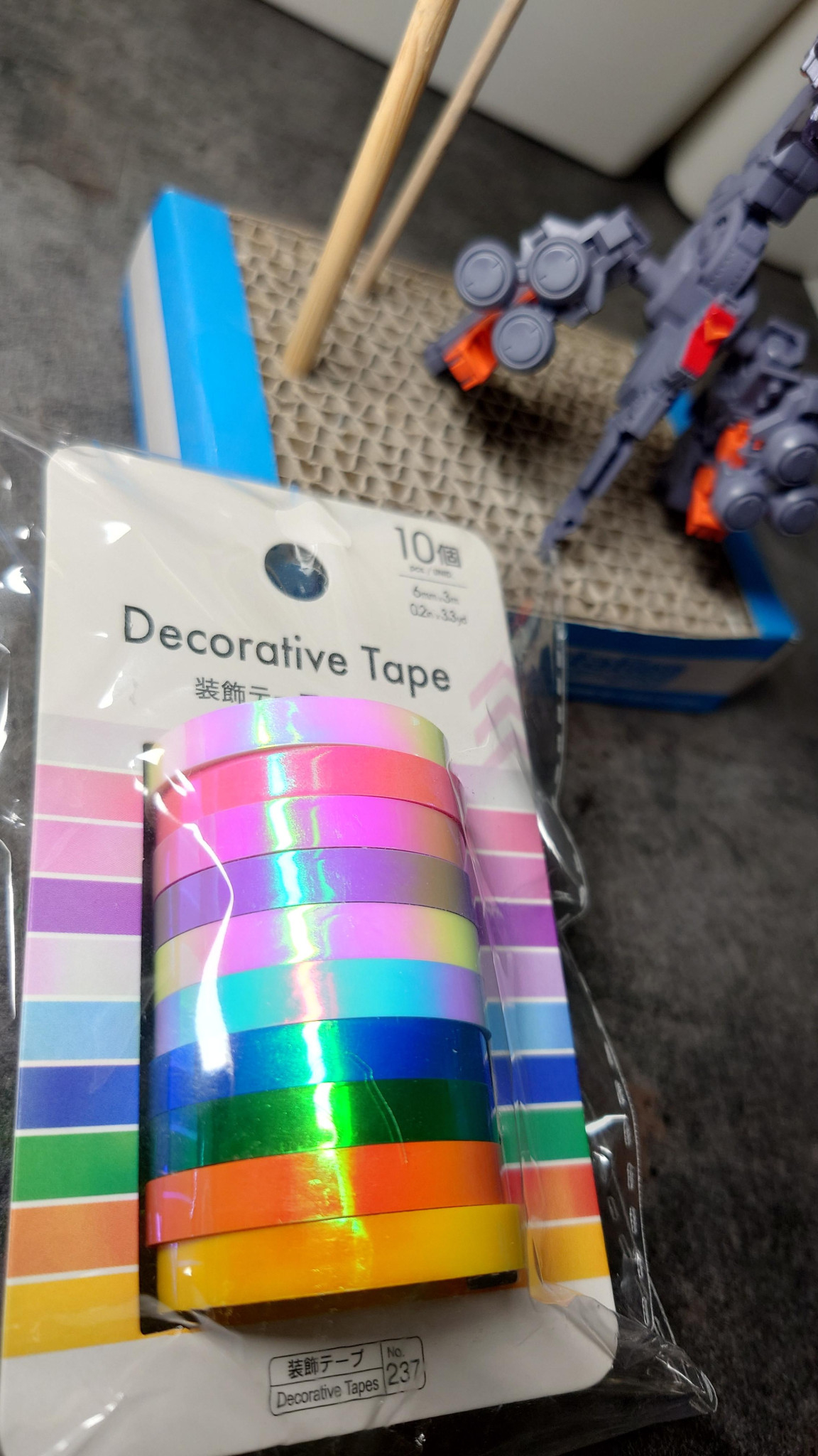ツインアイやセンサー類等は付属シールの余白部分のシルバーを同じ形に切出し、上からハイキューパーツさんのオーロラブルーシールまたは百均のホログラム装飾テープを重ね貼りしています。
