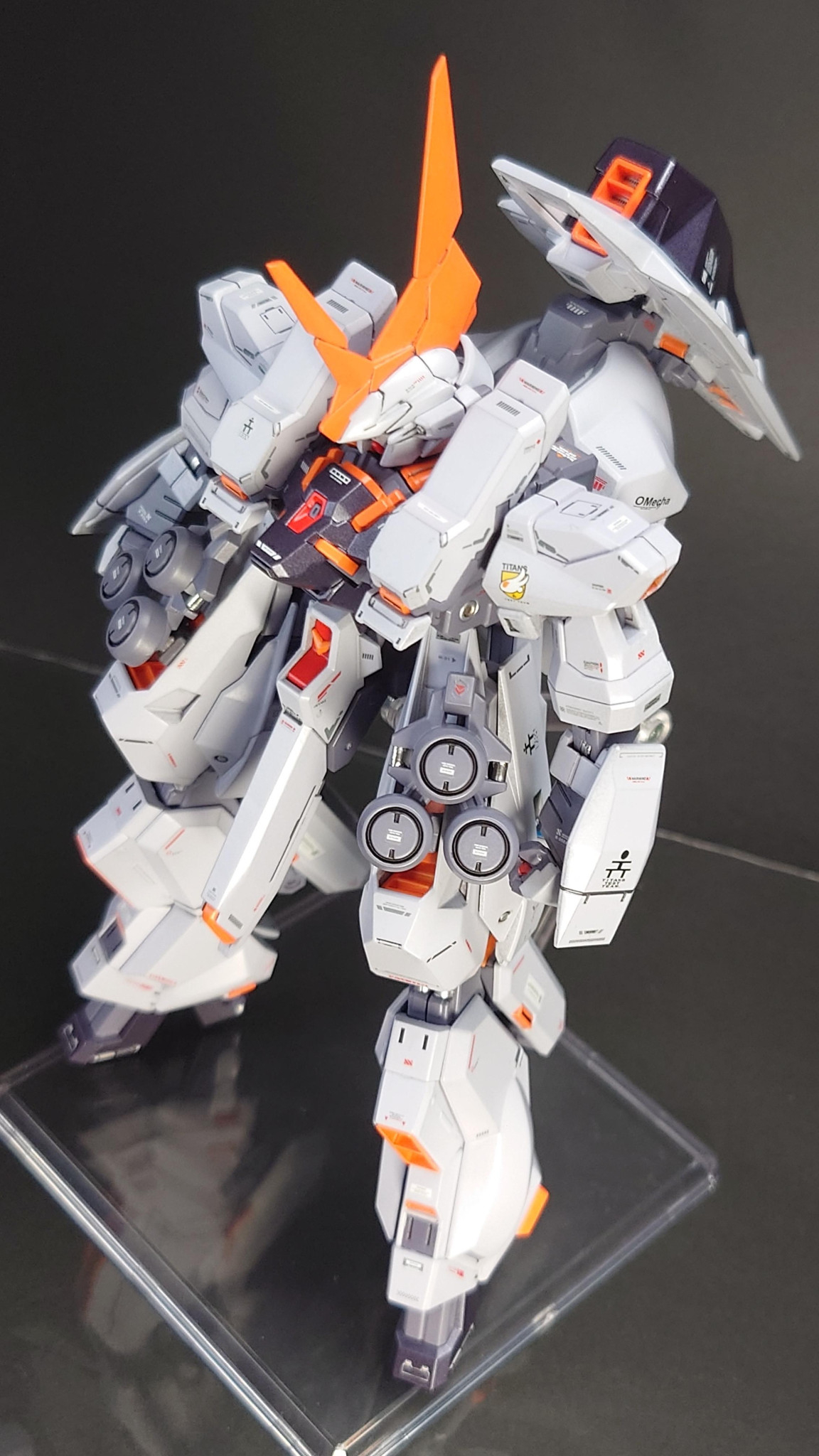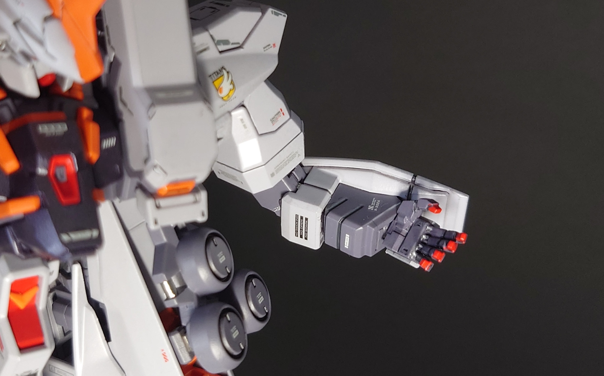 カラーリングをティターンズ テスト・カラー(白バーザムⅱ)にした以外は特別凝ったことはしていませんが、コーションデカールを多めに貼って最終的に自分好みの感じに仕上がりました🍵😌